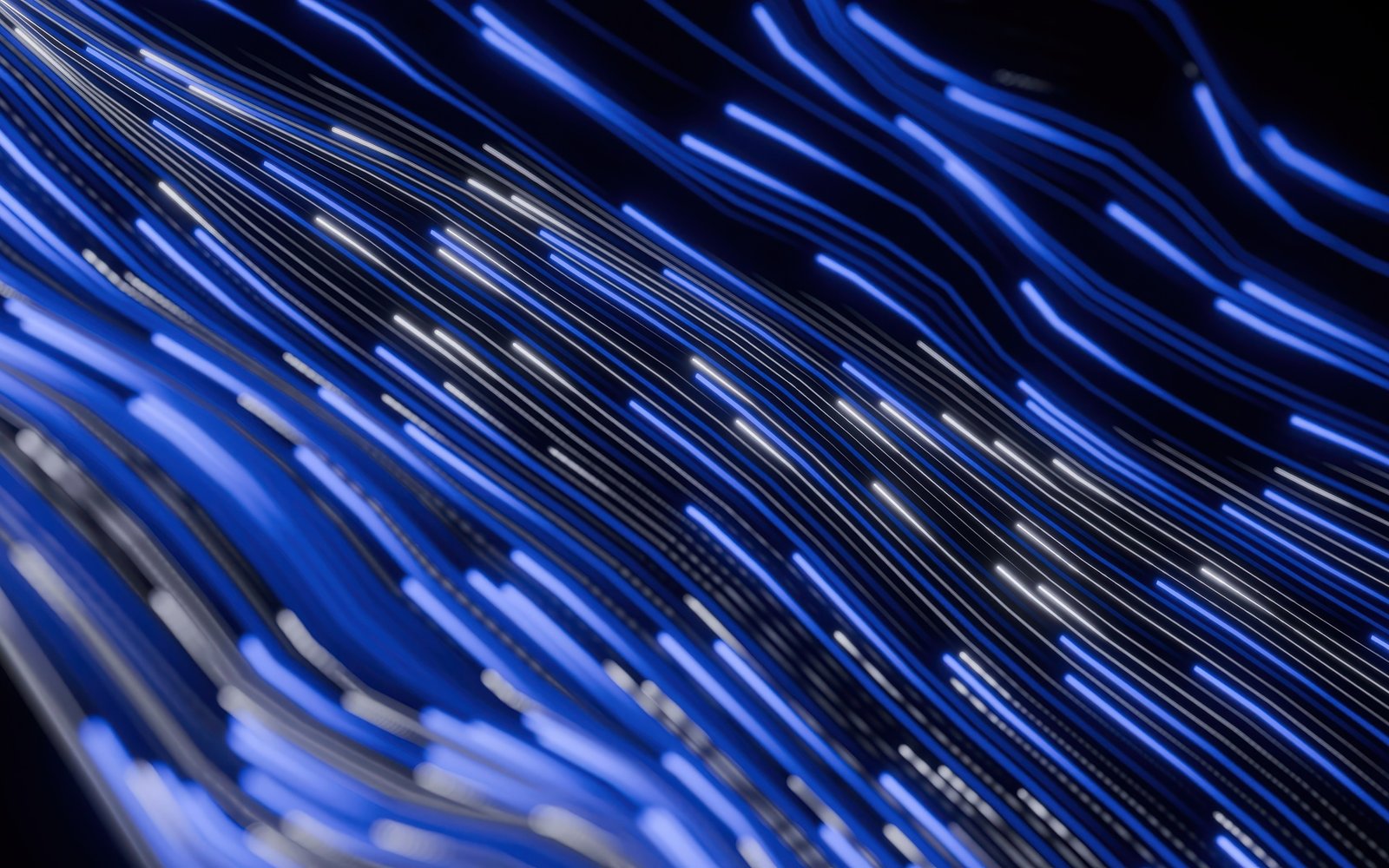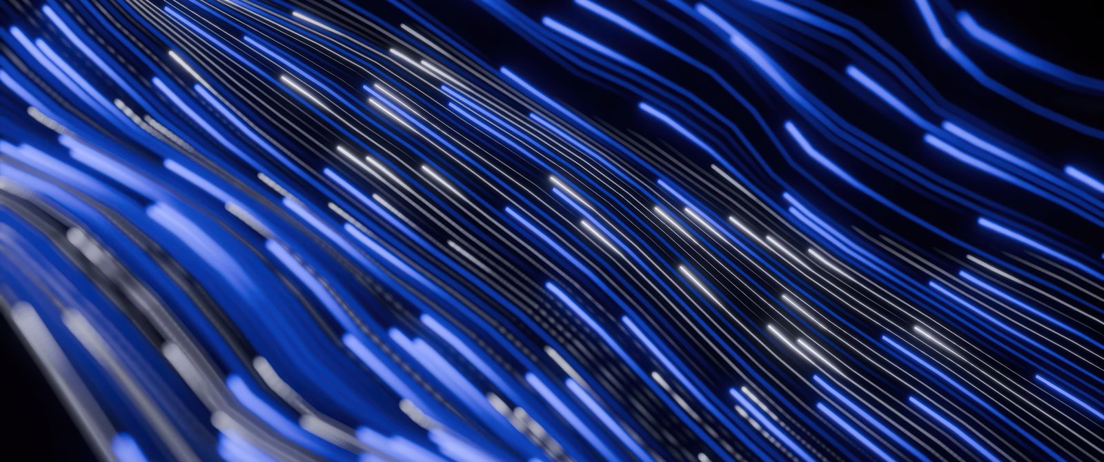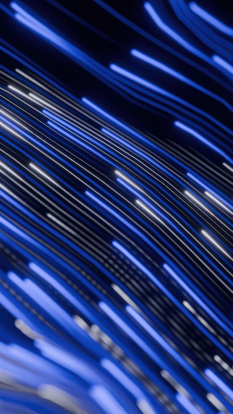 Streams of electric blue and white light race across a dark void, bending and flowing like digital currents in a high-speed data stream. The sleek lines twist and ripple with fluid motion, creating a sense of depth and velocity that feels almost alive. Subtle gradients and luminous highlights give the illusion of endless movement, as if you’re watching pure energy travel through a cybernetic dimension.