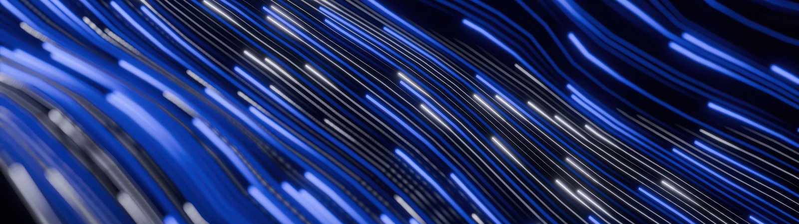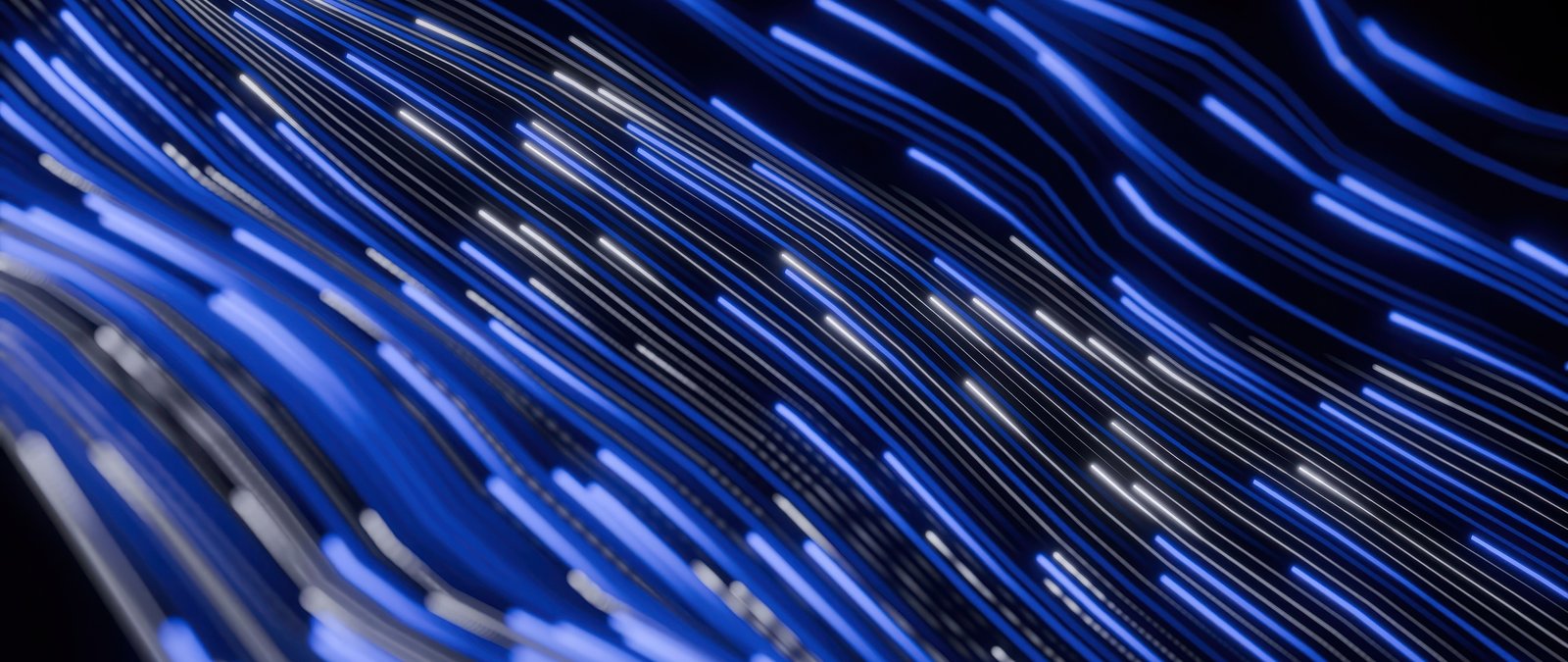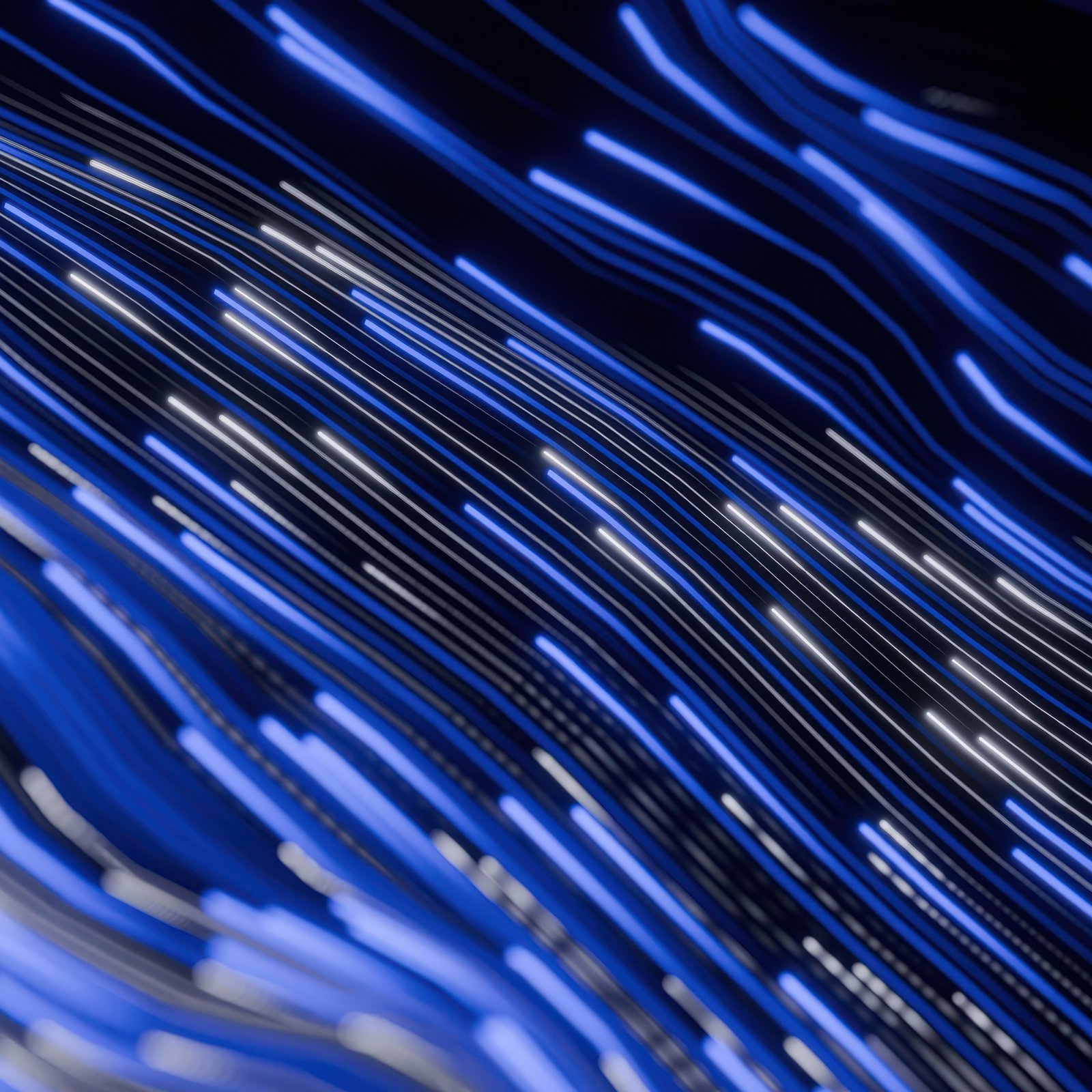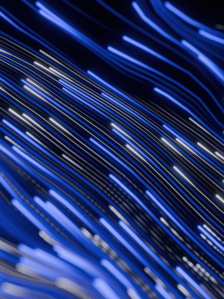 Streams of electric blue and white light race across a dark void, bending and flowing like digital currents in a high-speed data stream. The sleek lines twist and ripple with fluid motion, creating a sense of depth and velocity that feels almost alive. Subtle gradients and luminous highlights give the illusion of endless movement, as if you’re watching pure energy travel through a cybernetic dimension.