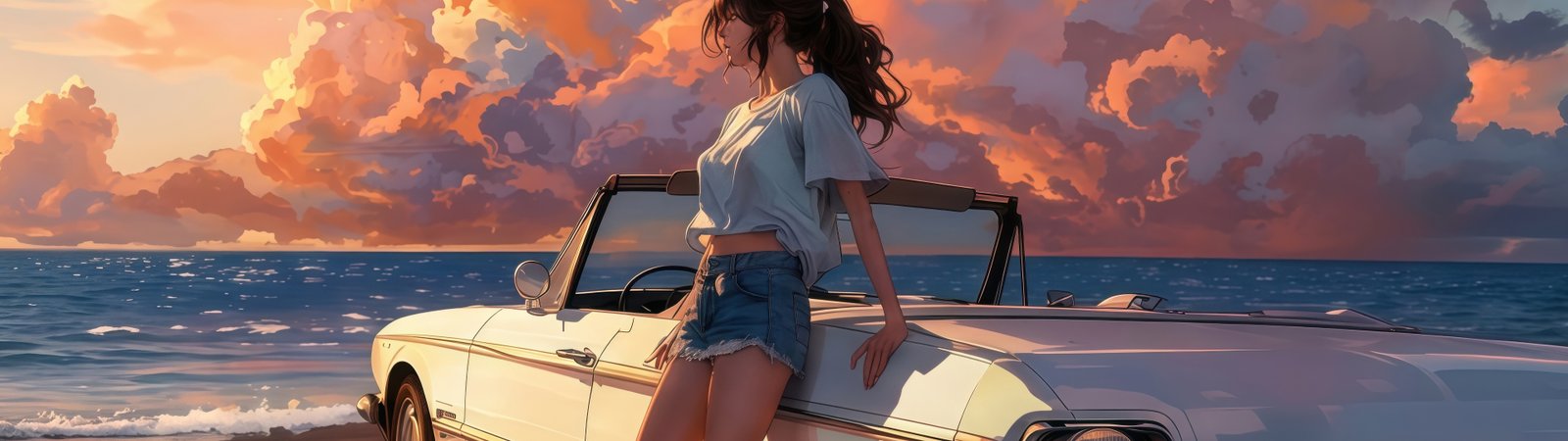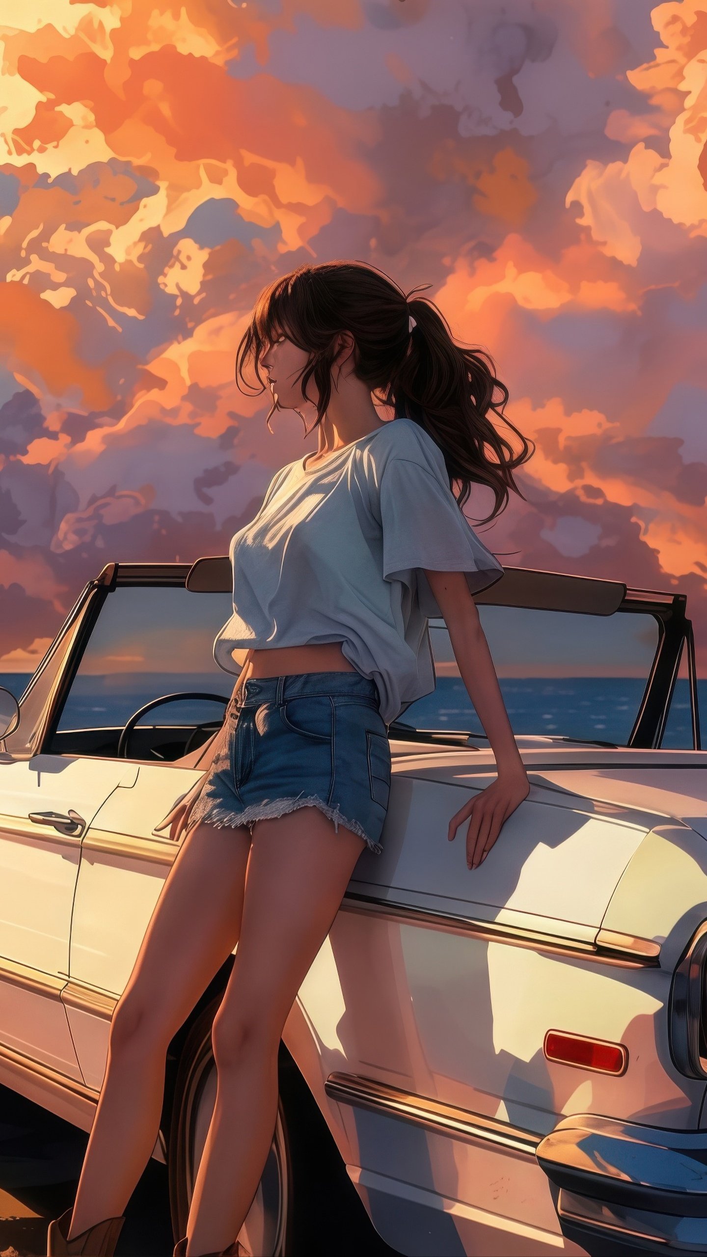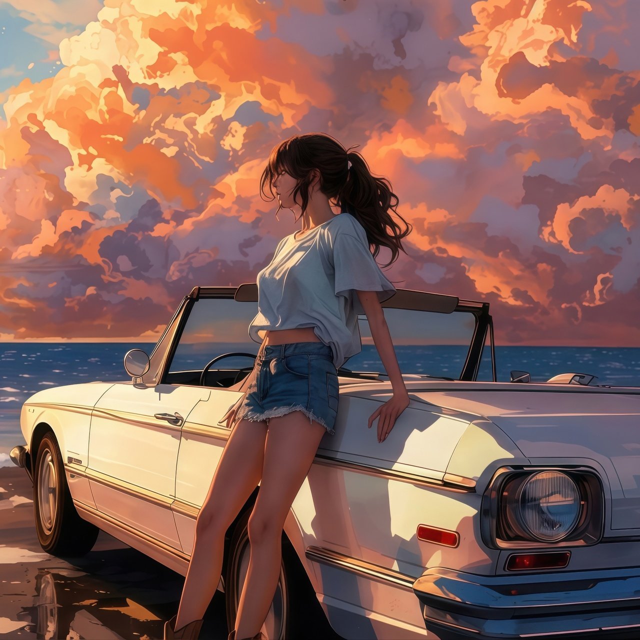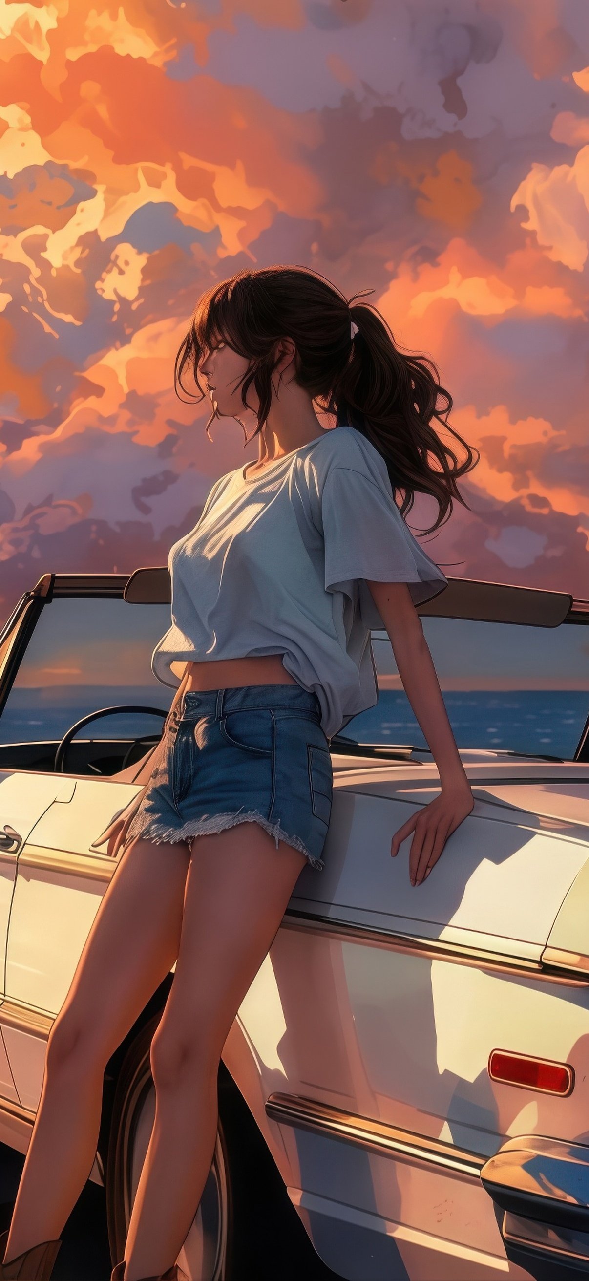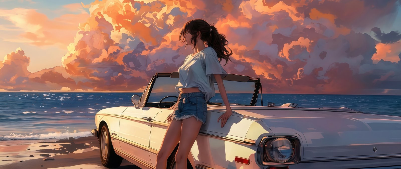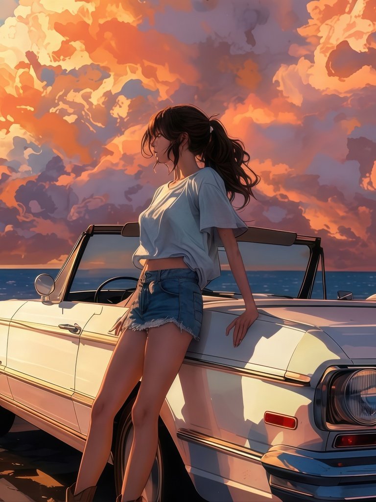 Bathed in warm golden light, the scene captures a serene seaside escape as towering sunset clouds paint the sky in shades of orange and pink. A vintage convertible rests quietly by the shore, its glossy surface reflecting the fading daylight, while gentle waves roll in with rhythmic calm. The girl leans effortlessly against the car, her hair swaying in the ocean breeze, embodying a perfect balance of freedom, stillness, and quiet reflection.