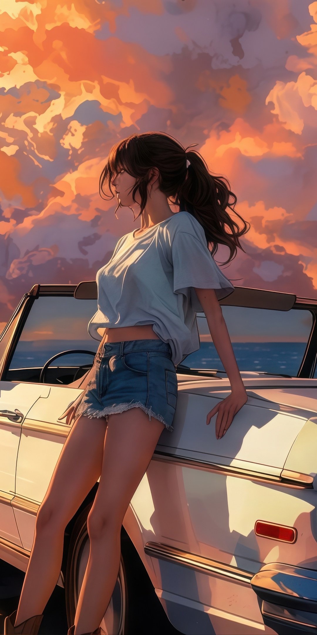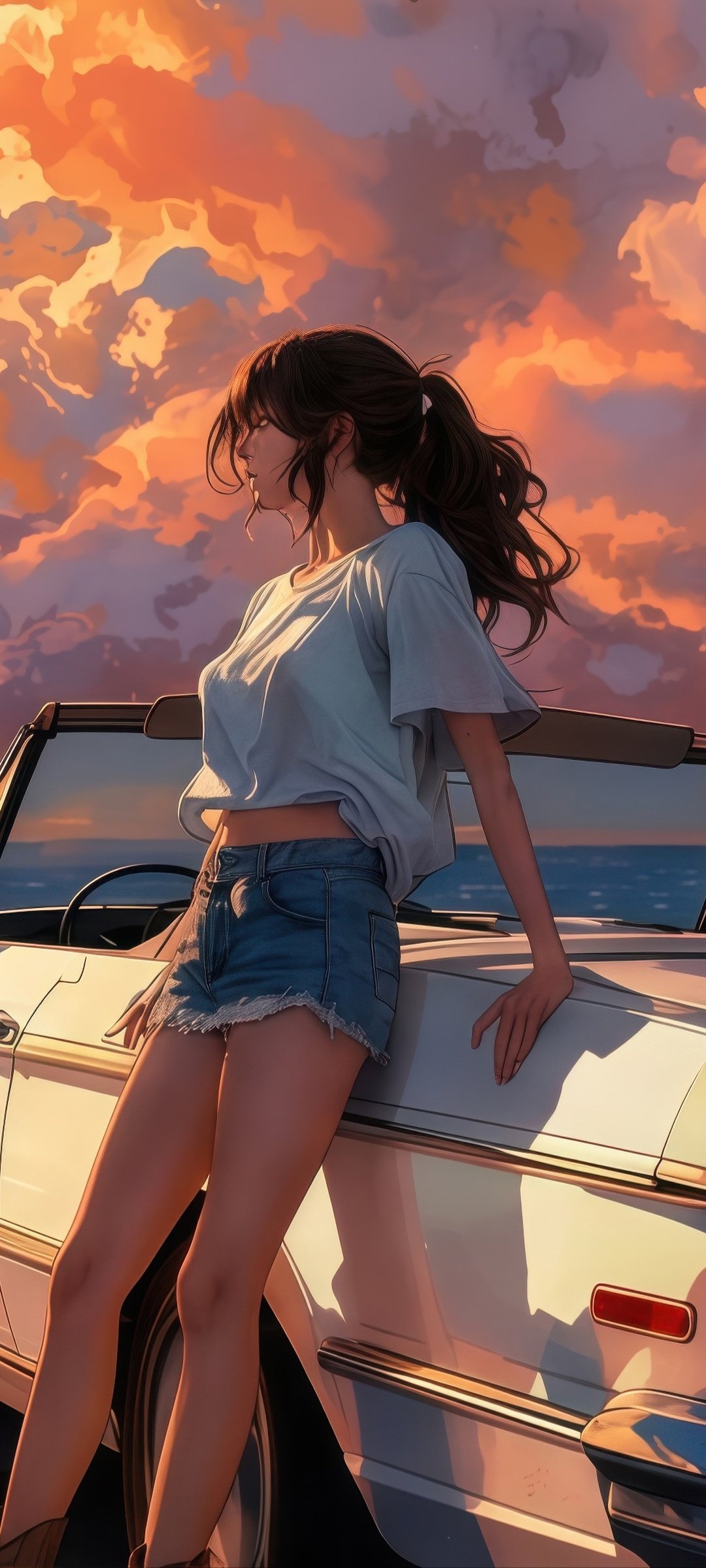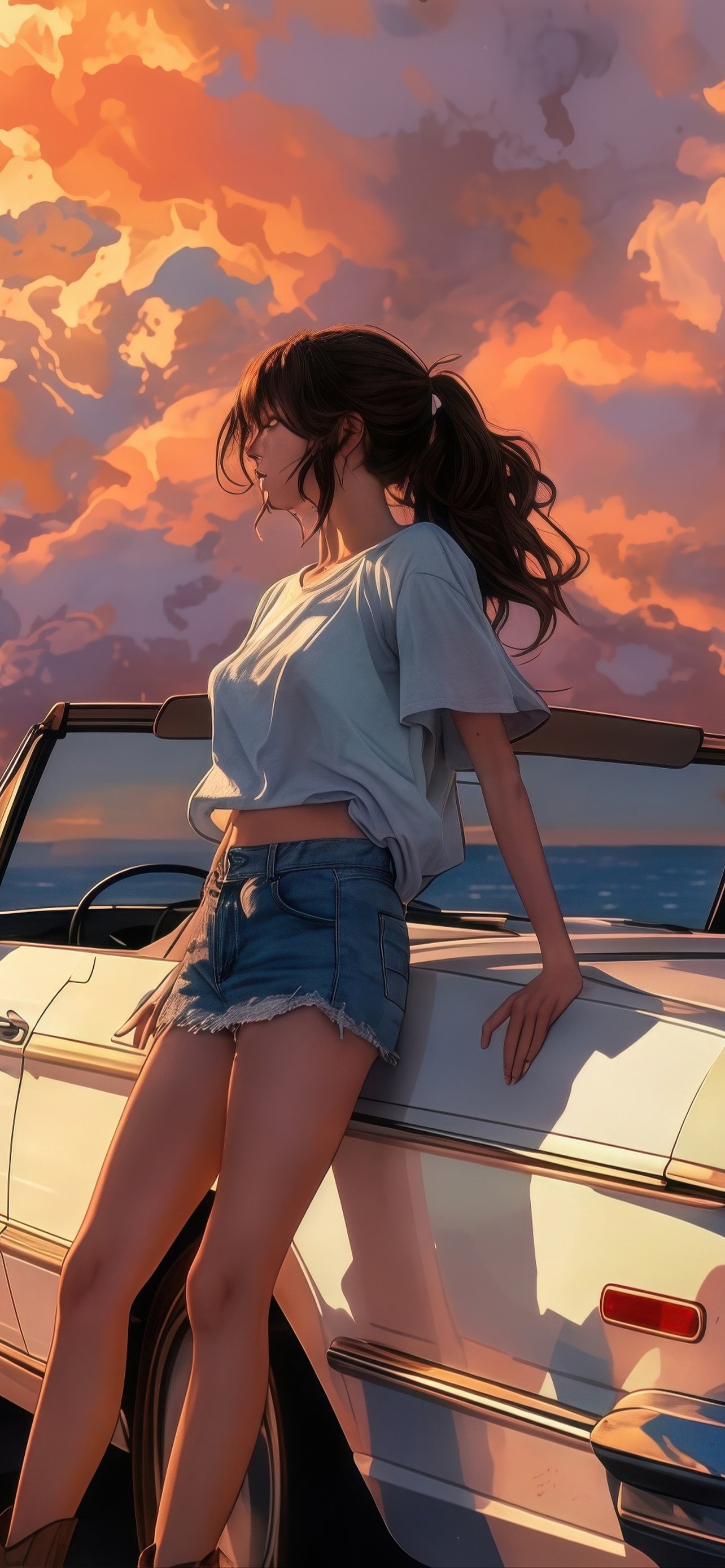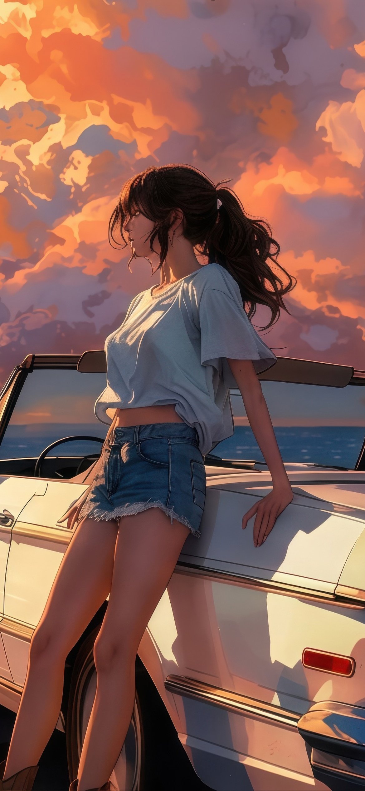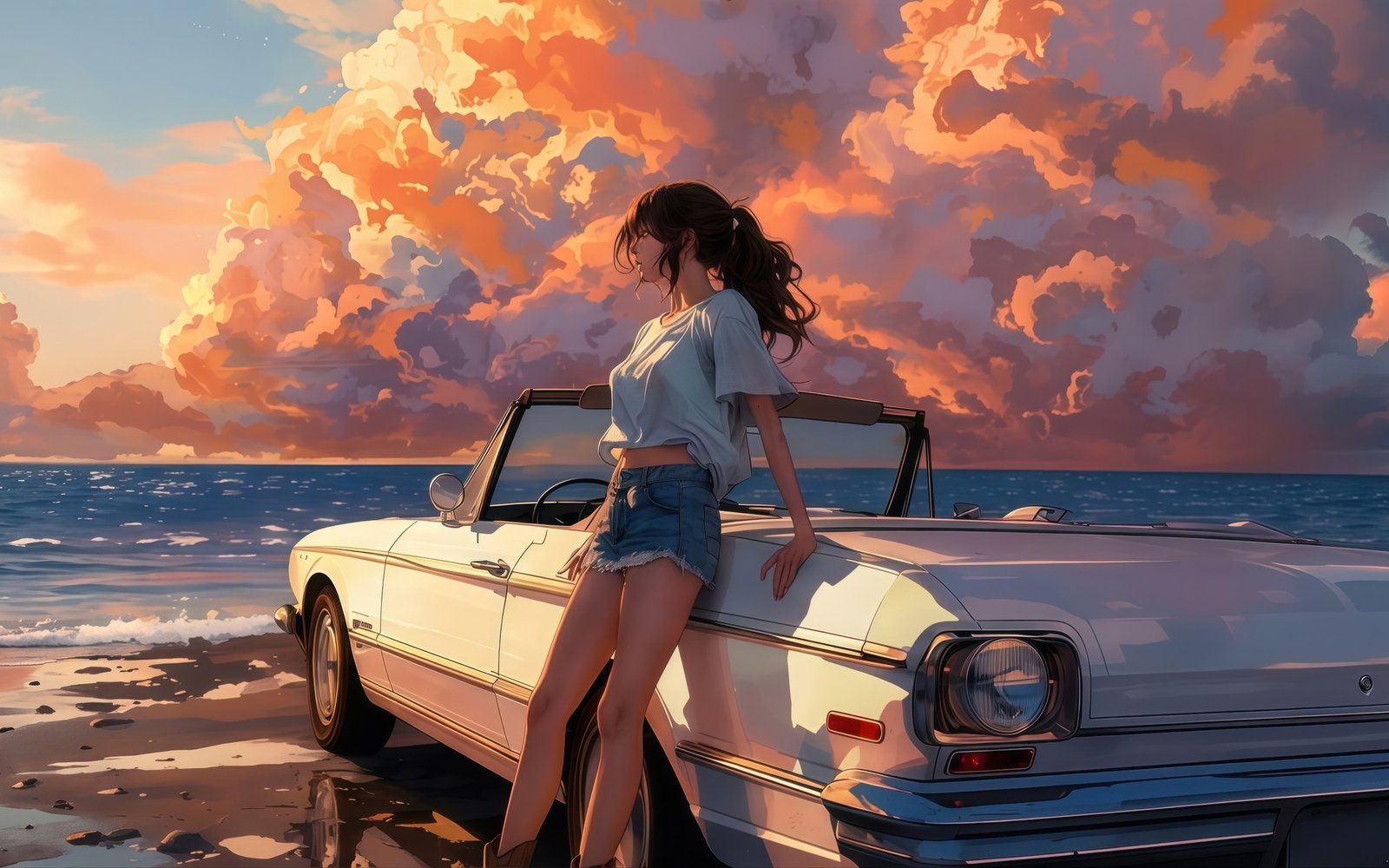 Bathed in warm golden light, the scene captures a serene seaside escape as towering sunset clouds paint the sky in shades of orange and pink. A vintage convertible rests quietly by the shore, its glossy surface reflecting the fading daylight, while gentle waves roll in with rhythmic calm. The girl leans effortlessly against the car, her hair swaying in the ocean breeze, embodying a perfect balance of freedom, stillness, and quiet reflection.