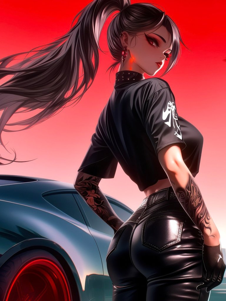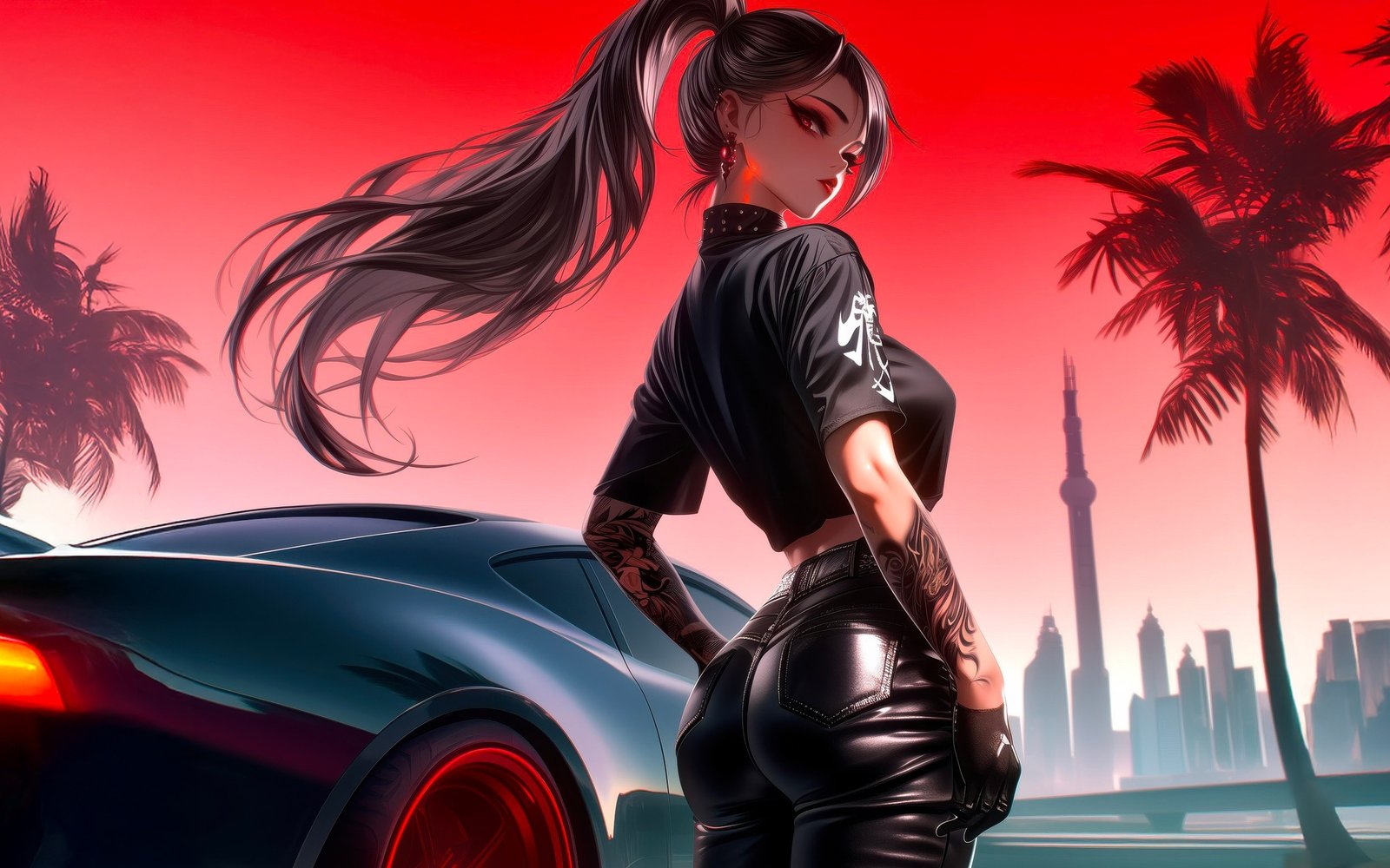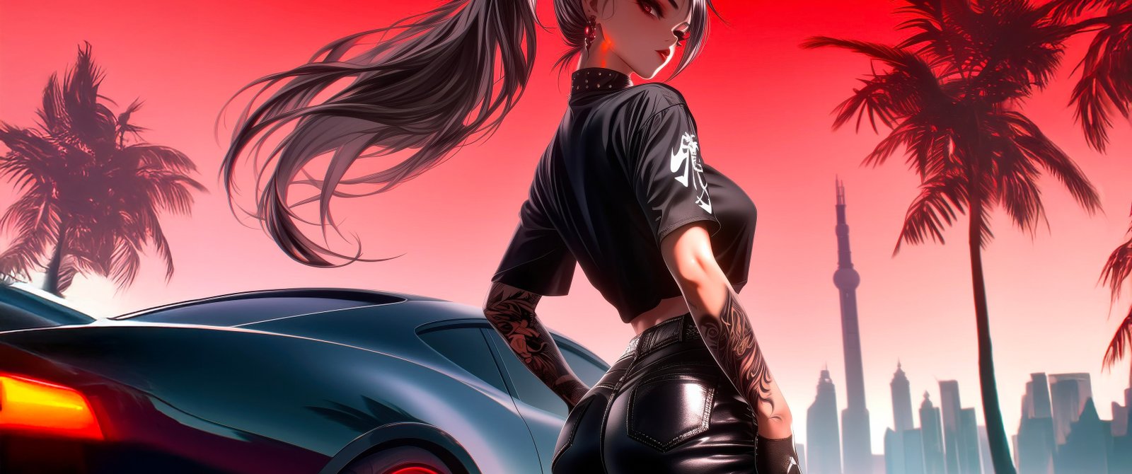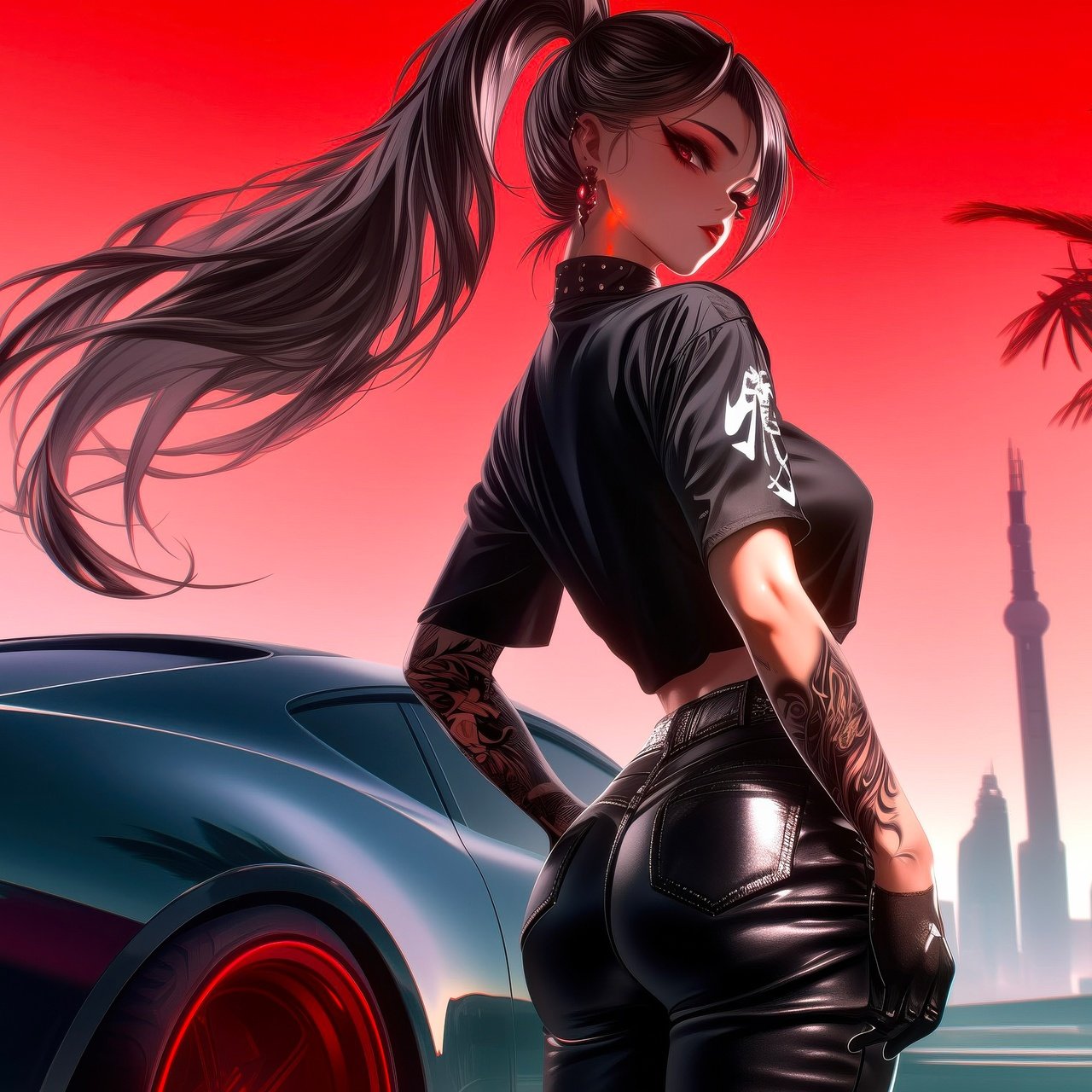 A confident anime girl stands beside a glossy neon-lit car, her long ponytail flowing through the warm night air as the city skyline glows behind her. Palm trees silhouette against a vibrant red sky, while distant skyscrapers and lights create a futuristic urban vibe. Her sleek outfit, tattoos, and bold stance radiate personality, turning the entire scene into a perfect blend of street culture and cyberpunk elegance.