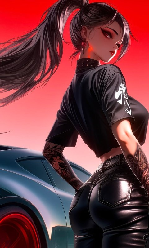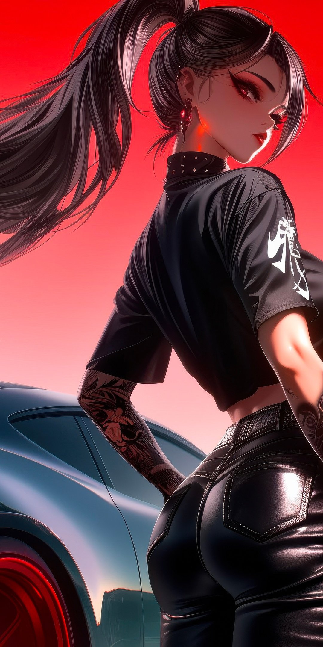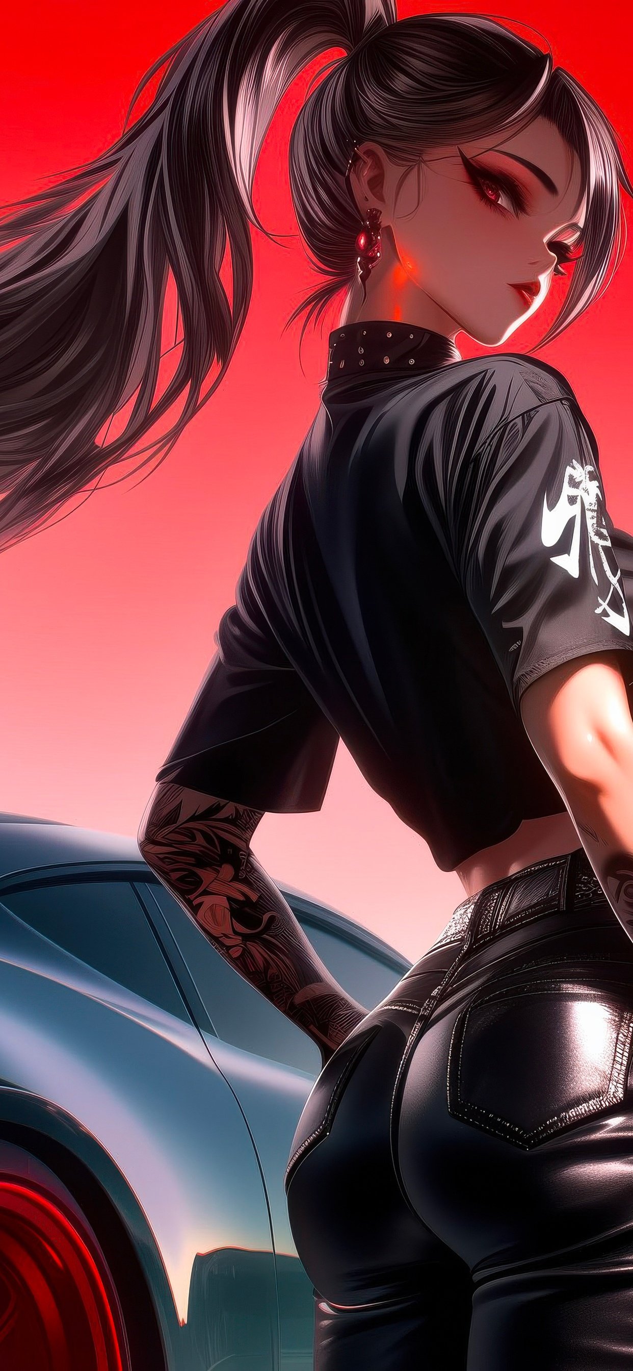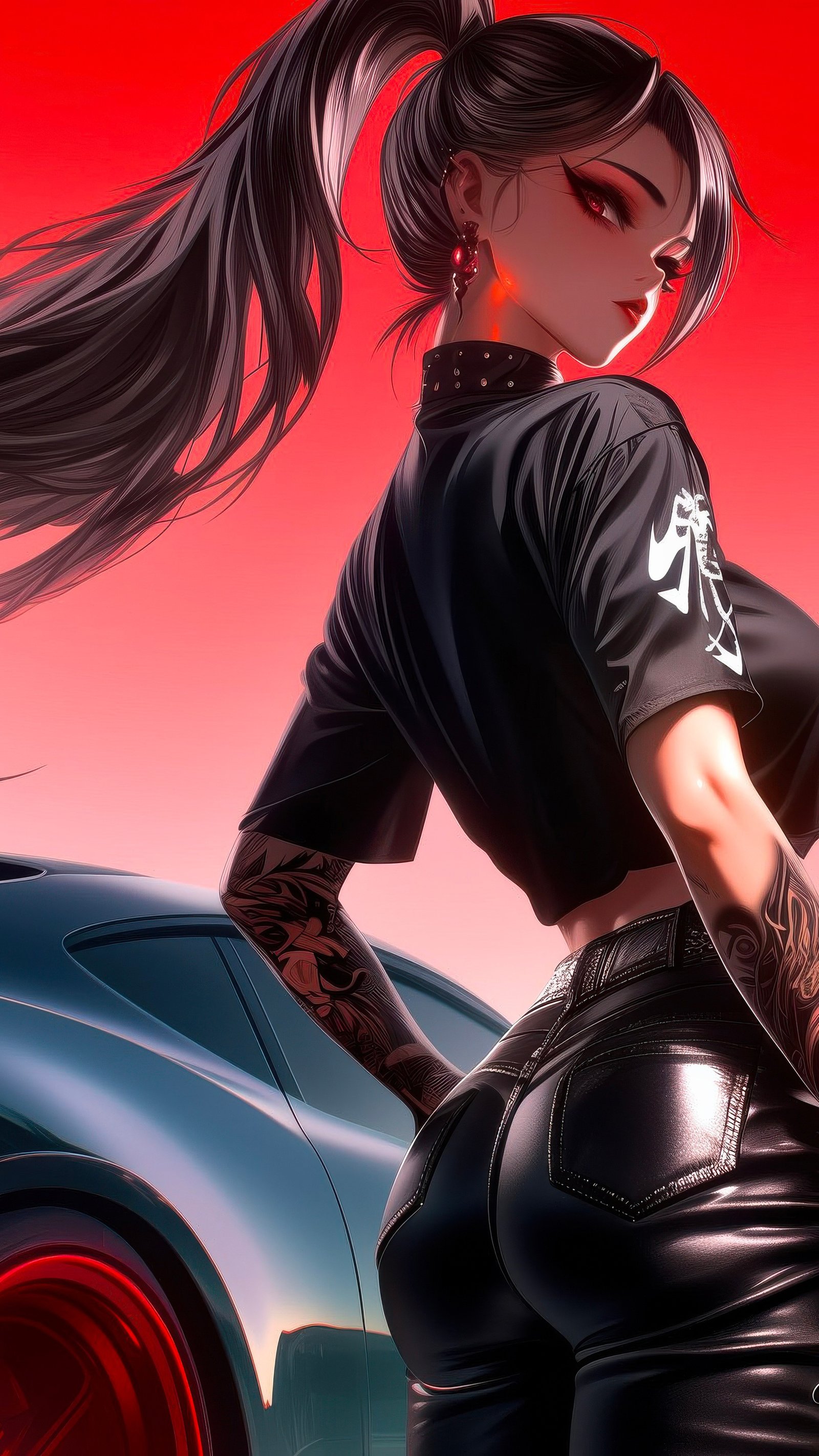 A confident anime girl stands beside a glossy neon-lit car, her long ponytail flowing through the warm night air as the city skyline glows behind her. Palm trees silhouette against a vibrant red sky, while distant skyscrapers and lights create a futuristic urban vibe. Her sleek outfit, tattoos, and bold stance radiate personality, turning the entire scene into a perfect blend of street culture and cyberpunk elegance.