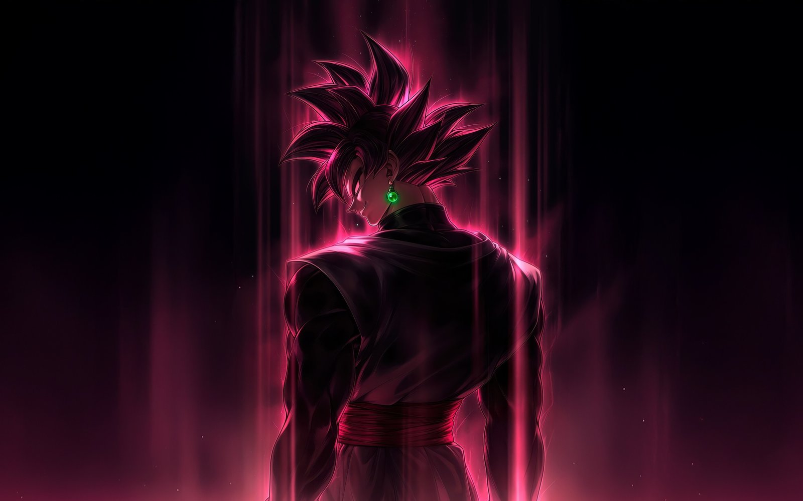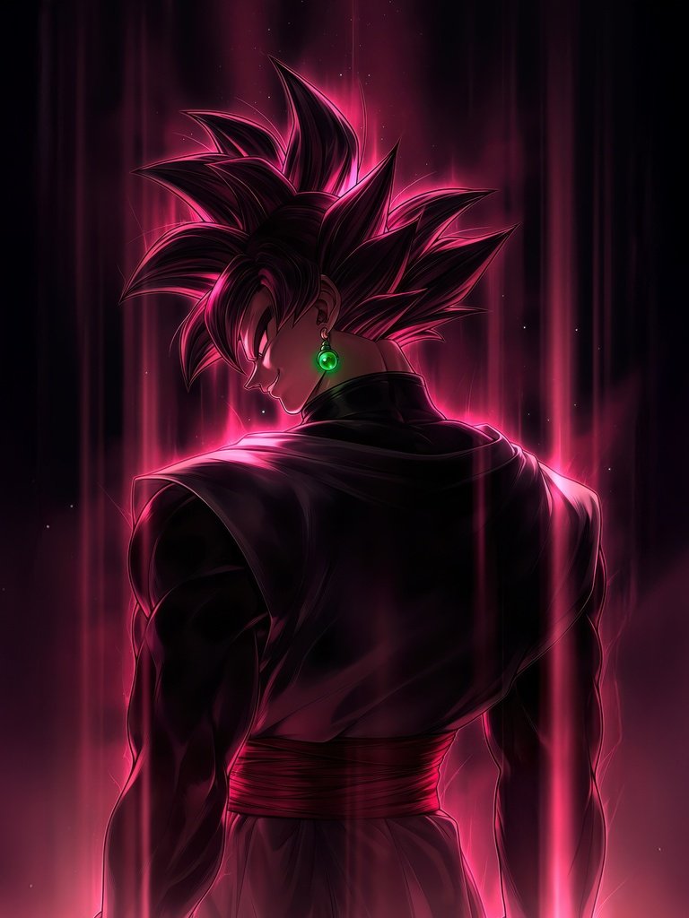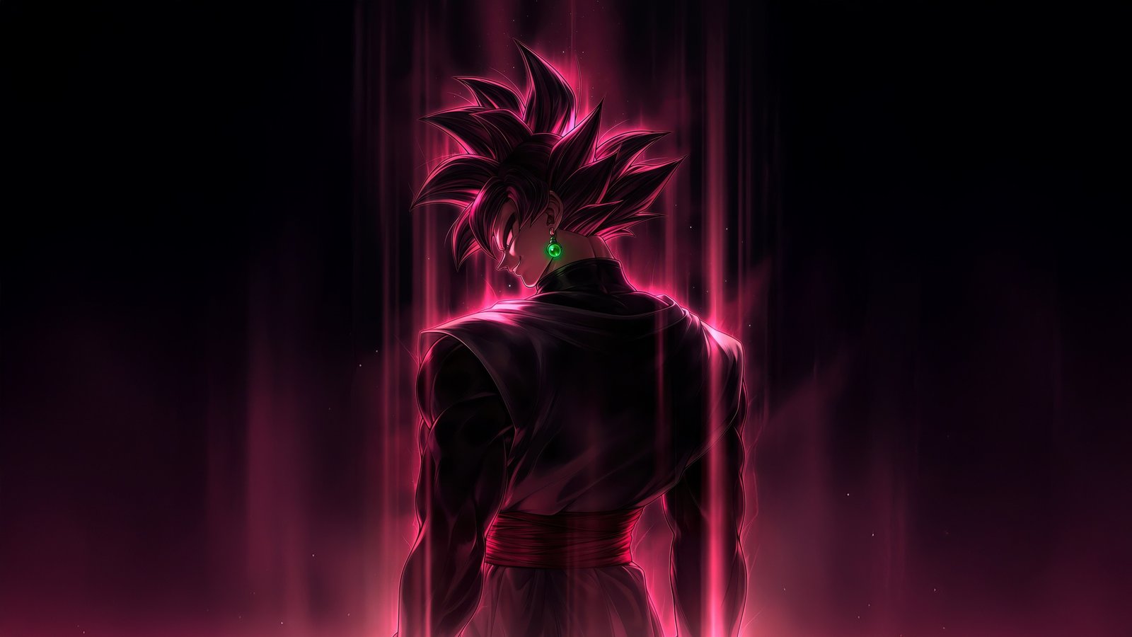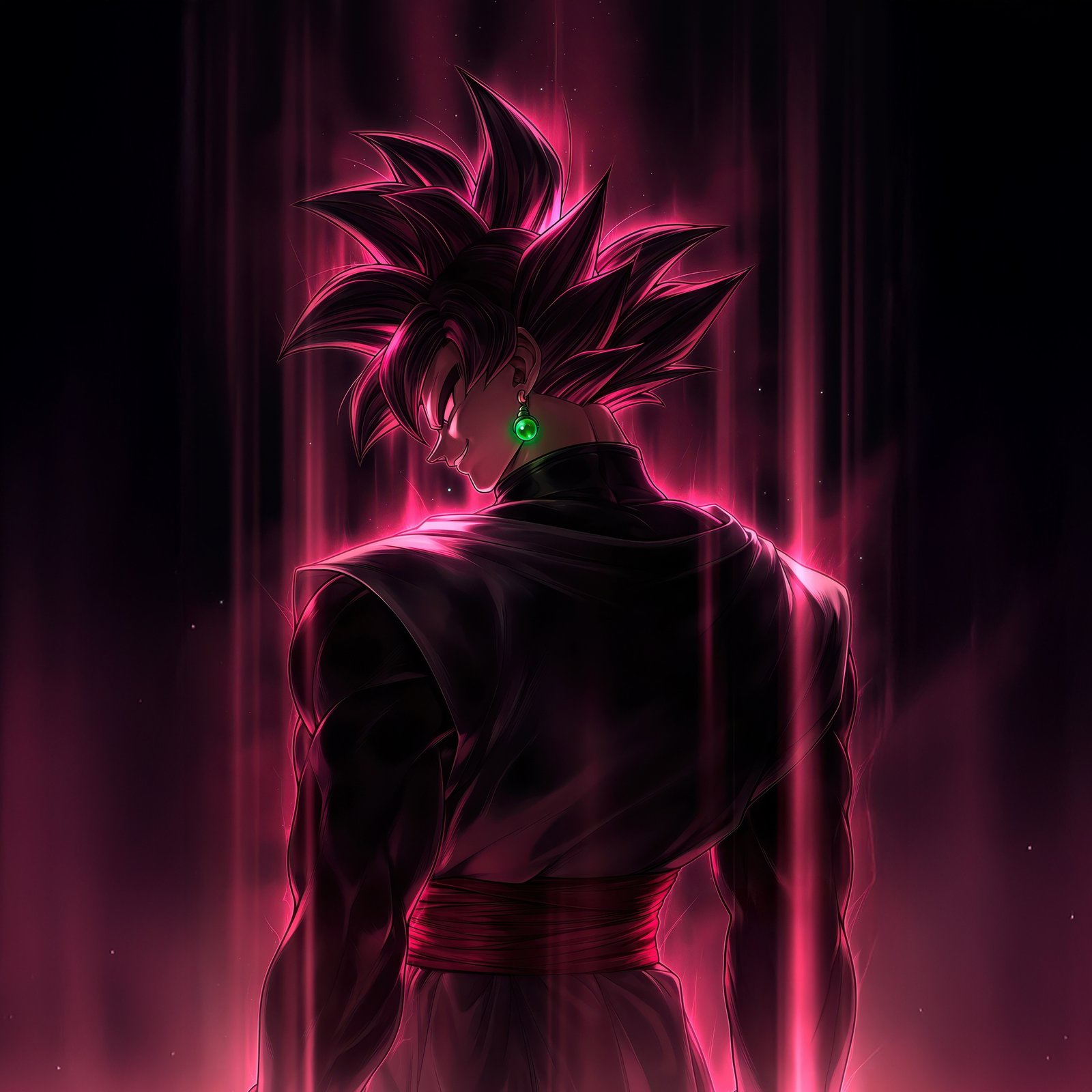 Bathed in dark pink light, his figure glows with an eerie intensity as streaks of energy fall like divine wrath around him. The sharp silhouette, the piercing gaze, and the pulsating aura create a moment frozen between silence and destruction. Every detail—from the flowing gi to the luminous energy—captures the essence of a villain who believes he is justice itself, standing at the edge of annihilation.
