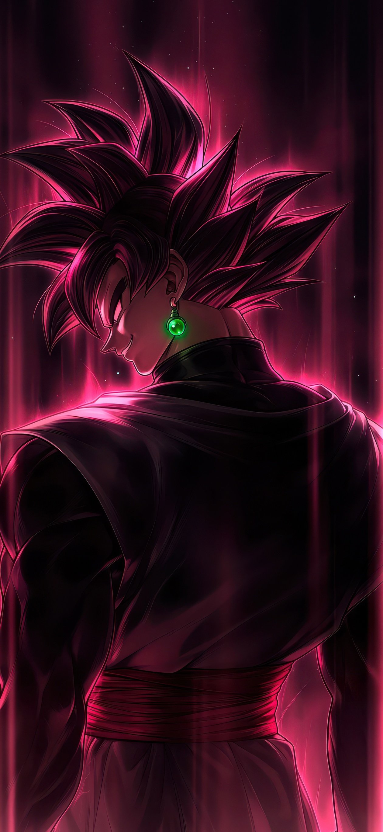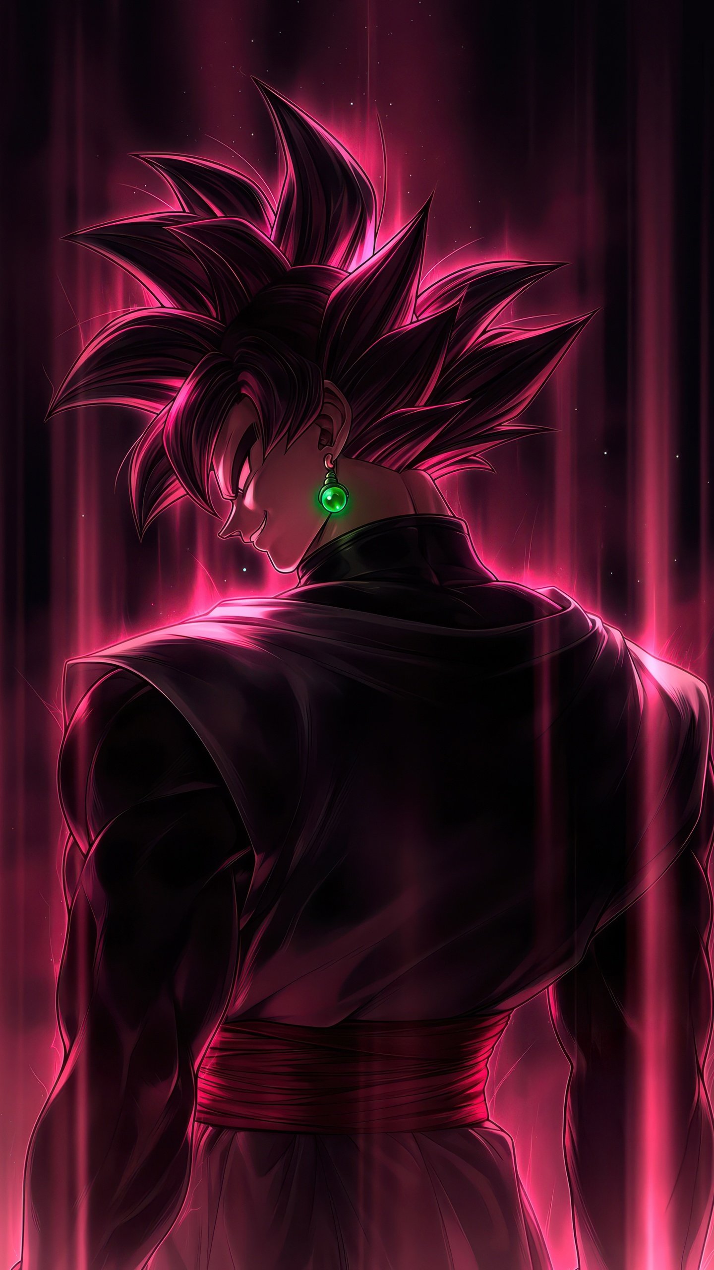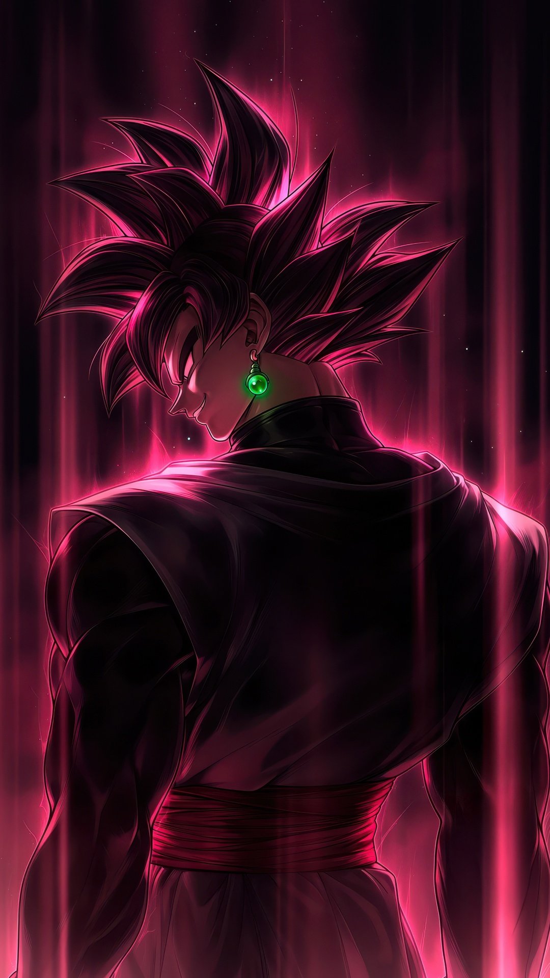Bathed in dark pink light, his figure glows with an eerie intensity as streaks of energy fall like divine wrath around him. The sharp silhouette, the piercing gaze, and the pulsating aura create a moment frozen between silence and destruction. Every detail—from the flowing gi to the luminous energy—captures the essence of a villain who believes he is justice itself, standing at the edge of annihilation.