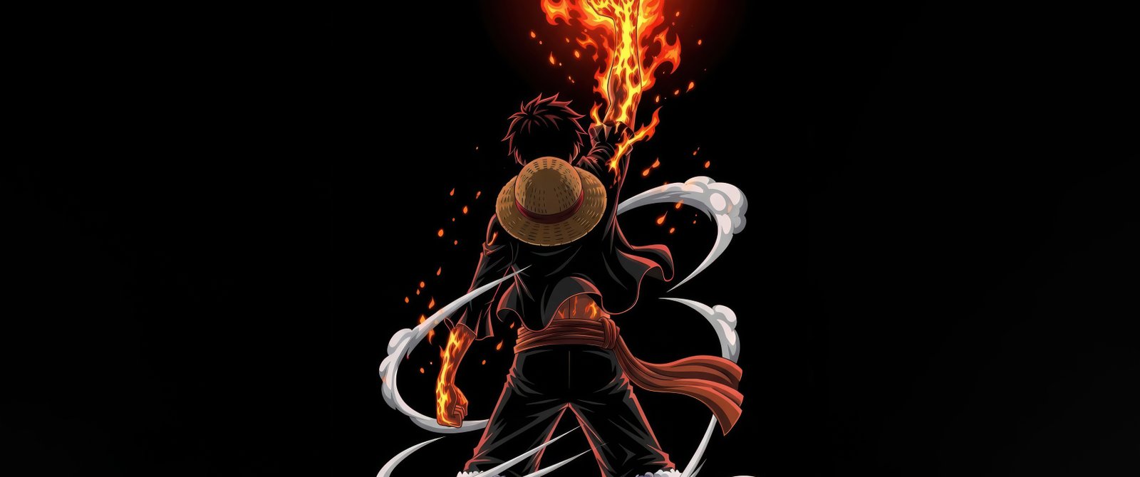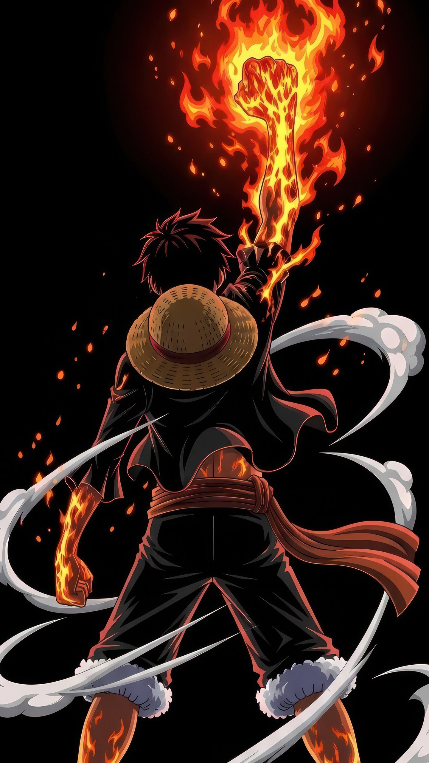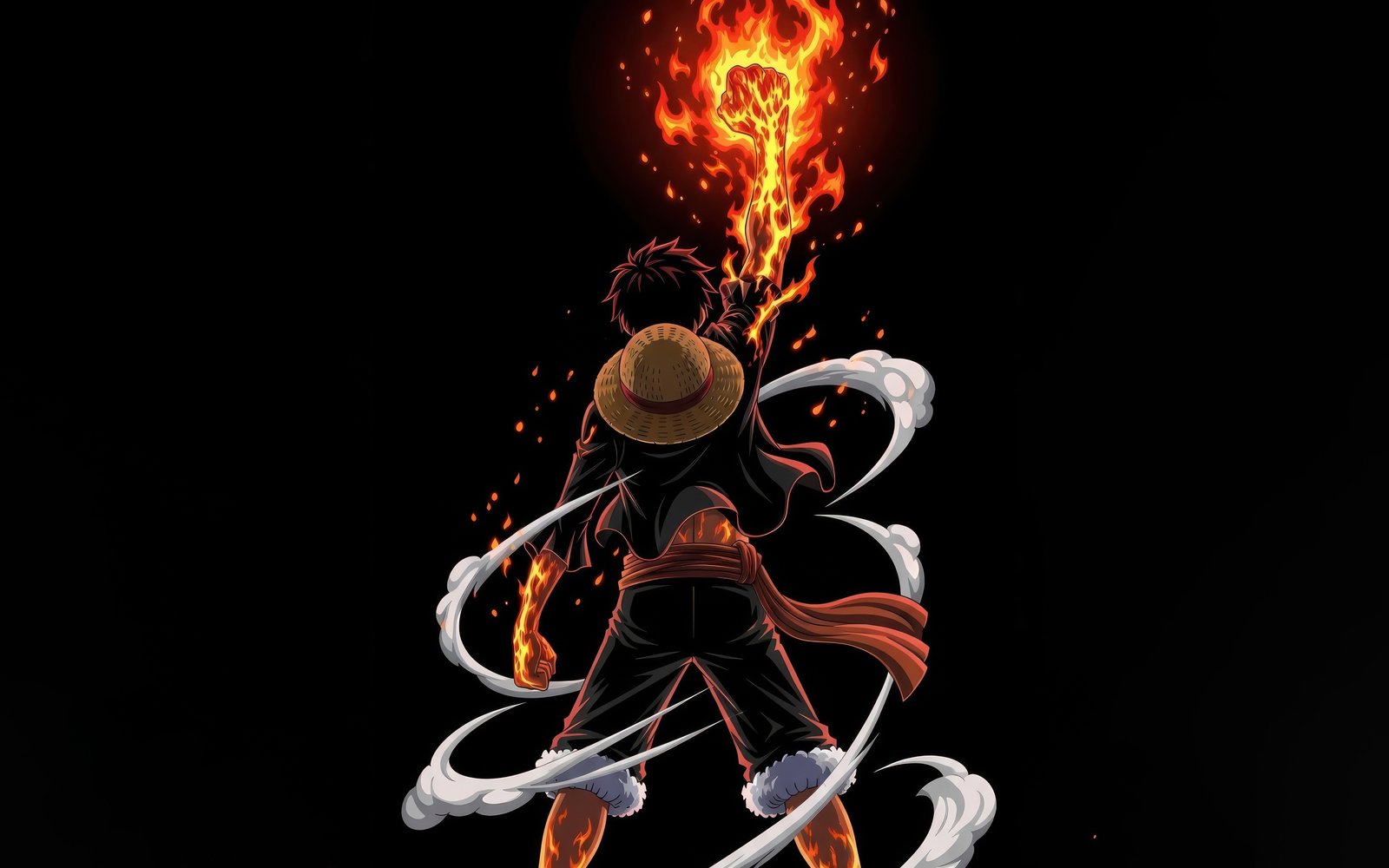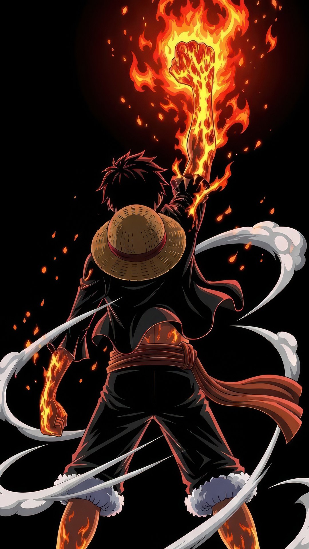 Standing with his back turned, Luffy raises his blazing fist high into the darkness, fire erupting upward like a raging inferno that lights up the entire scene. The iconic straw hat rests against his back as smoke-like energy coils around his body, adding motion and intensity. Every detail—from the glowing embers to the flowing sash—creates a sense of raw power building within him, as if he’s about to unleash an attack that could shake the world.