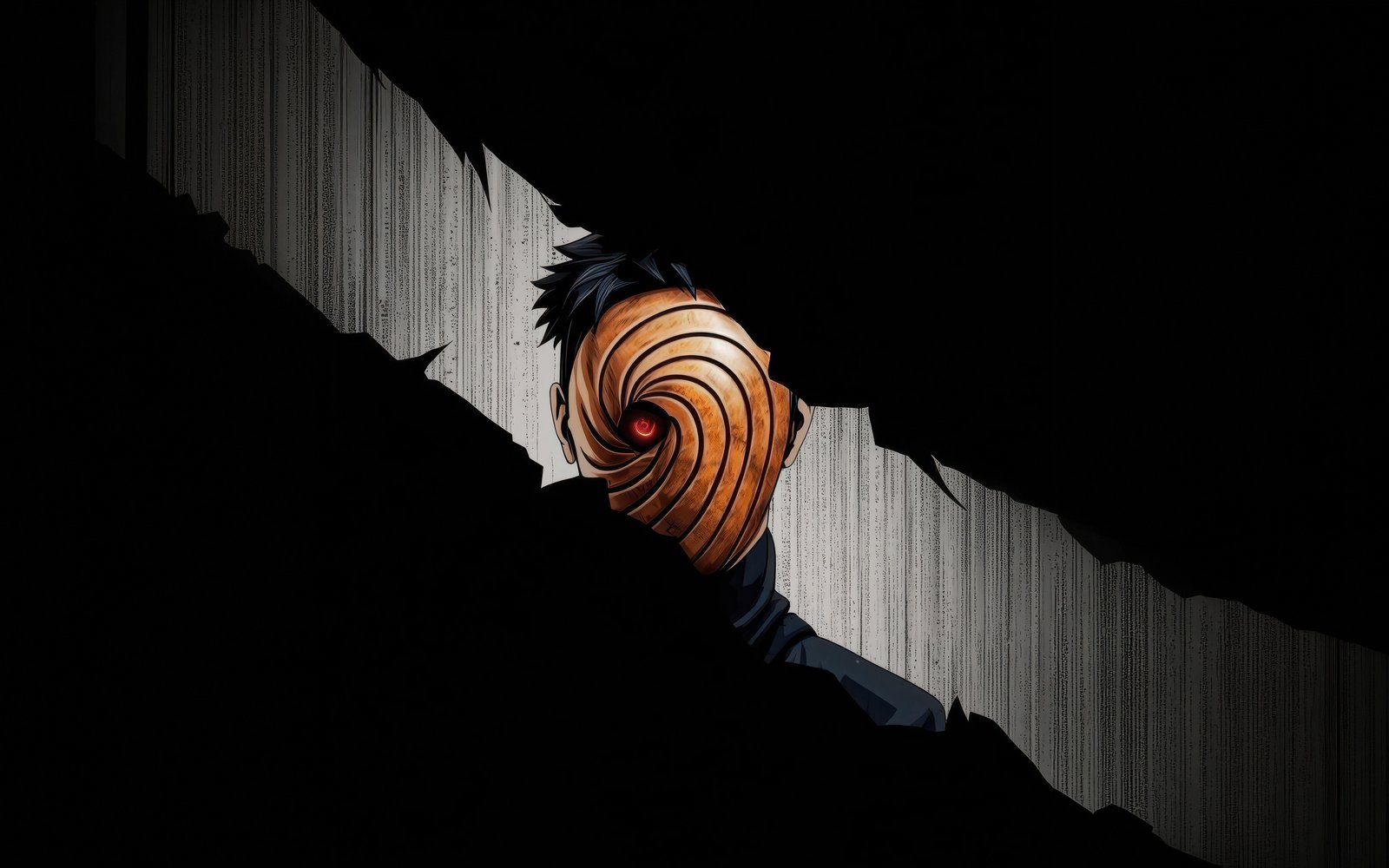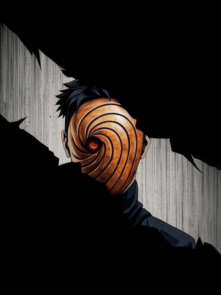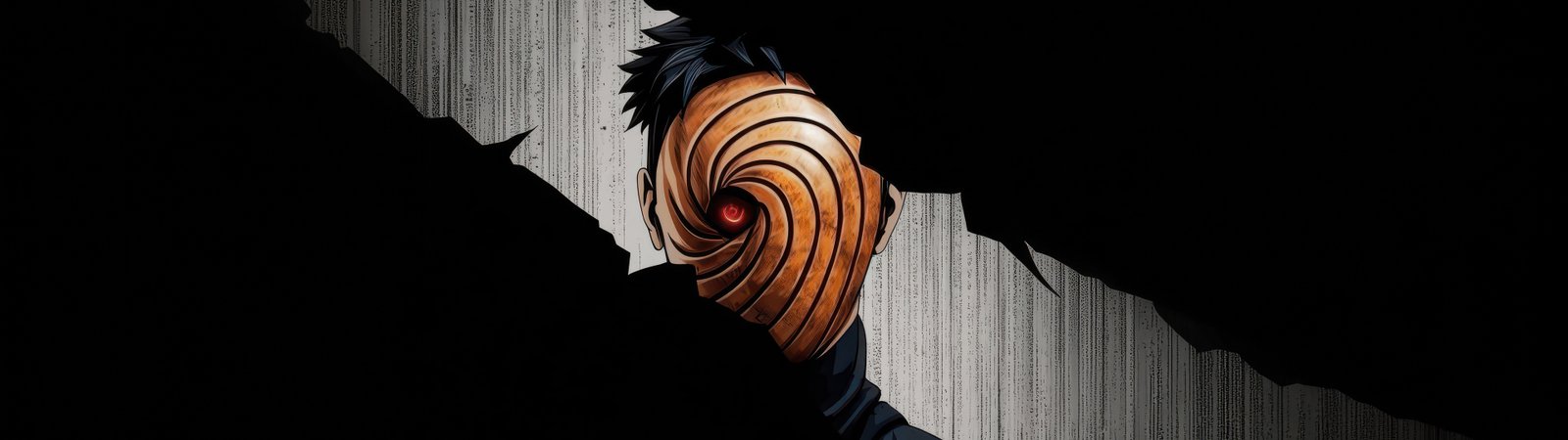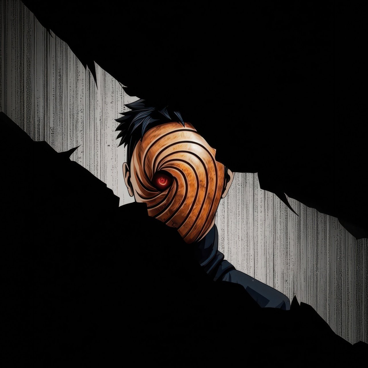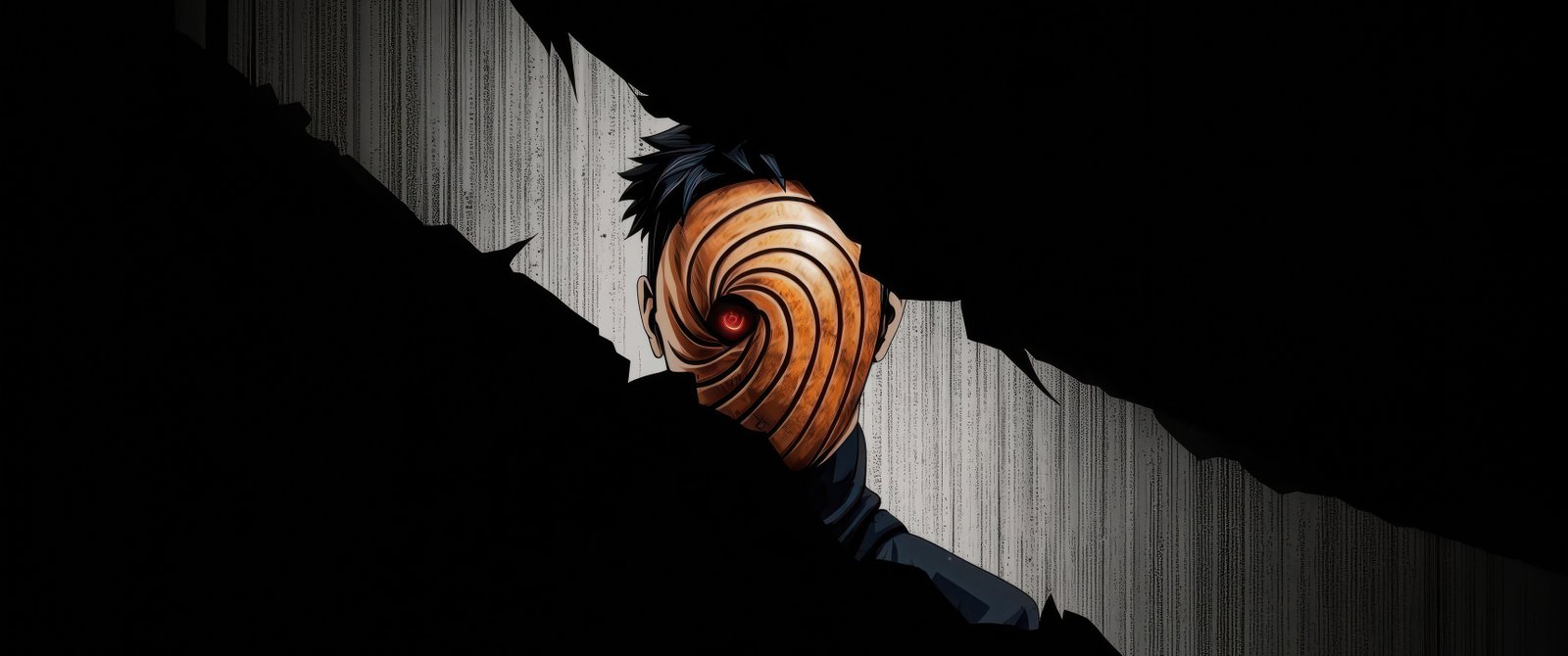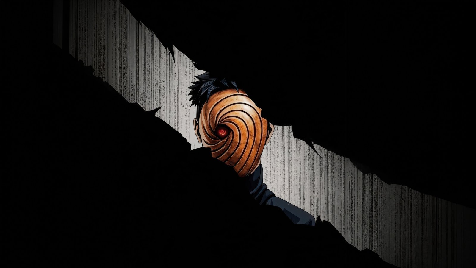 Hidden within deep shadows, Obito emerges through a fractured opening, his iconic spiral mask drawing all attention toward the glowing red Sharingan at its center. The sharp contrast between the pitch-black surroundings and the narrow strip of light creates a suspenseful, almost cinematic tension. Subtle textures in the background add depth, making it feel like you’re witnessing a secret presence watching from beyond the darkness.