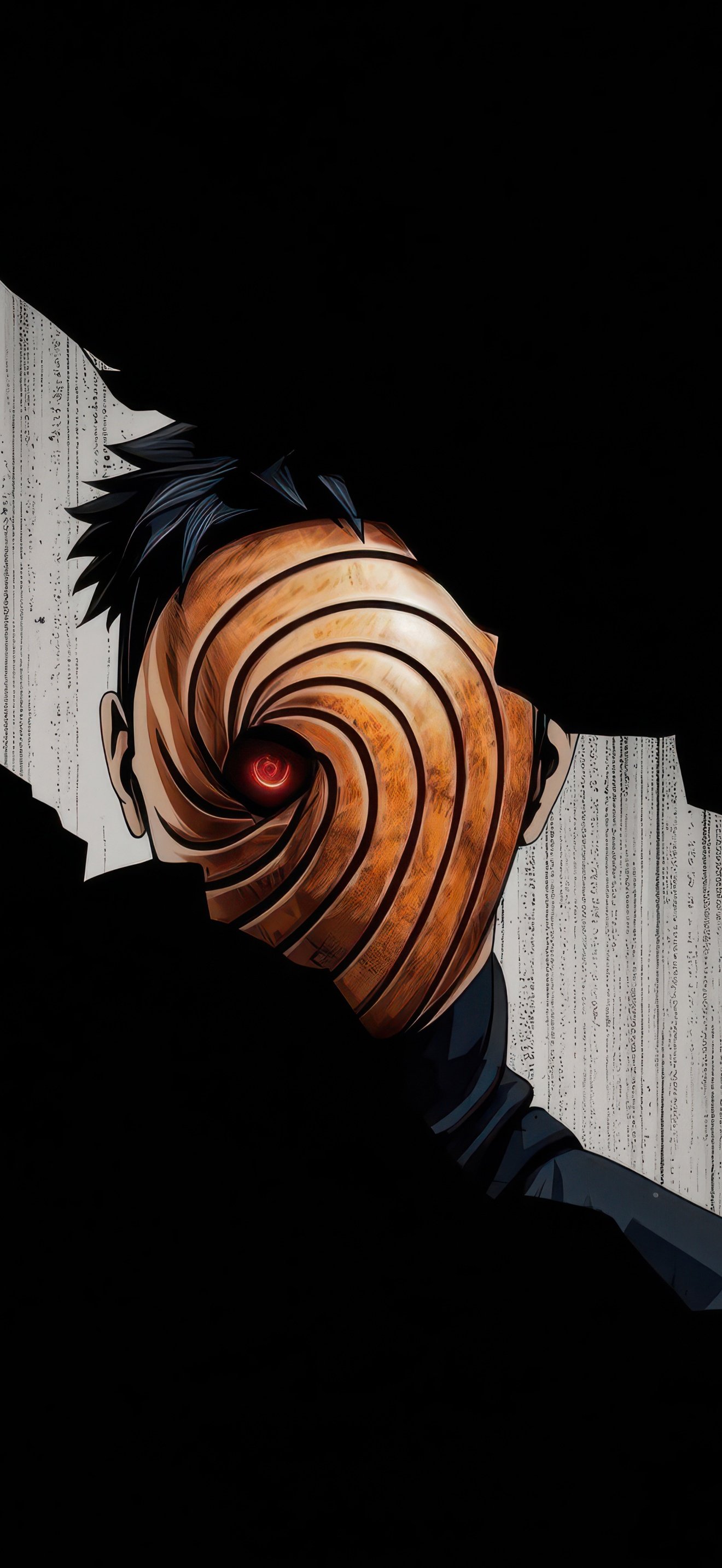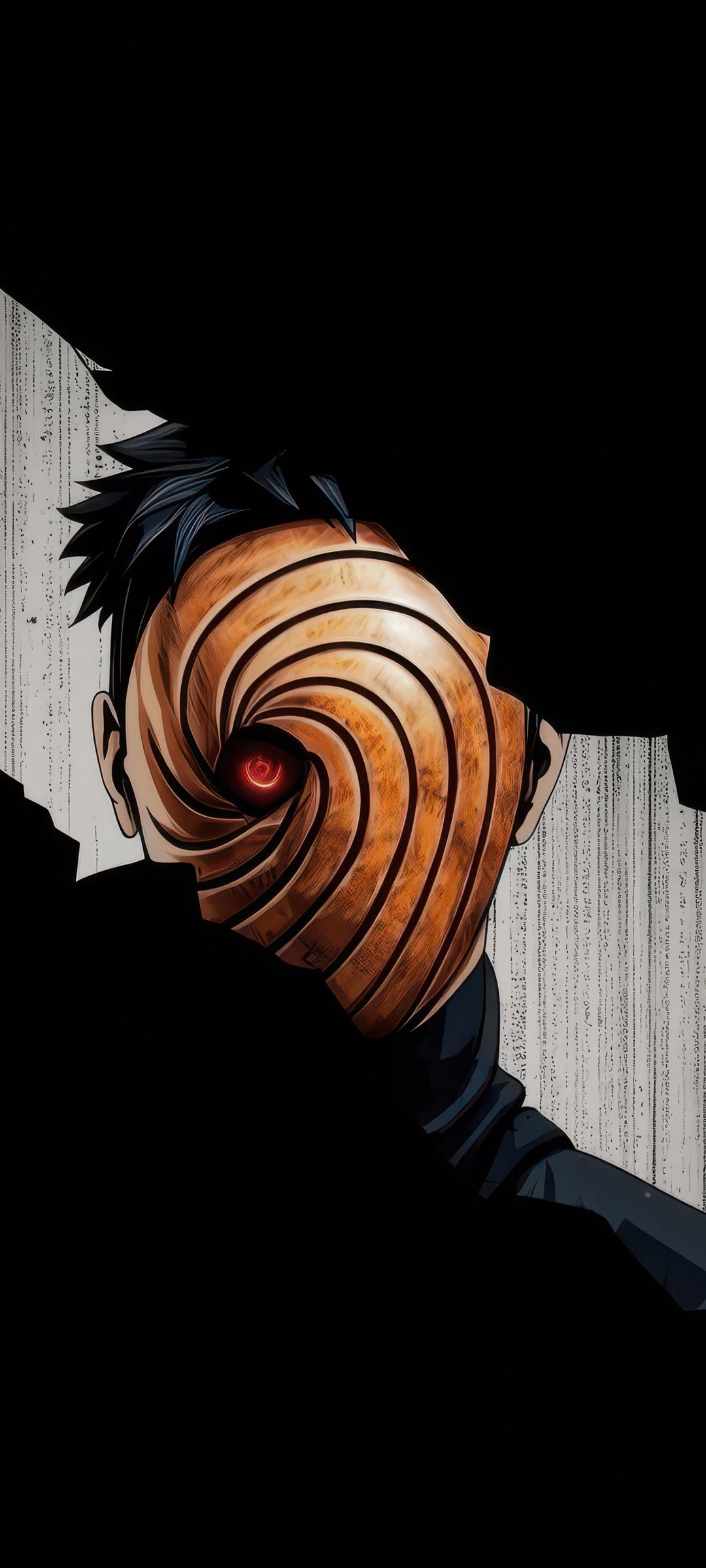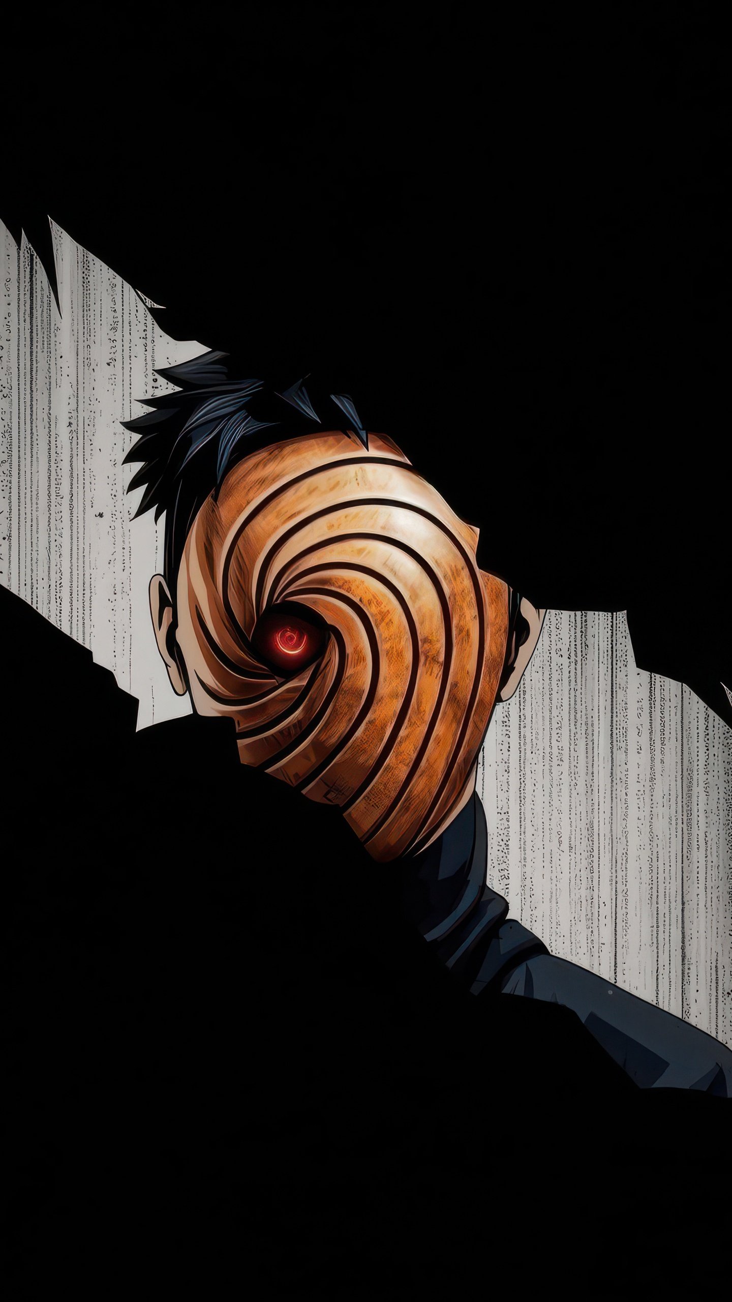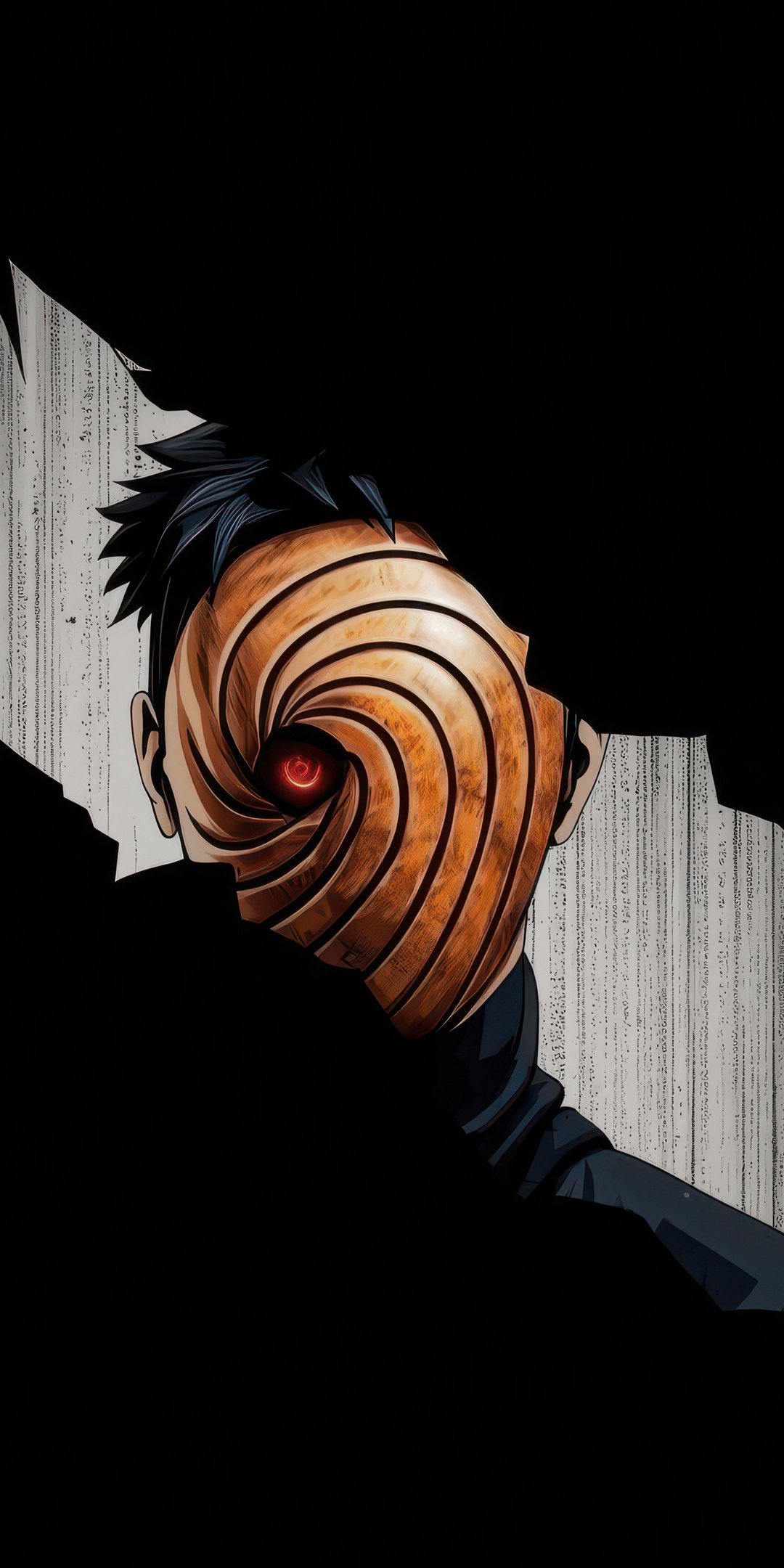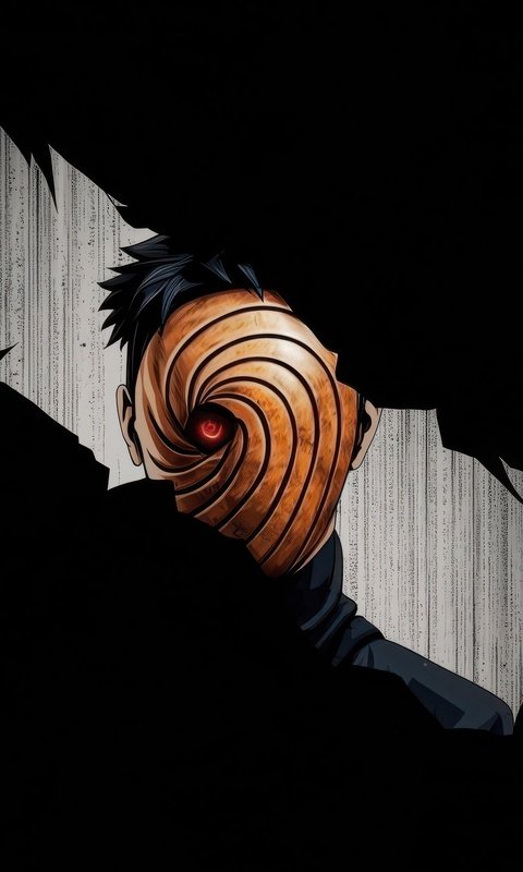 Hidden within deep shadows, Obito emerges through a fractured opening, his iconic spiral mask drawing all attention toward the glowing red Sharingan at its center. The sharp contrast between the pitch-black surroundings and the narrow strip of light creates a suspenseful, almost cinematic tension. Subtle textures in the background add depth, making it feel like you’re witnessing a secret presence watching from beyond the darkness.