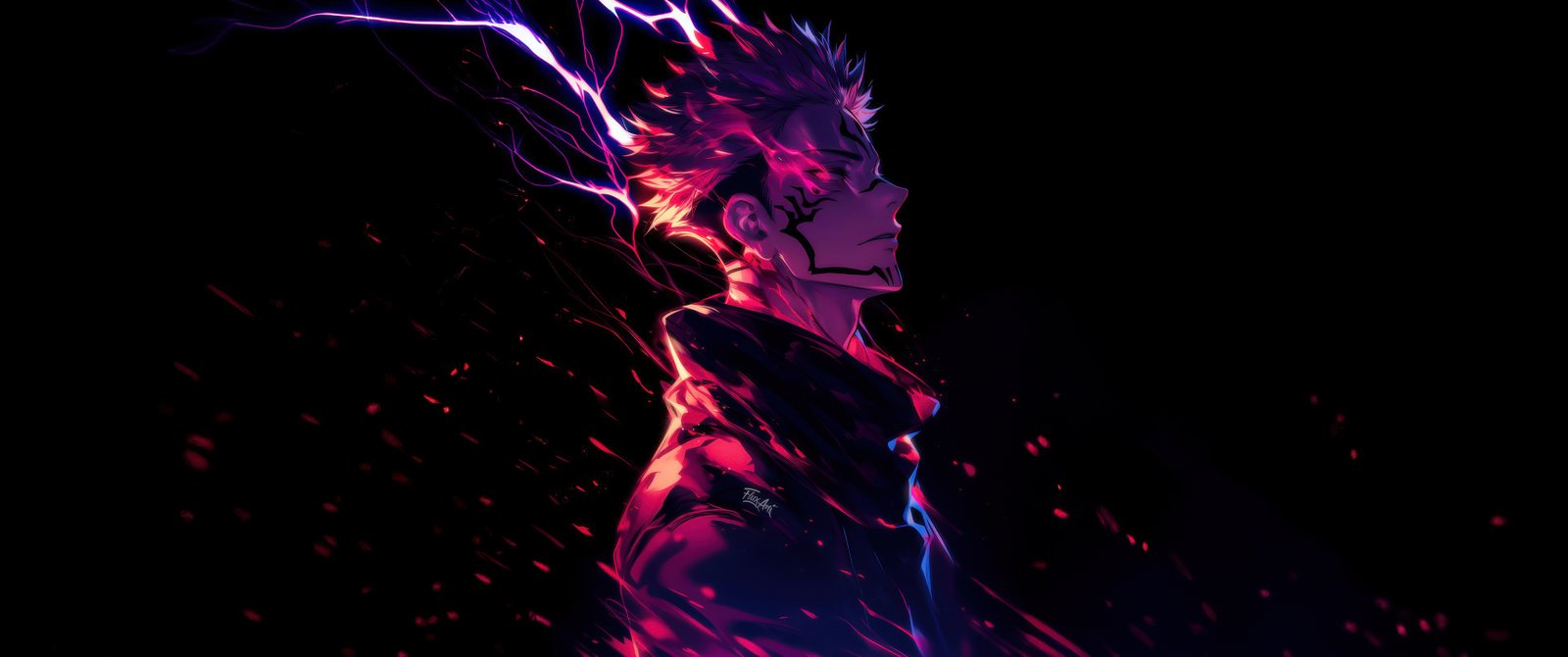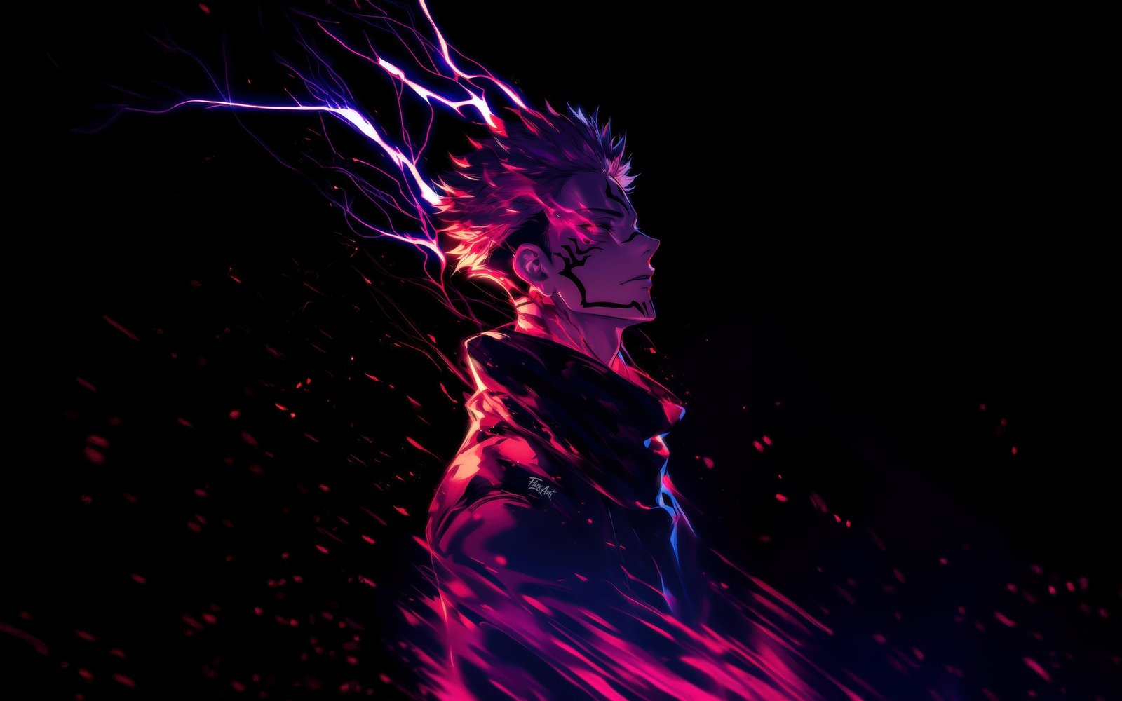 Download this Ryomen Sukuna King of Curses Wallpaper and witness the elegance of destruction embodied in human form. Bathed in crimson and violet energy, Sukuna stands against the void with an aura that bends reality itself. Electric streaks of cursed power surge from his body, illuminating the shadows as his expression remains calm, regal, and terrifyingly divine. Every spark of energy and flowing strand of hair paints a portrait of dominance — where beauty meets brutality, and chaos wears the crown of control.