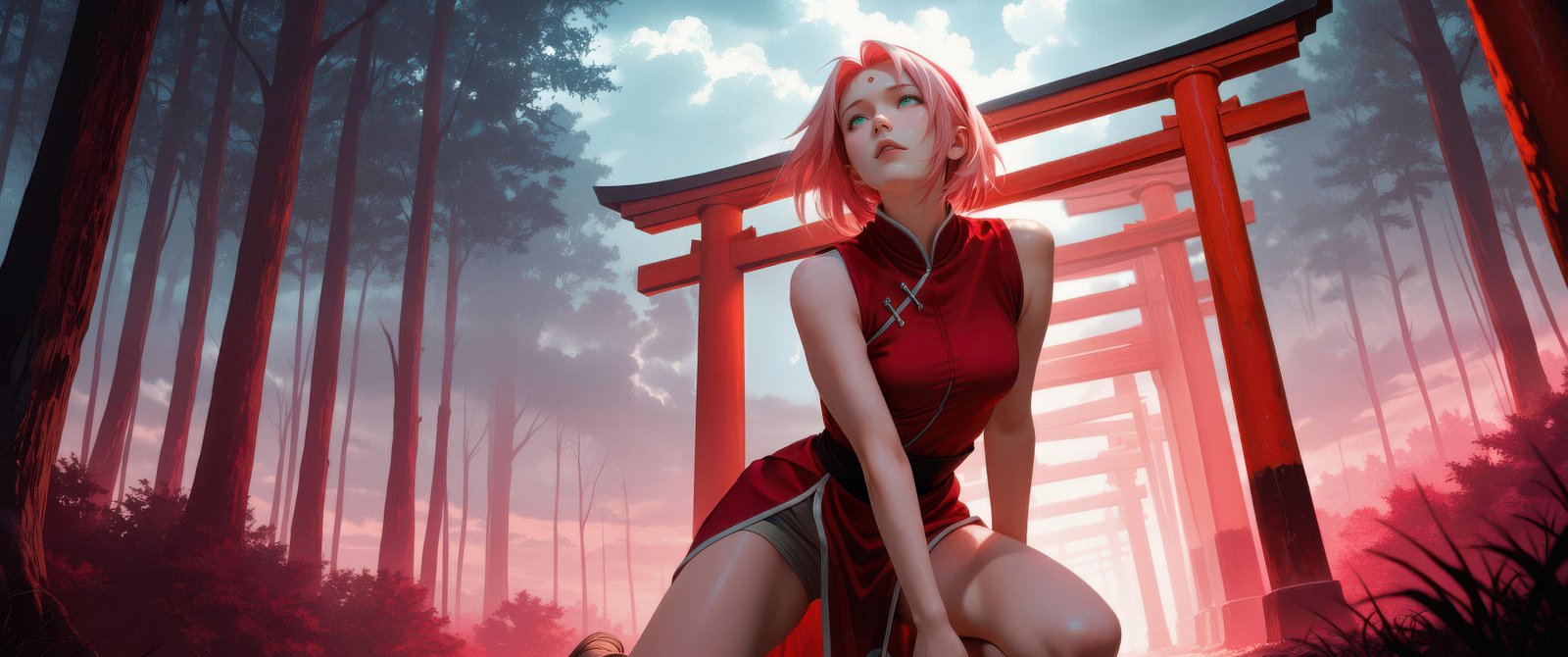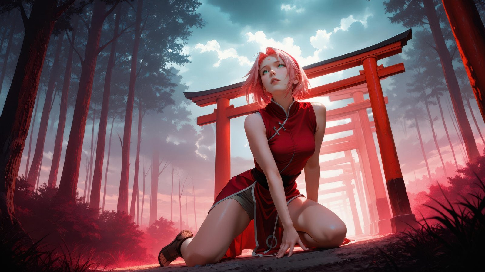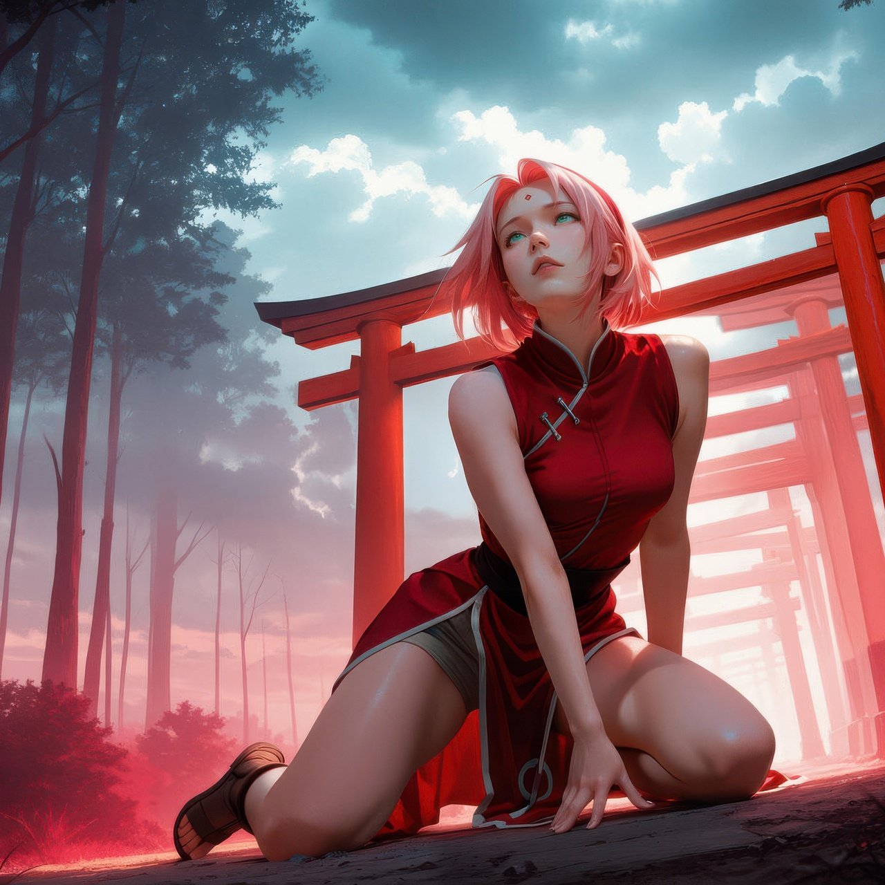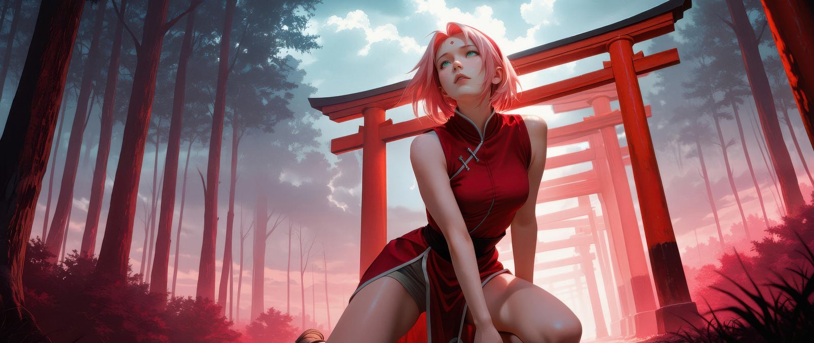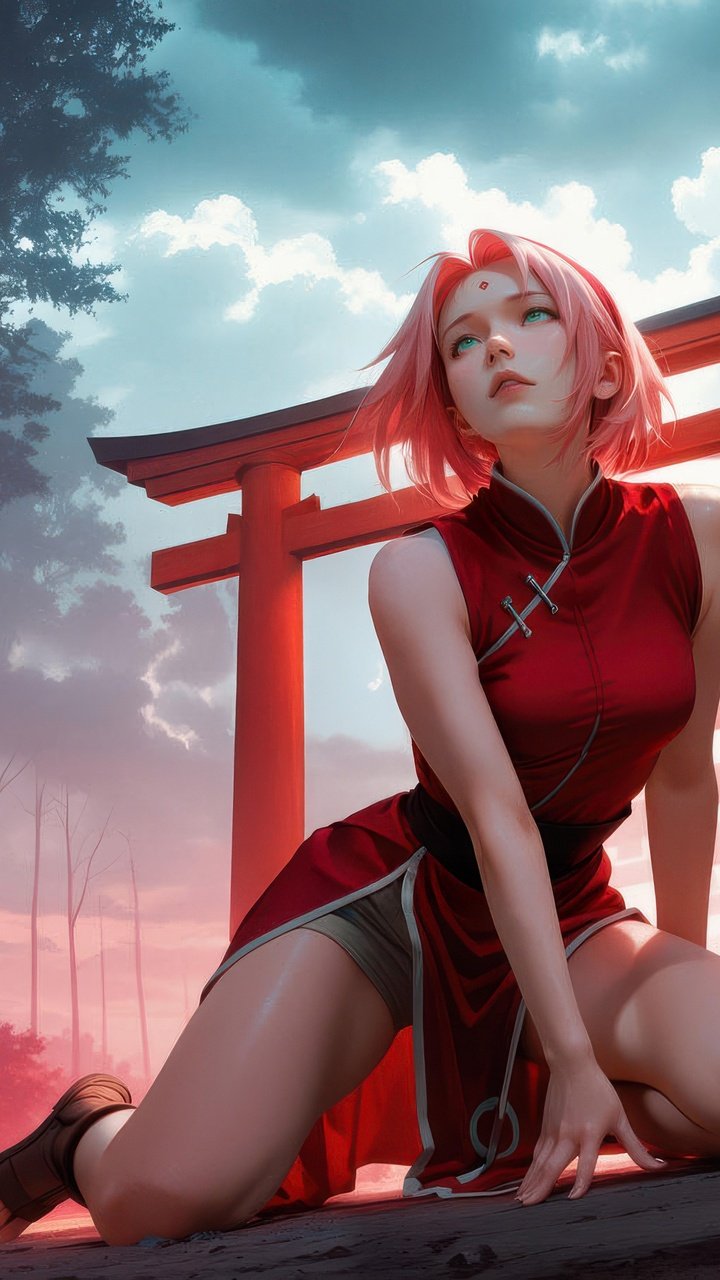 Sakura Haruno is captured in a quiet yet intense moment, kneeling along a pathway lined with vibrant red shrine gates that stretch into the misty distance. The soft glow of crimson light contrasts with the cool forest tones, creating a dreamlike atmosphere filled with depth and emotion. Her expression reflects calm determination, while the surrounding haze and towering trees add a cinematic sense of mystery and solitude.