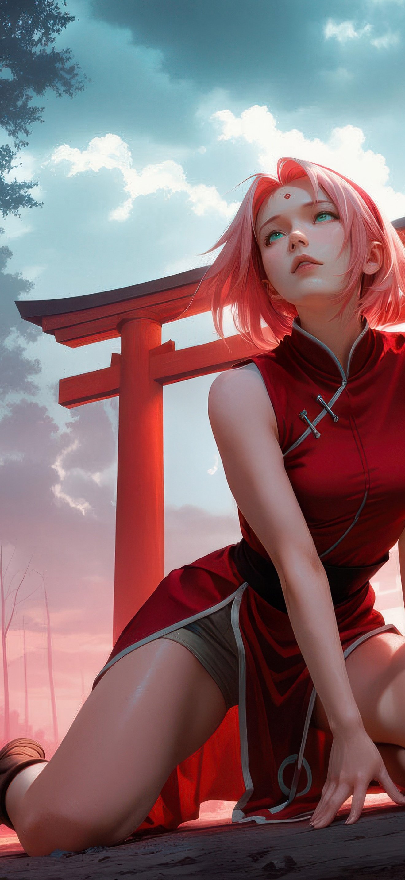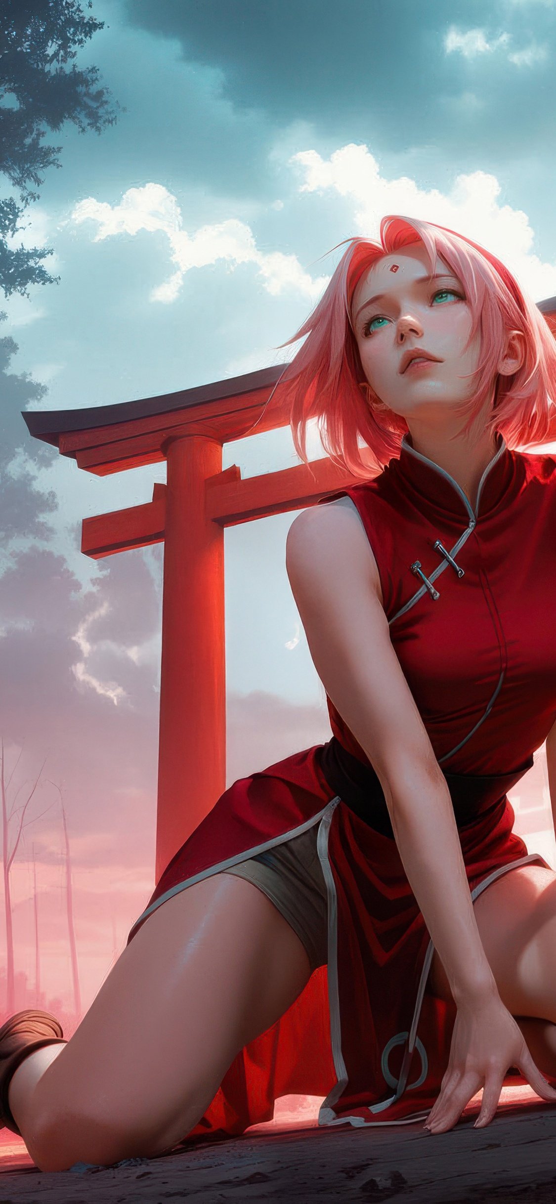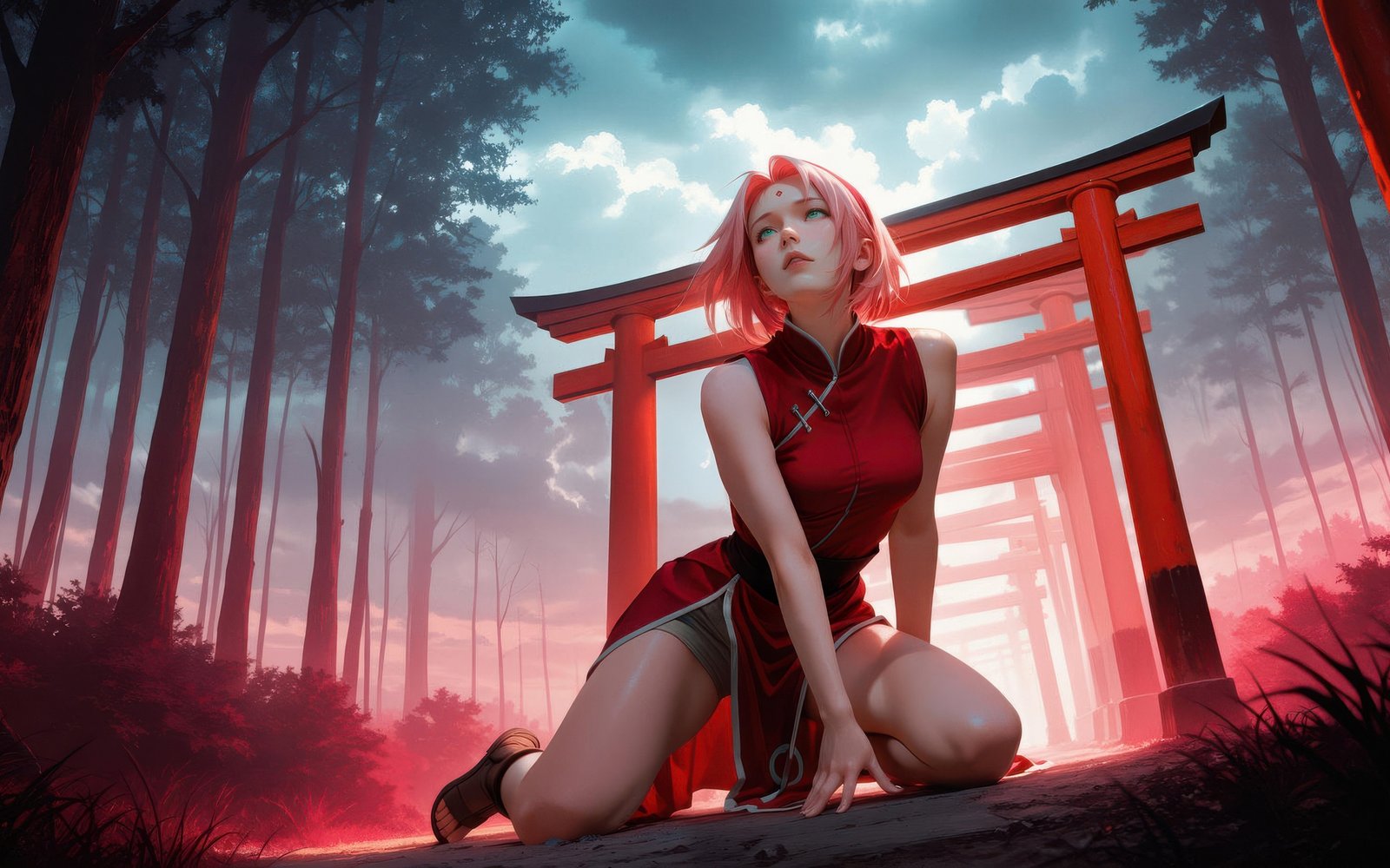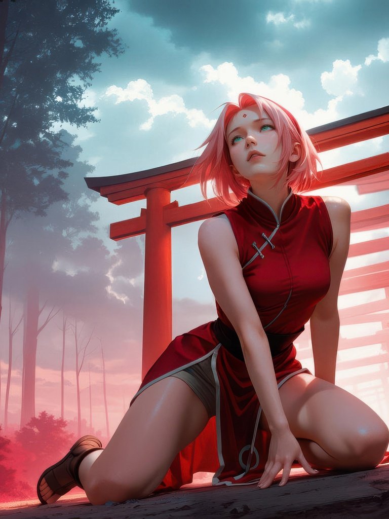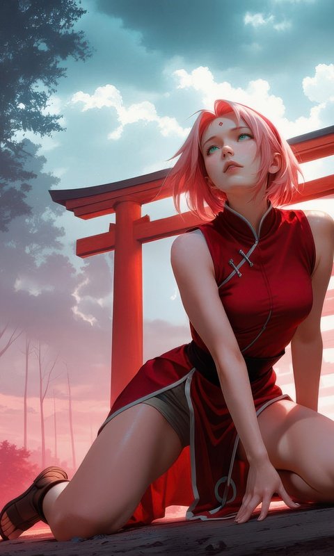 Sakura Haruno is captured in a quiet yet intense moment, kneeling along a pathway lined with vibrant red shrine gates that stretch into the misty distance. The soft glow of crimson light contrasts with the cool forest tones, creating a dreamlike atmosphere filled with depth and emotion. Her expression reflects calm determination, while the surrounding haze and towering trees add a cinematic sense of mystery and solitude.