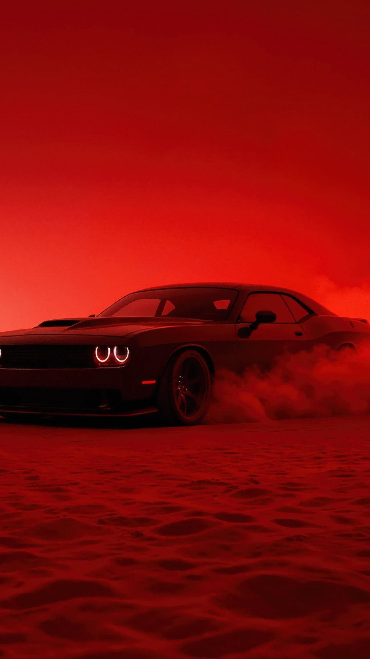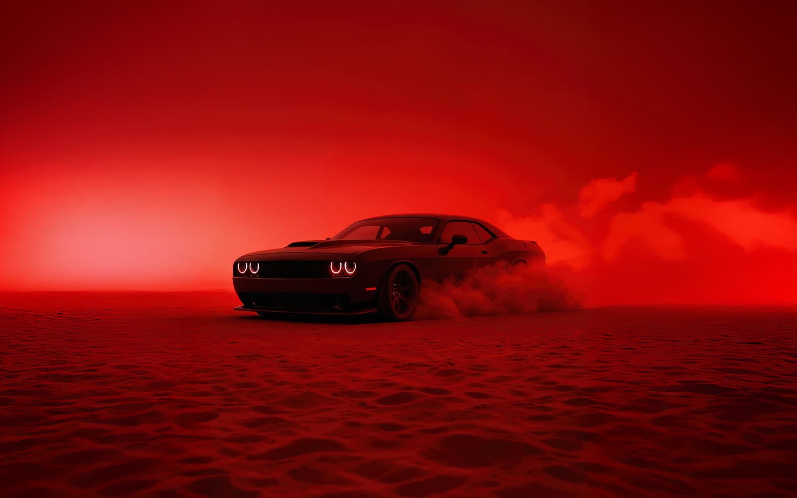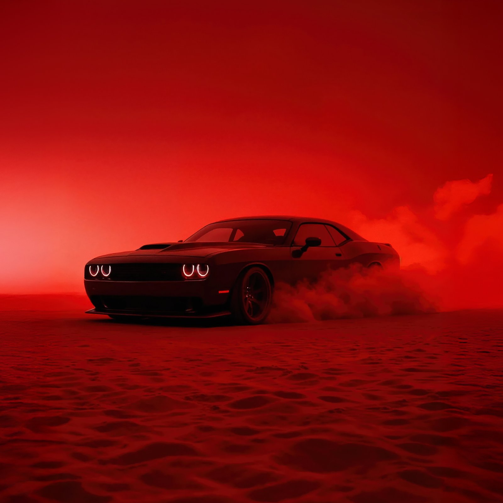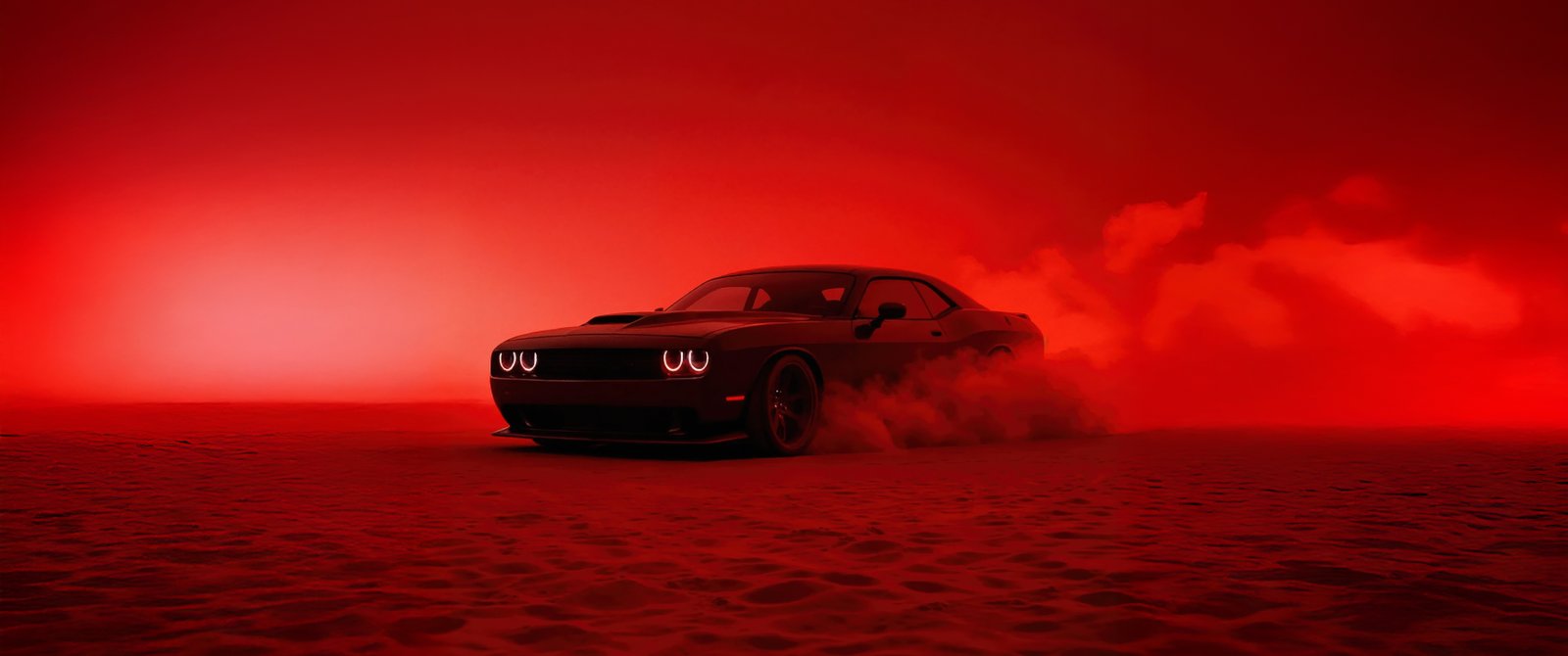 The Hellcat emerges like a beast through thick clouds of smoke, its glowing headlights cutting through the crimson haze as it drifts across the textured ground. The entire scene is drenched in deep red tones, creating a cinematic and almost apocalyptic vibe where the car feels unstoppable. Dust kicks up beneath its tires, smoke trails swirl behind it, and the low, wide stance of the Challenger gives it a menacing presence that demands attention from every angle.