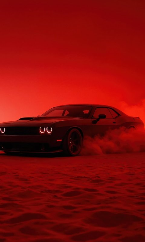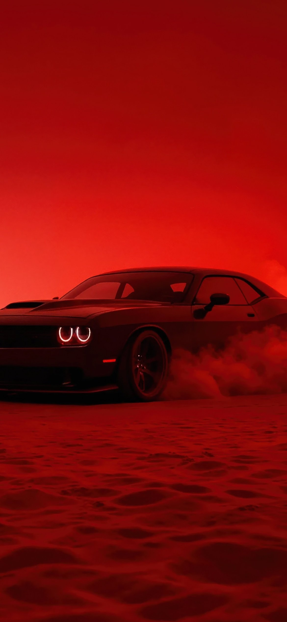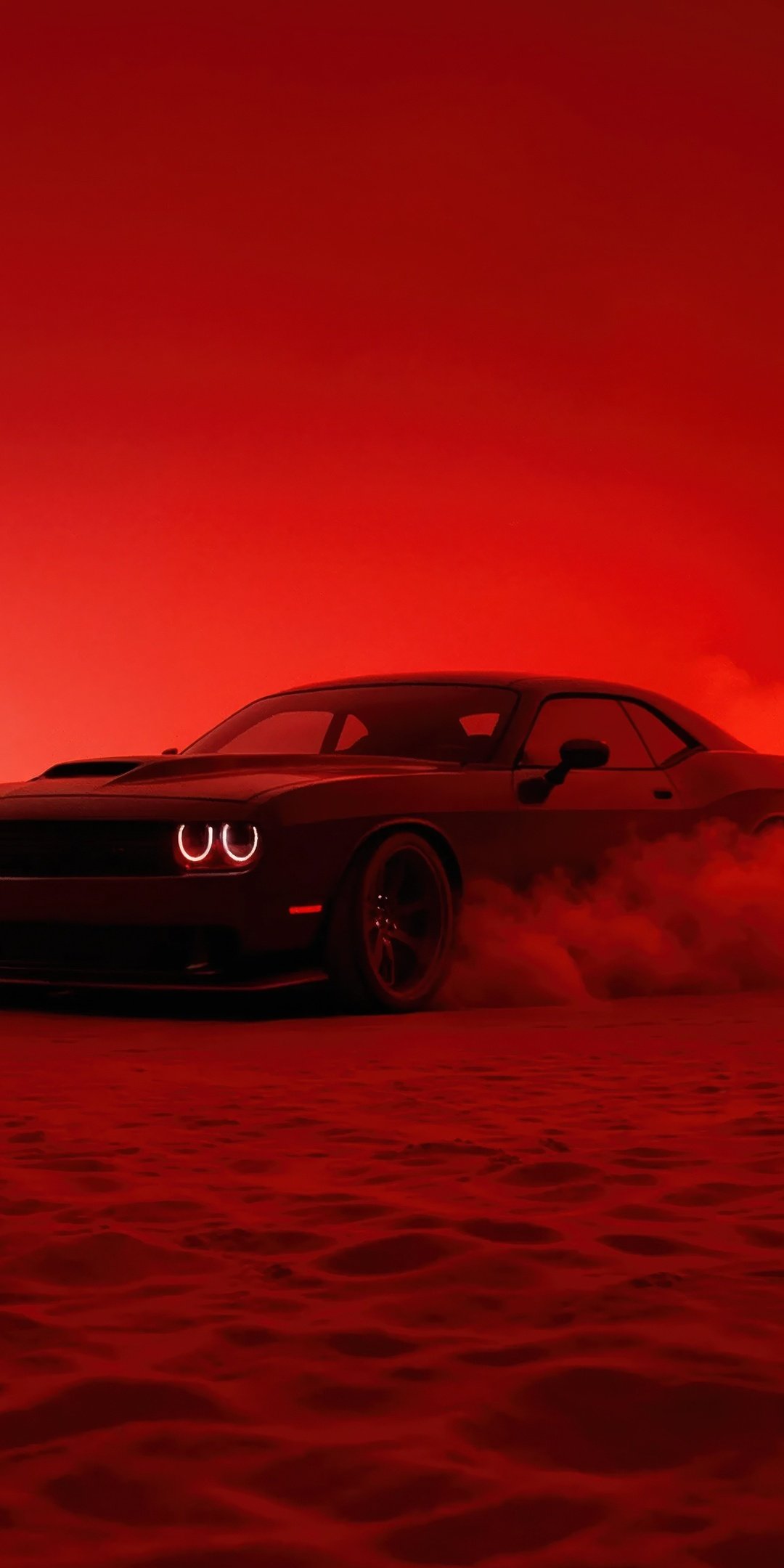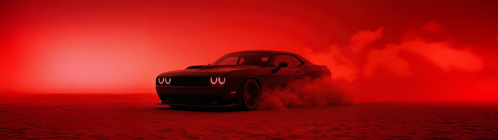 The Hellcat emerges like a beast through thick clouds of smoke, its glowing headlights cutting through the crimson haze as it drifts across the textured ground. The entire scene is drenched in deep red tones, creating a cinematic and almost apocalyptic vibe where the car feels unstoppable. Dust kicks up beneath its tires, smoke trails swirl behind it, and the low, wide stance of the Challenger gives it a menacing presence that demands attention from every angle.