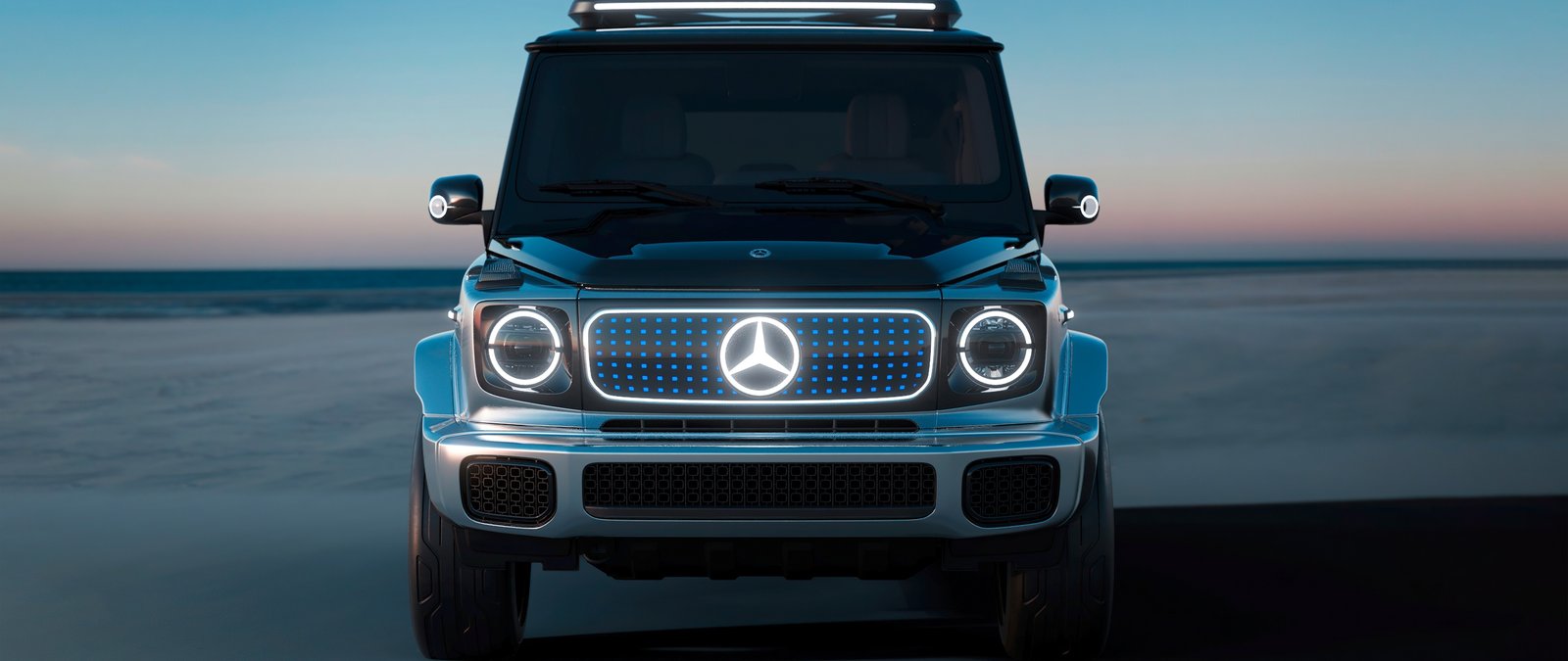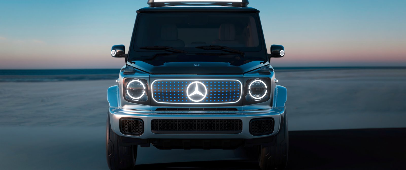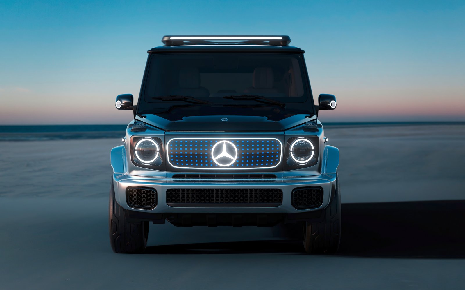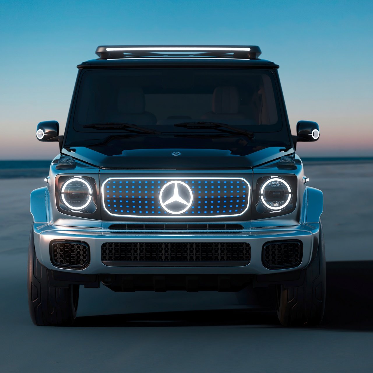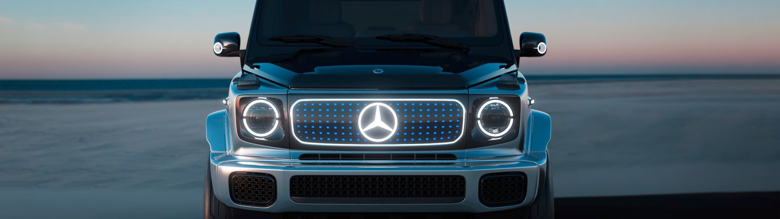 Download this Mercedes EQG Futuristic SUV Wallpaper and embrace the power of innovation wrapped in timeless luxury. The all-electric Mercedes EQG stands poised against a tranquil horizon, its illuminated grille and signature LED rings glowing like symbols of the future. Every curve of the SUV reflects sophistication — from the polished metallic body to the sleek aerodynamic silhouette. Bathed in soft twilight tones, this image captures a perfect fusion of engineering precision and avant-garde elegance.