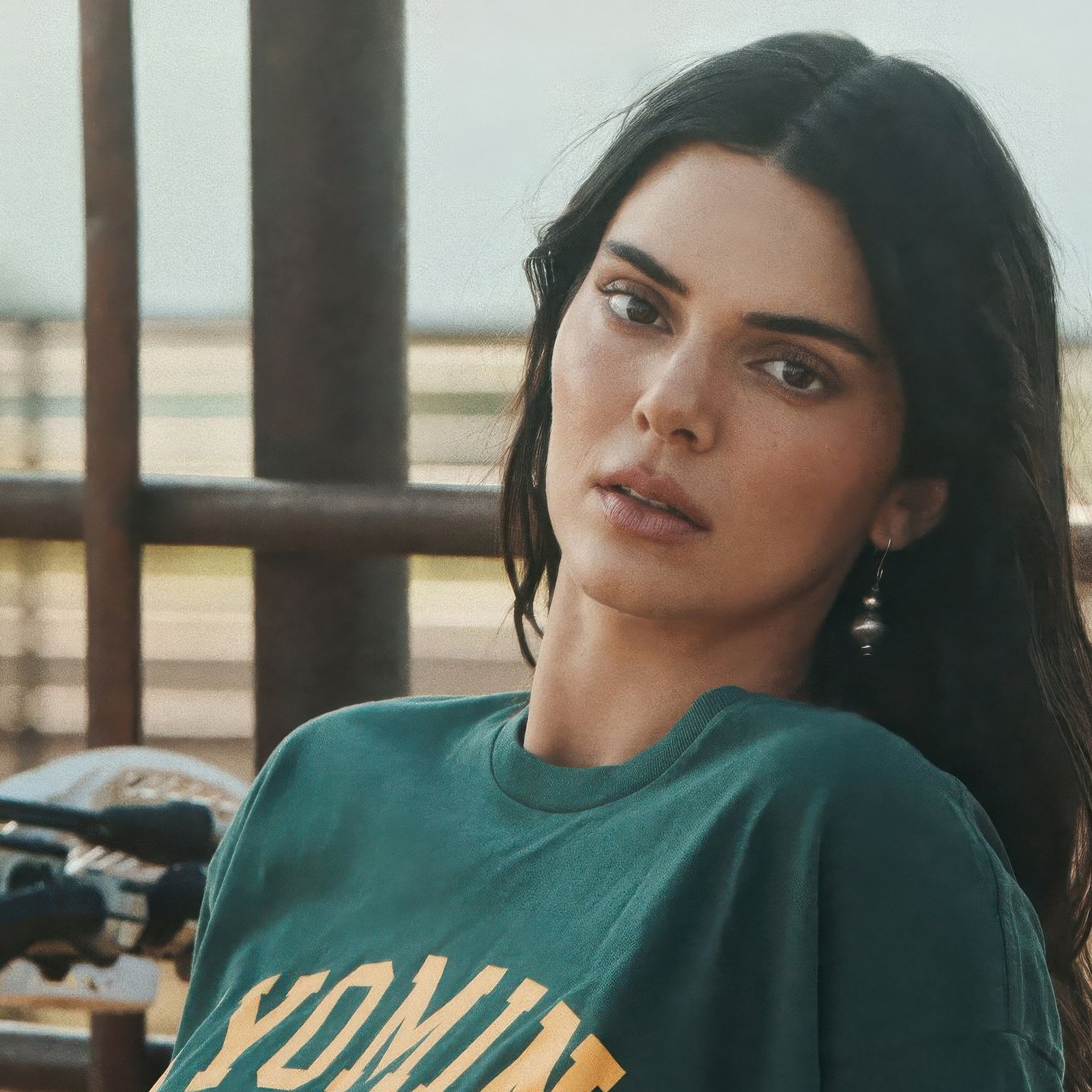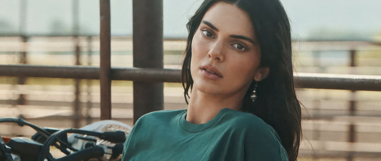 Captured in soft natural light, Kendall leans against a rugged ranch setting, her relaxed expression and subtle details creating a sense of quiet confidence. The warm tones of the background, paired with earthy textures and open surroundings, give the image a grounded and authentic feel. Gentle highlights on her features and the muted color palette enhance the laid-back aesthetic, making the entire scene feel both intimate and visually soothing.