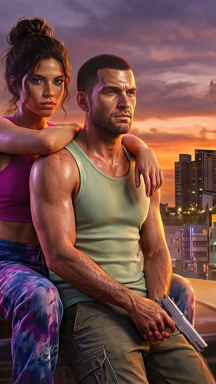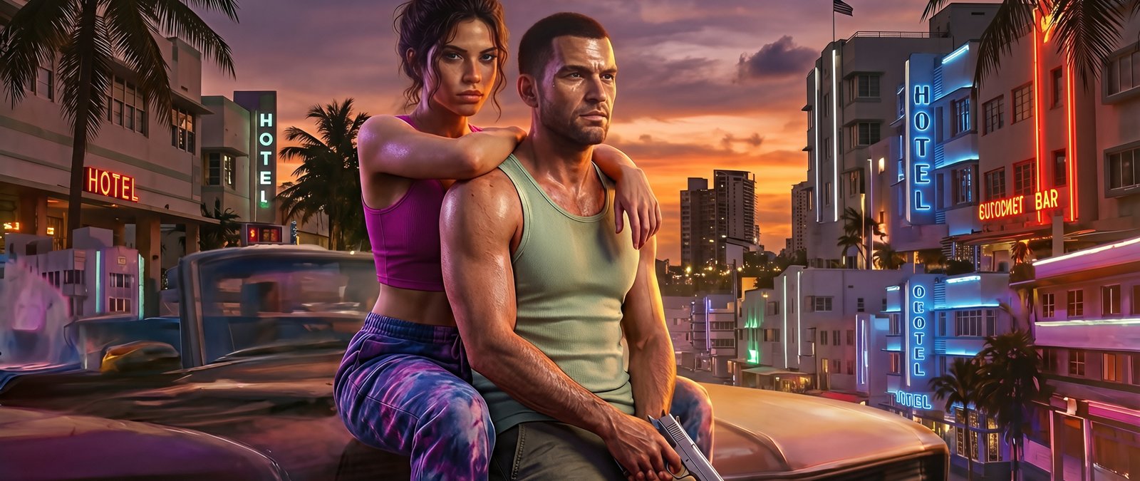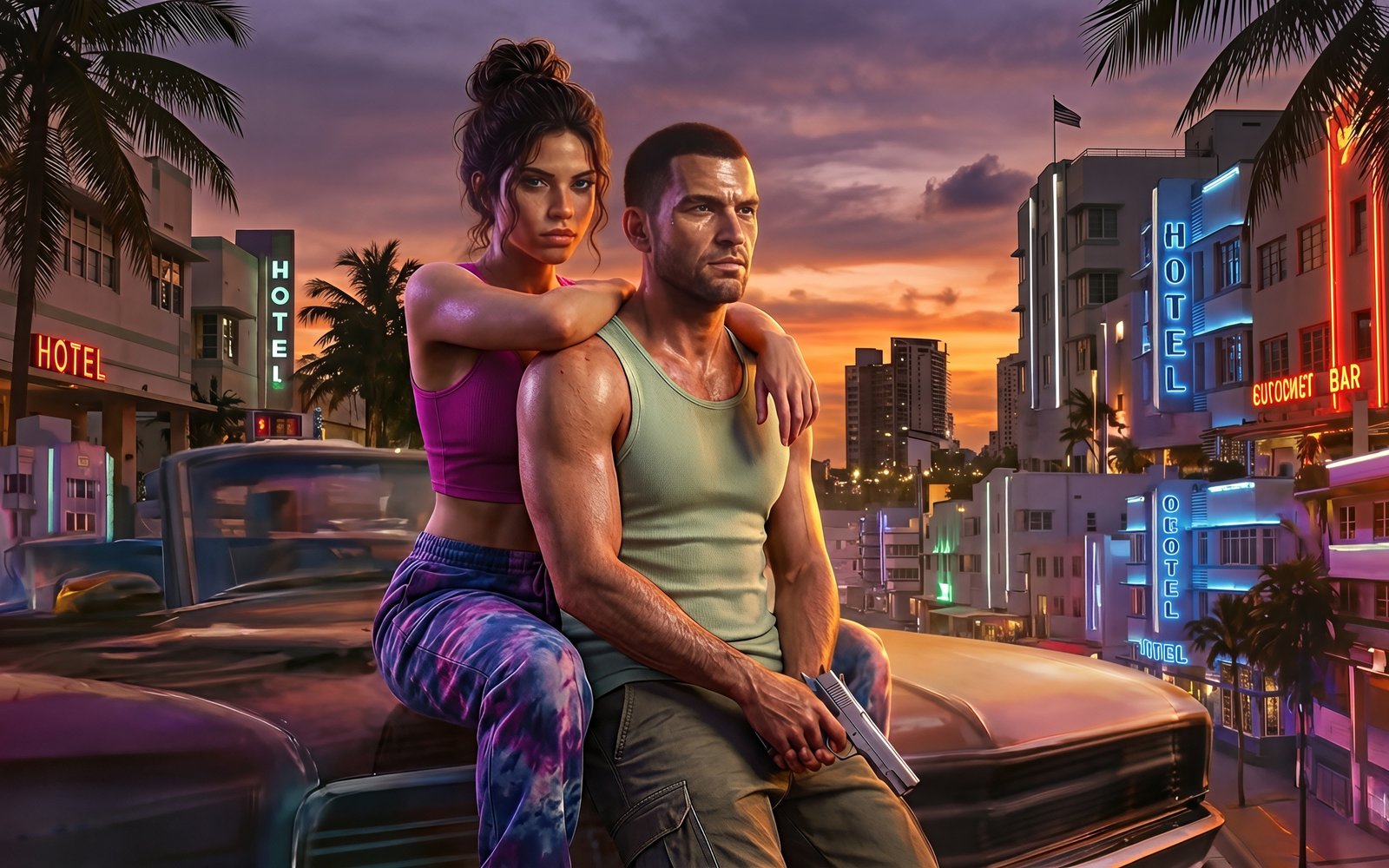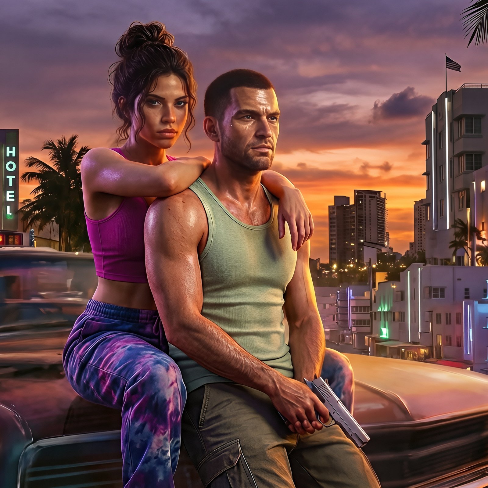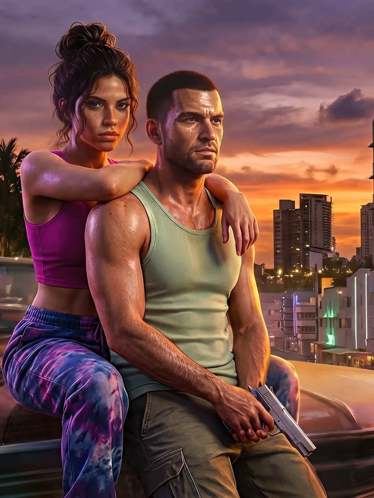 Set against a vibrant sunset skyline filled with glowing hotel signs, palm trees, and retro city lights, Jason and Lucia sit atop a classic car, embodying both danger and connection. The warm orange sky blends seamlessly with neon blues and pinks, creating a cinematic contrast that captures the essence of Vice City’s chaotic beauty. With tension in their expressions and a weapon in hand, the scene tells a silent story of trust, rebellion, and the thrill of living on the edge.