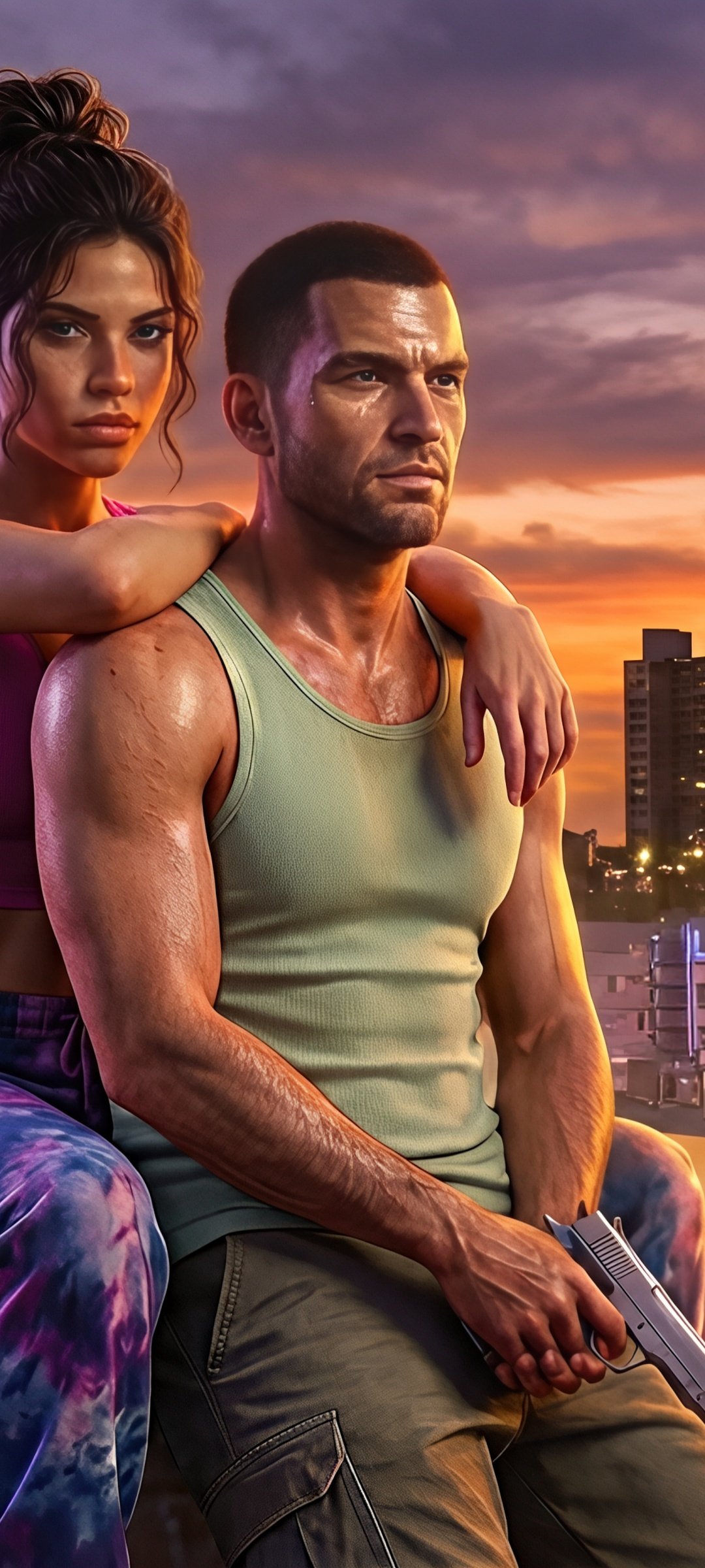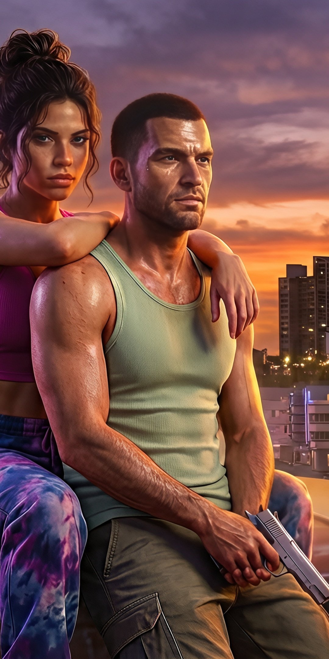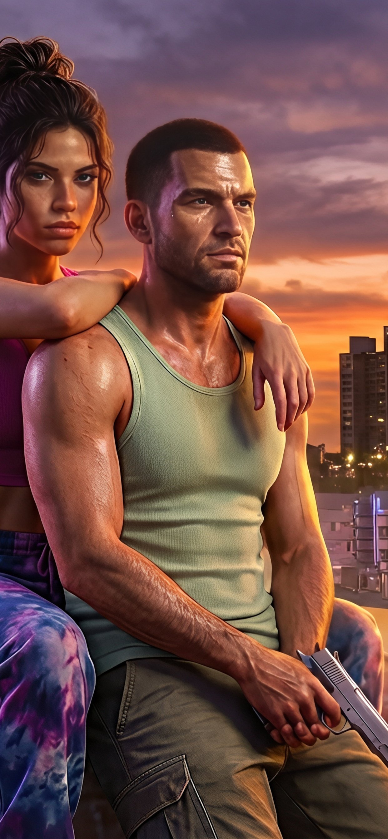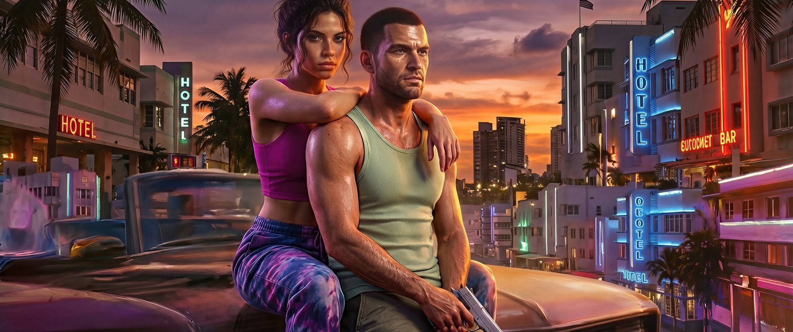 Set against a vibrant sunset skyline filled with glowing hotel signs, palm trees, and retro city lights, Jason and Lucia sit atop a classic car, embodying both danger and connection. The warm orange sky blends seamlessly with neon blues and pinks, creating a cinematic contrast that captures the essence of Vice City’s chaotic beauty. With tension in their expressions and a weapon in hand, the scene tells a silent story of trust, rebellion, and the thrill of living on the edge.