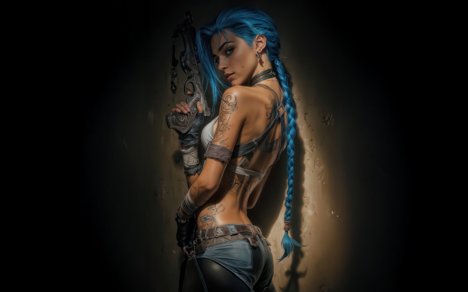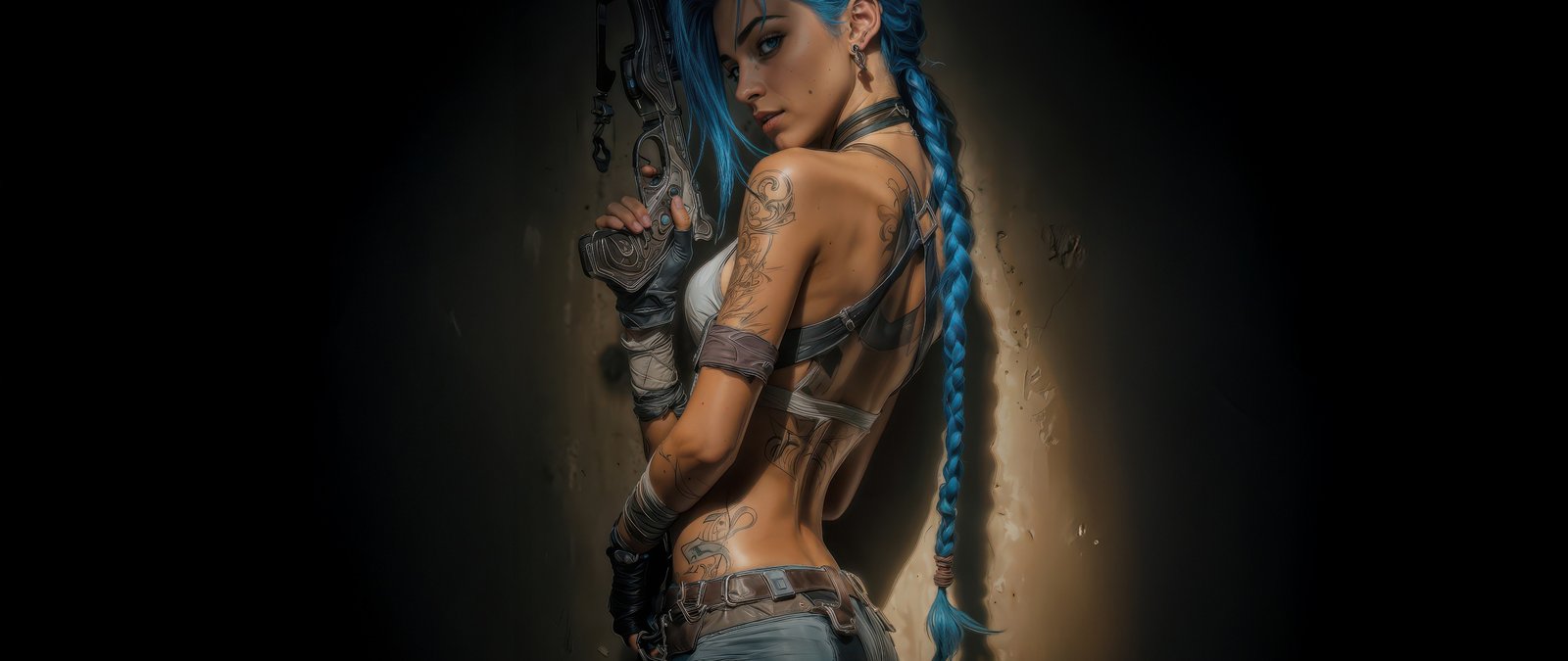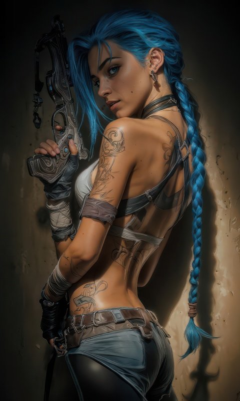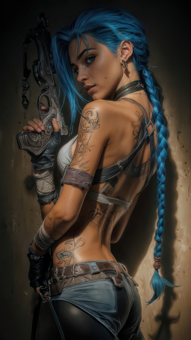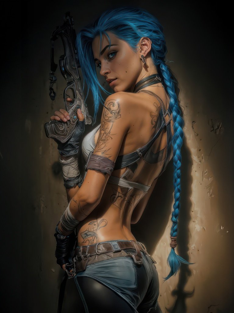 Jinx stands fierce and untamed, her iconic blue braid cascading down her back as she grips her weapon with confidence. The dim, gritty backdrop contrasts with her glowing skin tones and intricate tattoos, highlighting her rebellious energy and unpredictable nature. Every detail—from her sharp gaze to the worn textures of her outfit—captures the essence of a character who thrives in chaos and leaves destruction in her wake.