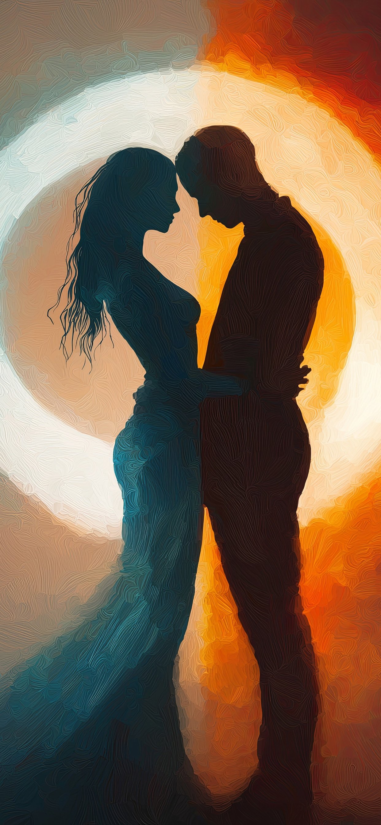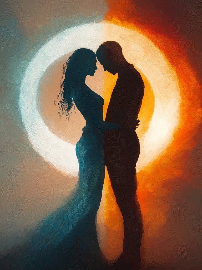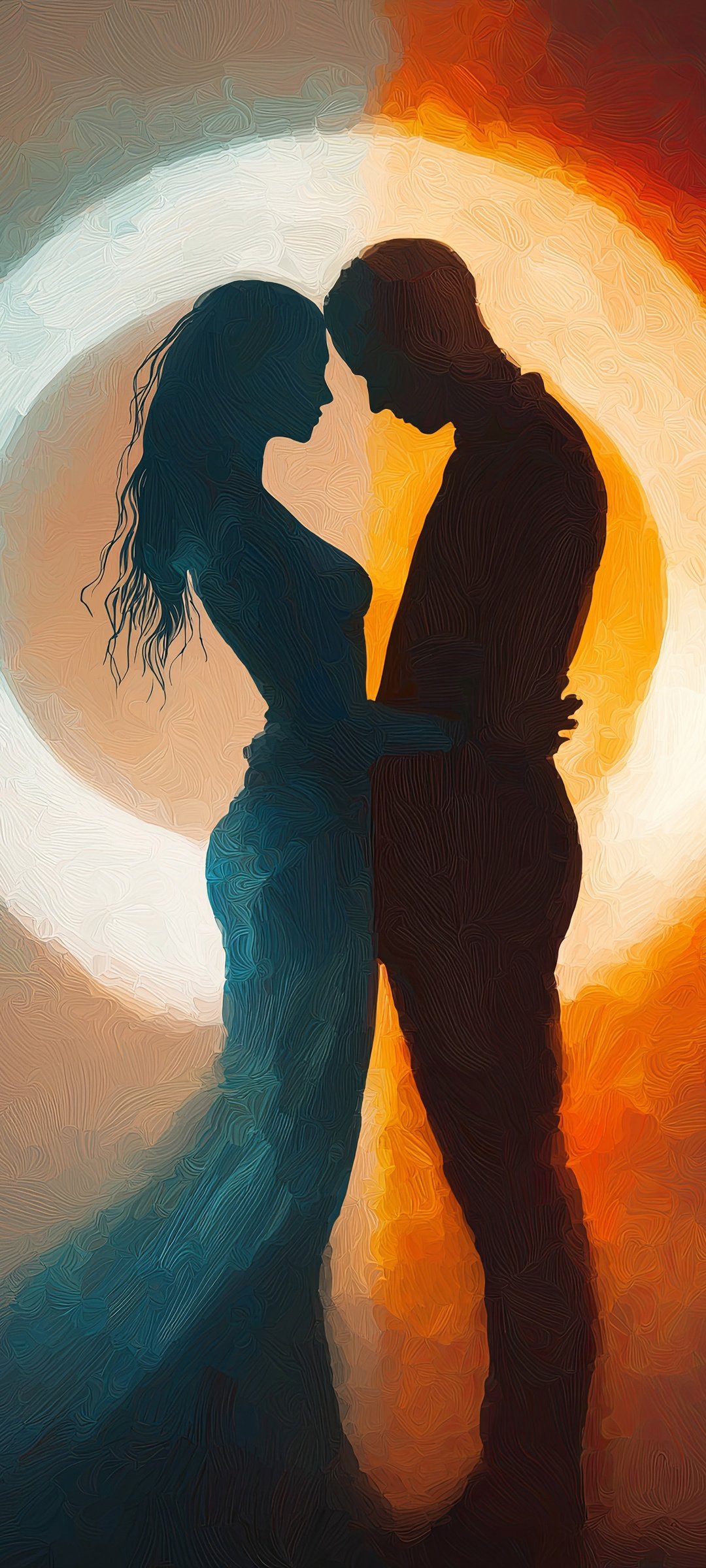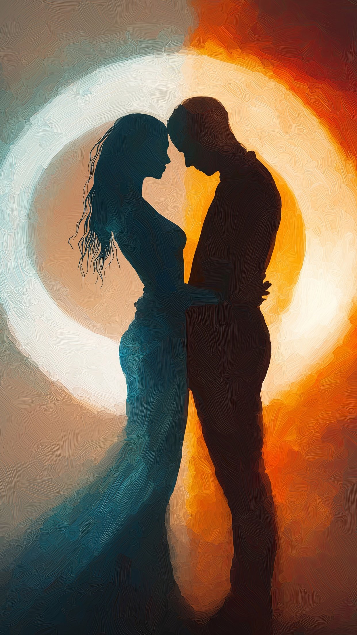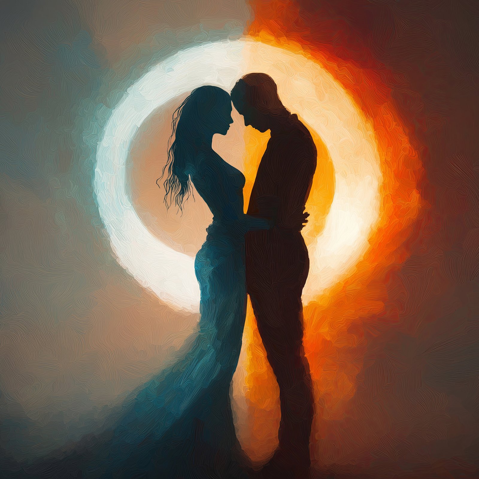 A mesmerizing eclipse radiates behind two silhouettes locked in a tender embrace, blending fiery orange and cool shadow tones into a surreal visual harmony. The soft glow wraps around their forms, creating a dramatic contrast between light and darkness, as if the universe itself pauses to witness this fleeting, intimate moment. Every detail feels timeless, suspended between passion and serenity.