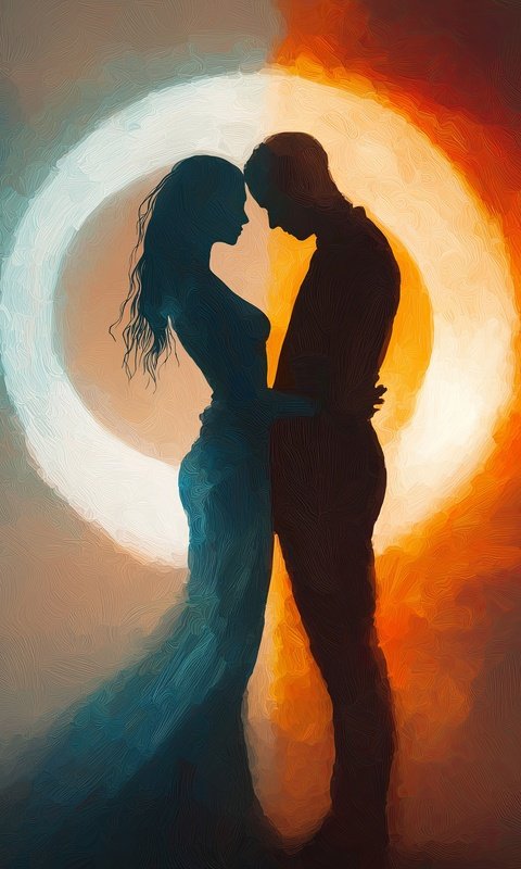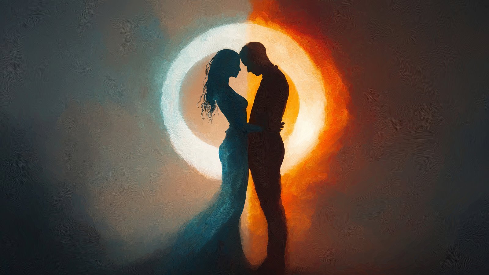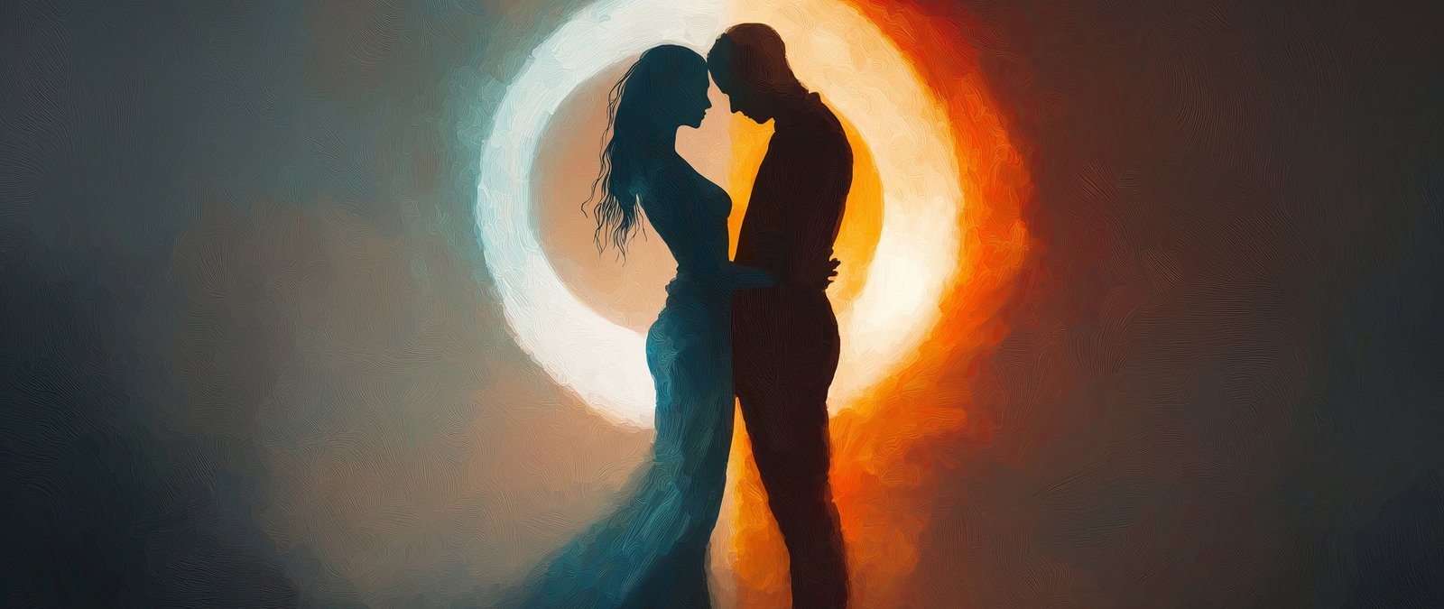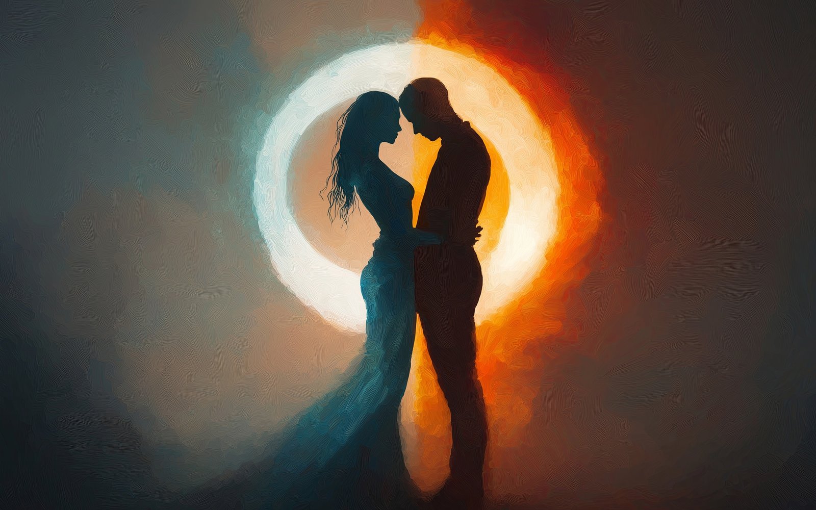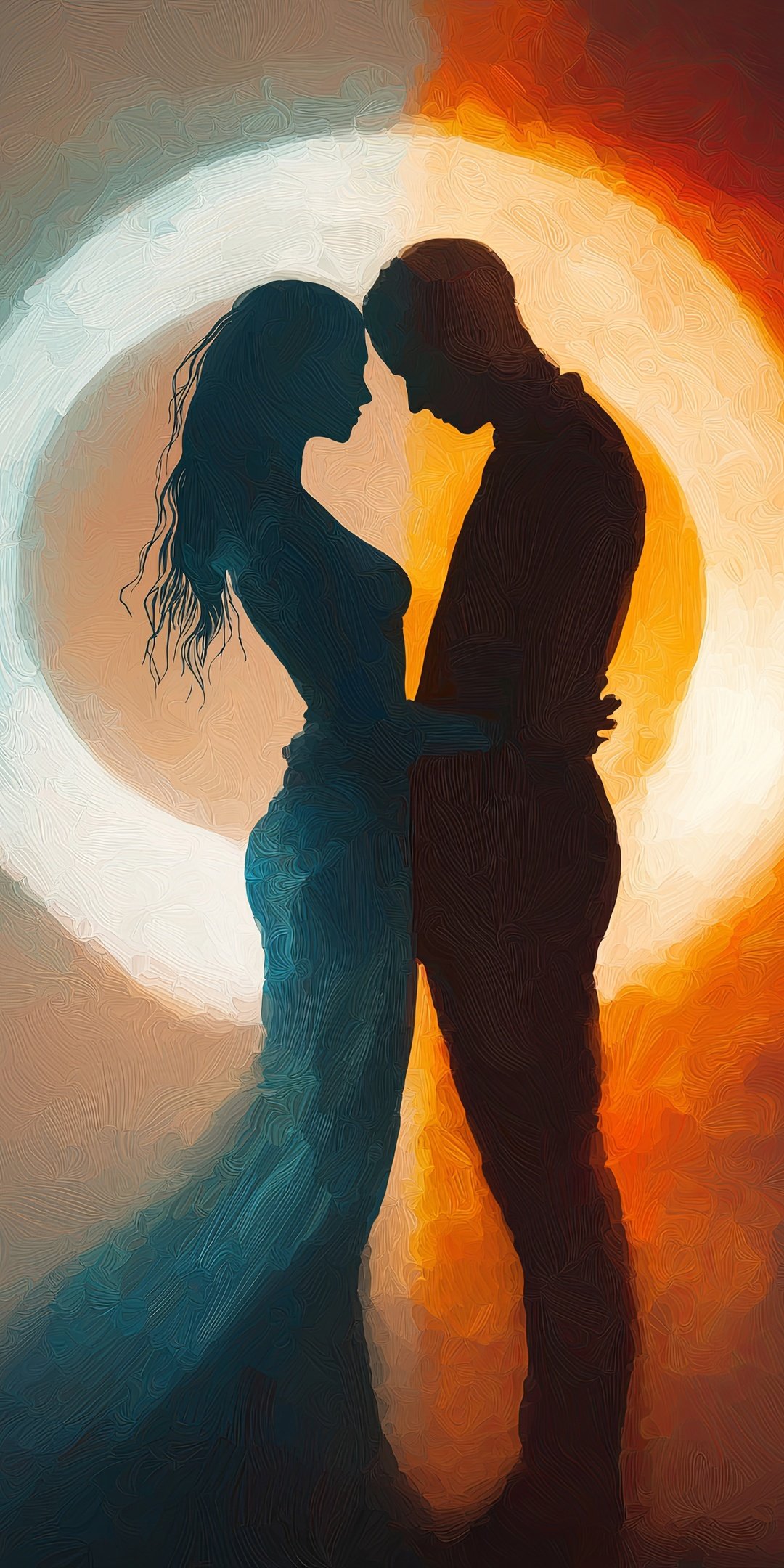 A mesmerizing eclipse radiates behind two silhouettes locked in a tender embrace, blending fiery orange and cool shadow tones into a surreal visual harmony. The soft glow wraps around their forms, creating a dramatic contrast between light and darkness, as if the universe itself pauses to witness this fleeting, intimate moment. Every detail feels timeless, suspended between passion and serenity.