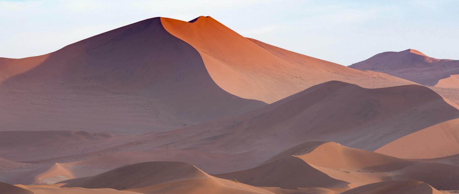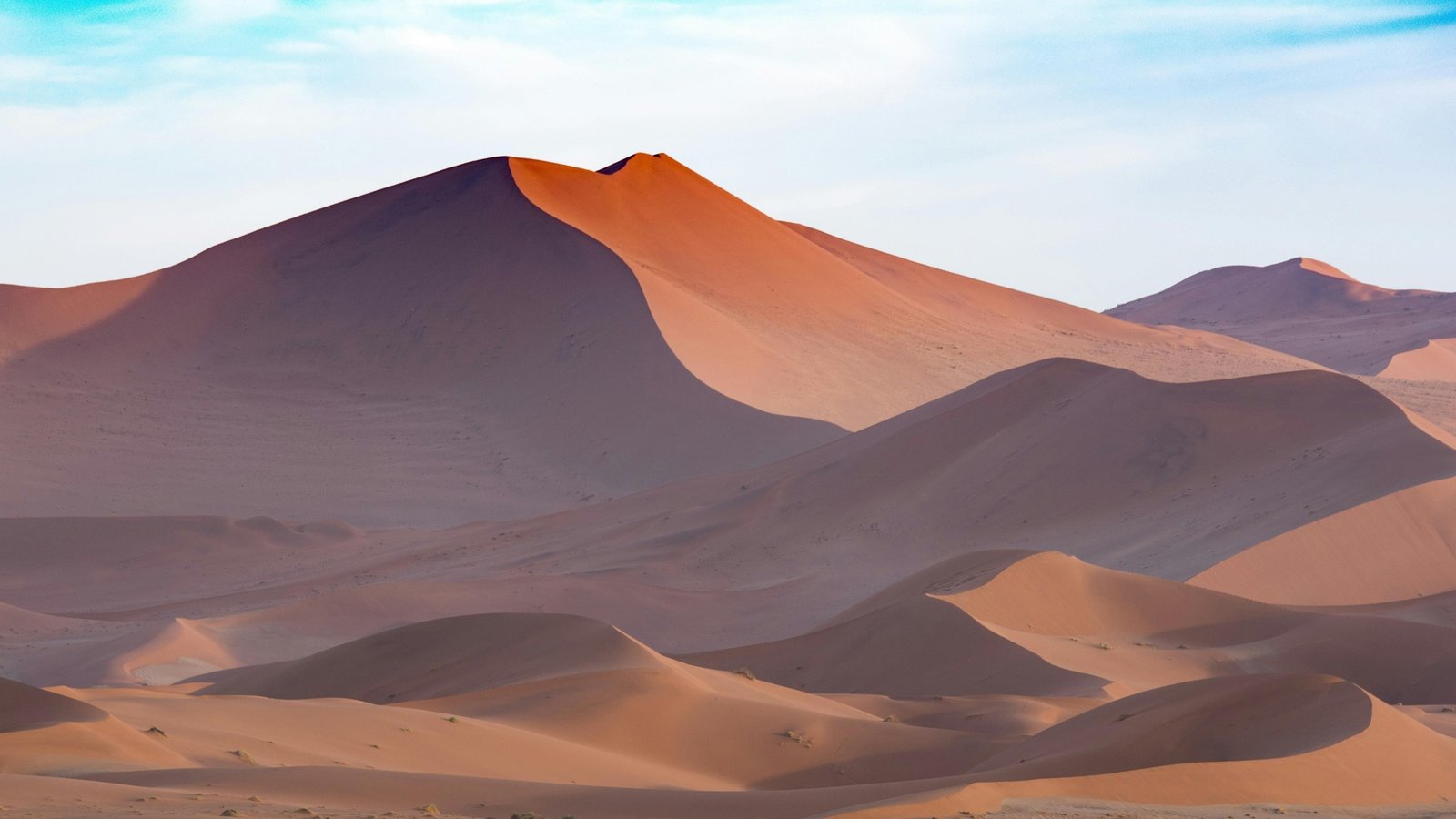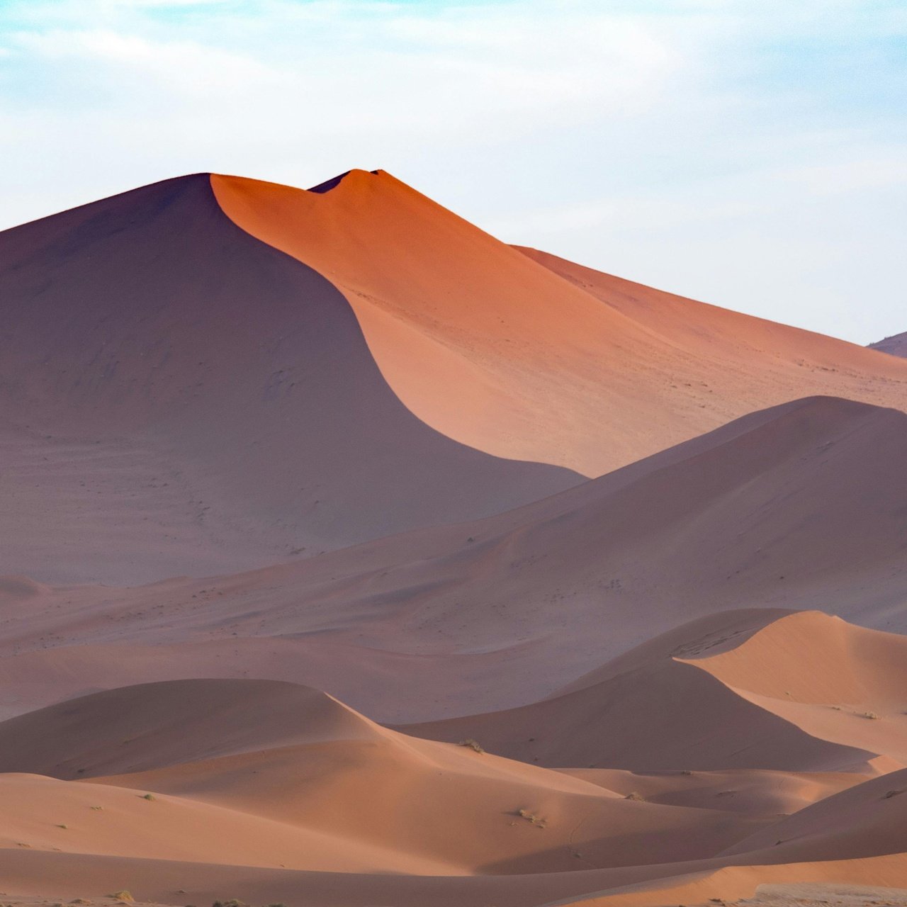 Soft waves of golden sand stretch endlessly across the horizon, sculpted by wind into smooth, flowing curves that catch the light in perfect harmony. Subtle shadows drift across the dunes, creating gentle contrasts that enhance the depth and tranquility of the scene. The sky above remains clean and open, allowing the minimal beauty of the desert to take full focus without distraction.