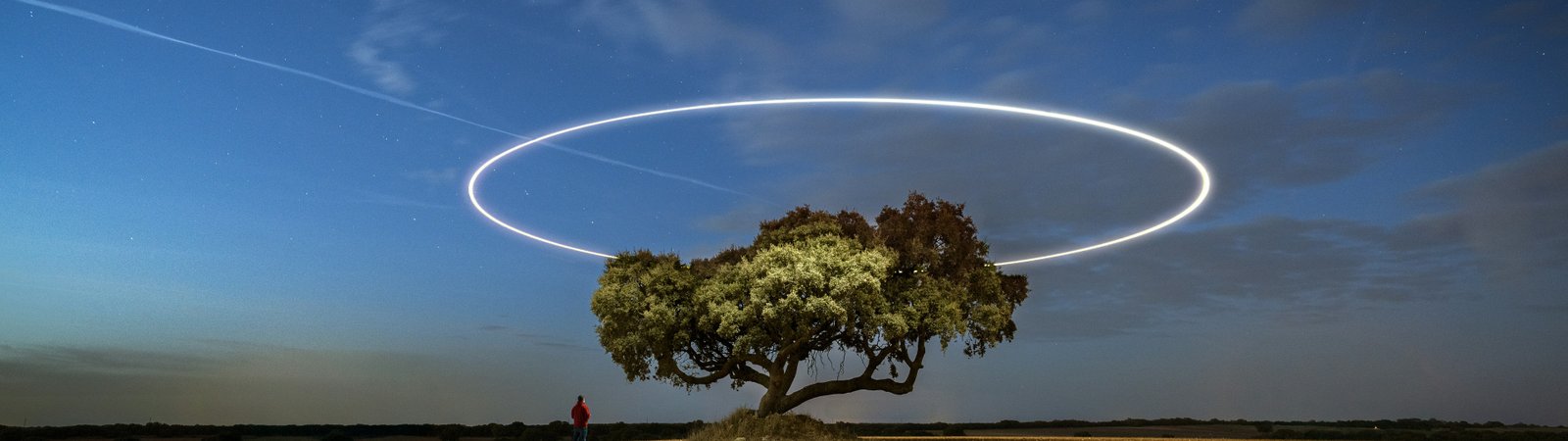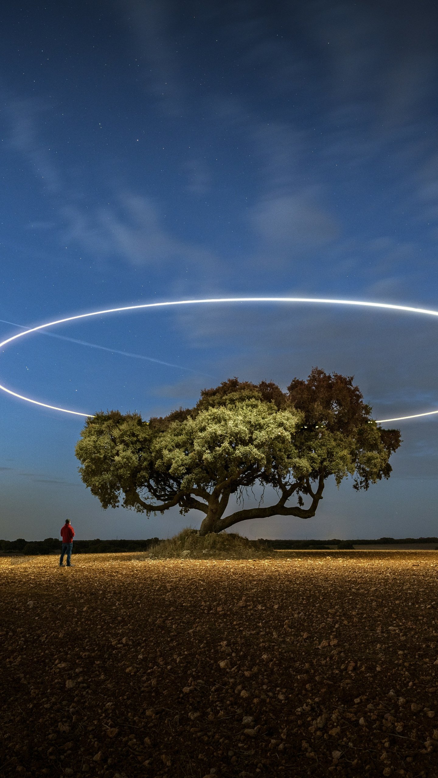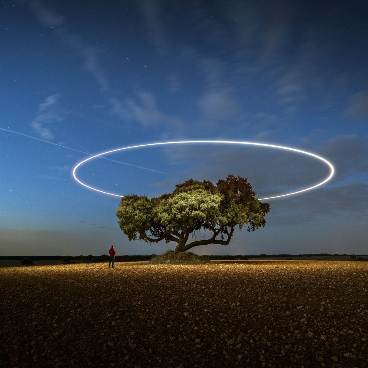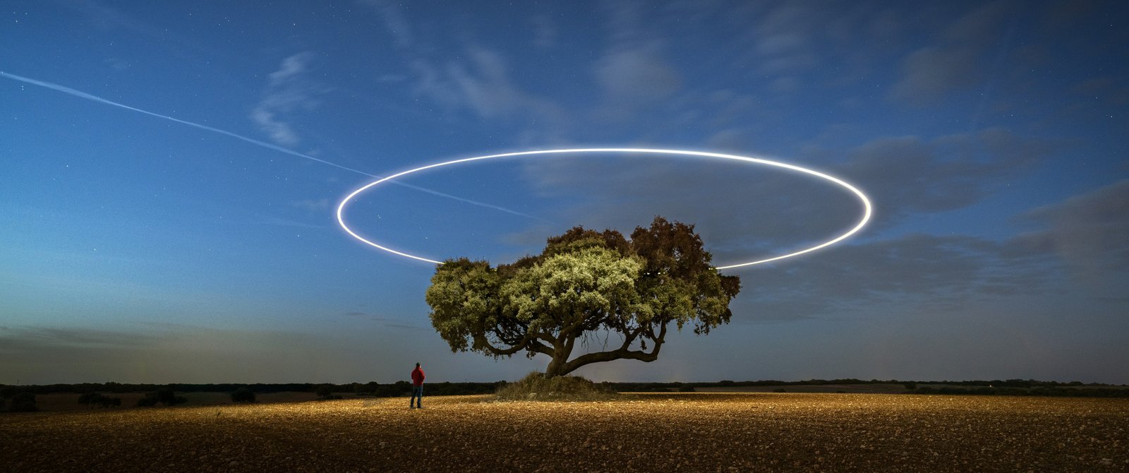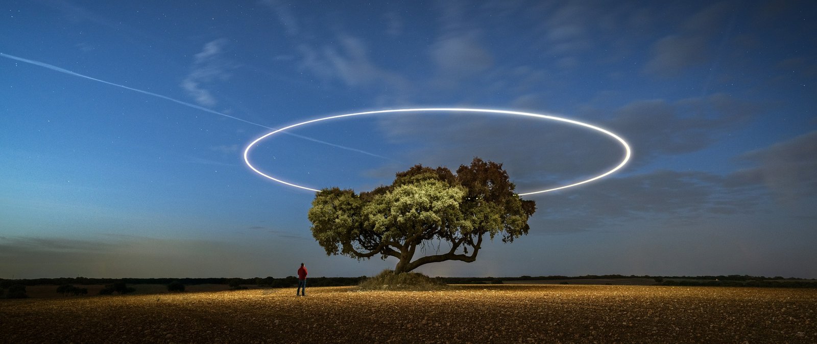 A lone tree stands quietly under a vast night sky, illuminated by a perfect glowing ring hovering above it like an otherworldly halo. The soft gradient of twilight blends into deep blue, while subtle stars and a passing light trail add motion to the stillness. The open field stretches endlessly, emphasizing solitude and scale, while the small human figure nearby enhances the sense of wonder, curiosity, and quiet exploration.