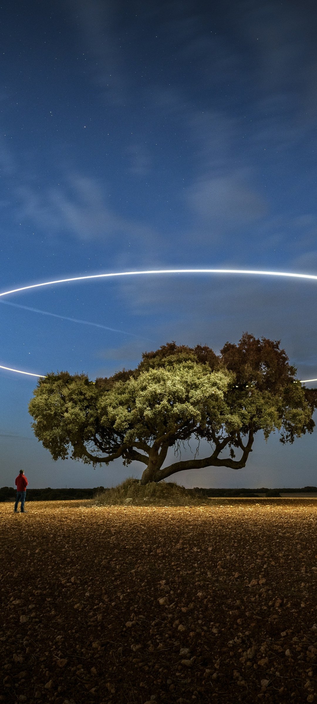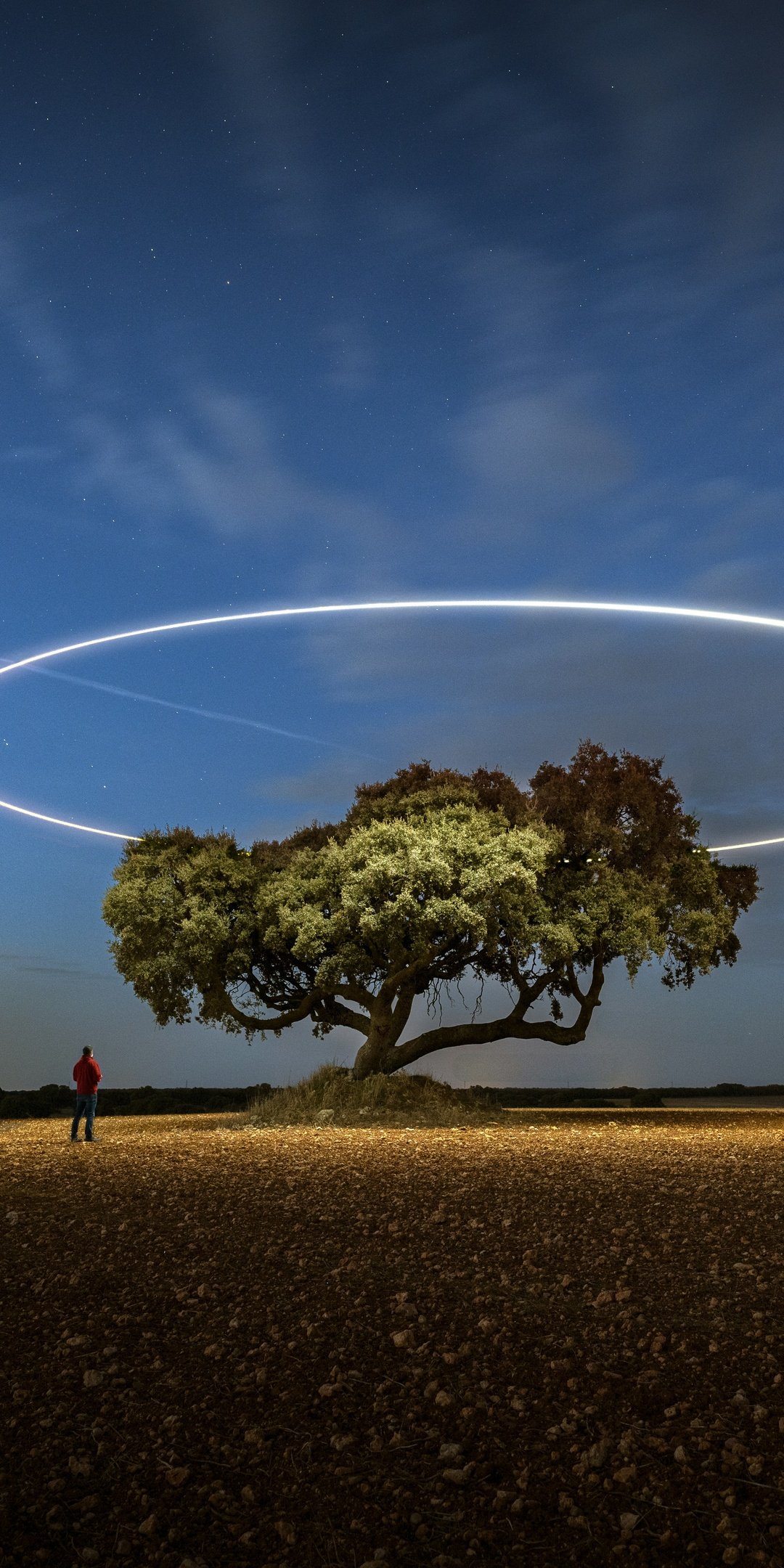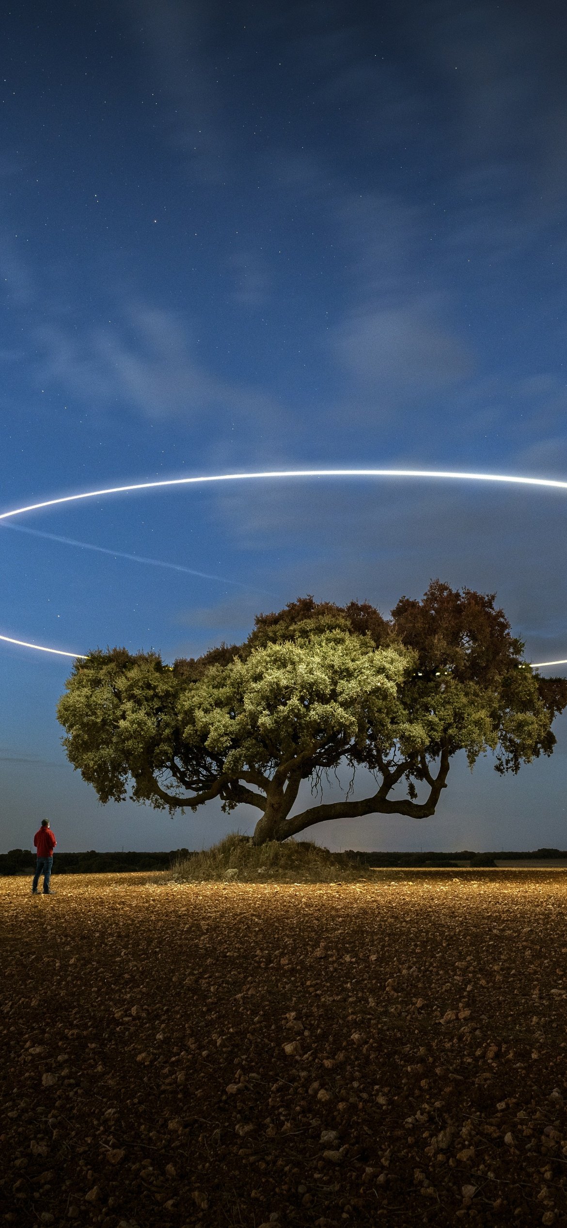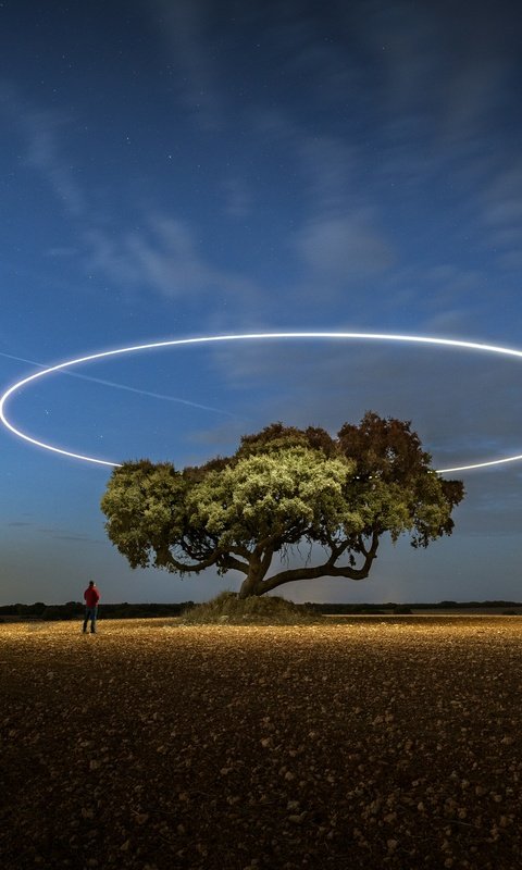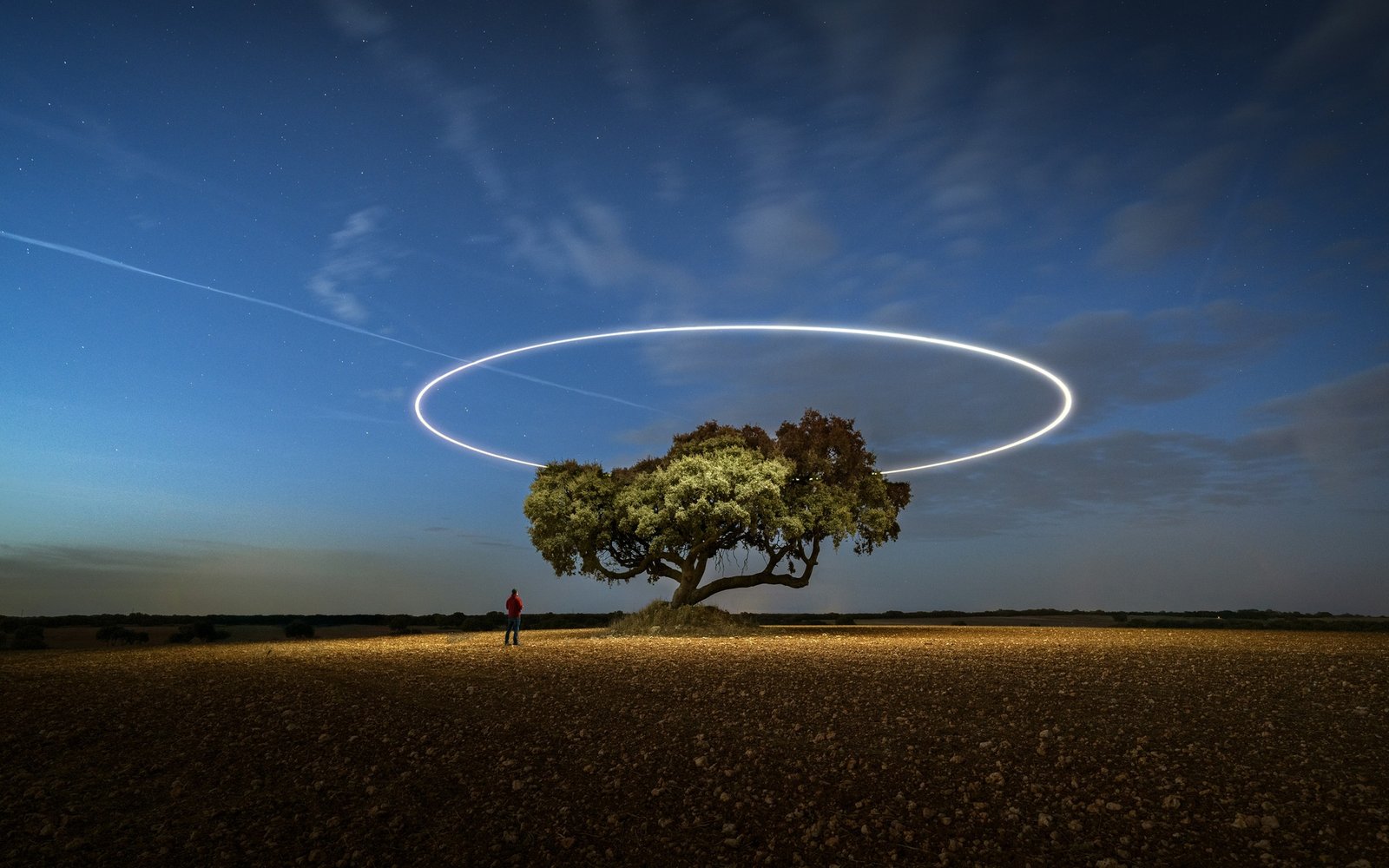 A lone tree stands quietly under a vast night sky, illuminated by a perfect glowing ring hovering above it like an otherworldly halo. The soft gradient of twilight blends into deep blue, while subtle stars and a passing light trail add motion to the stillness. The open field stretches endlessly, emphasizing solitude and scale, while the small human figure nearby enhances the sense of wonder, curiosity, and quiet exploration.