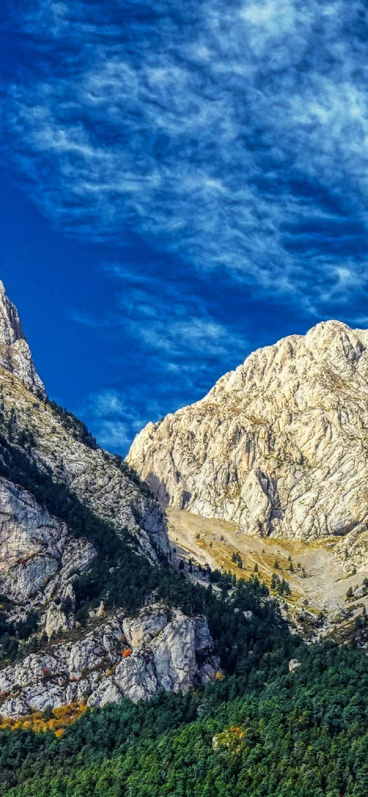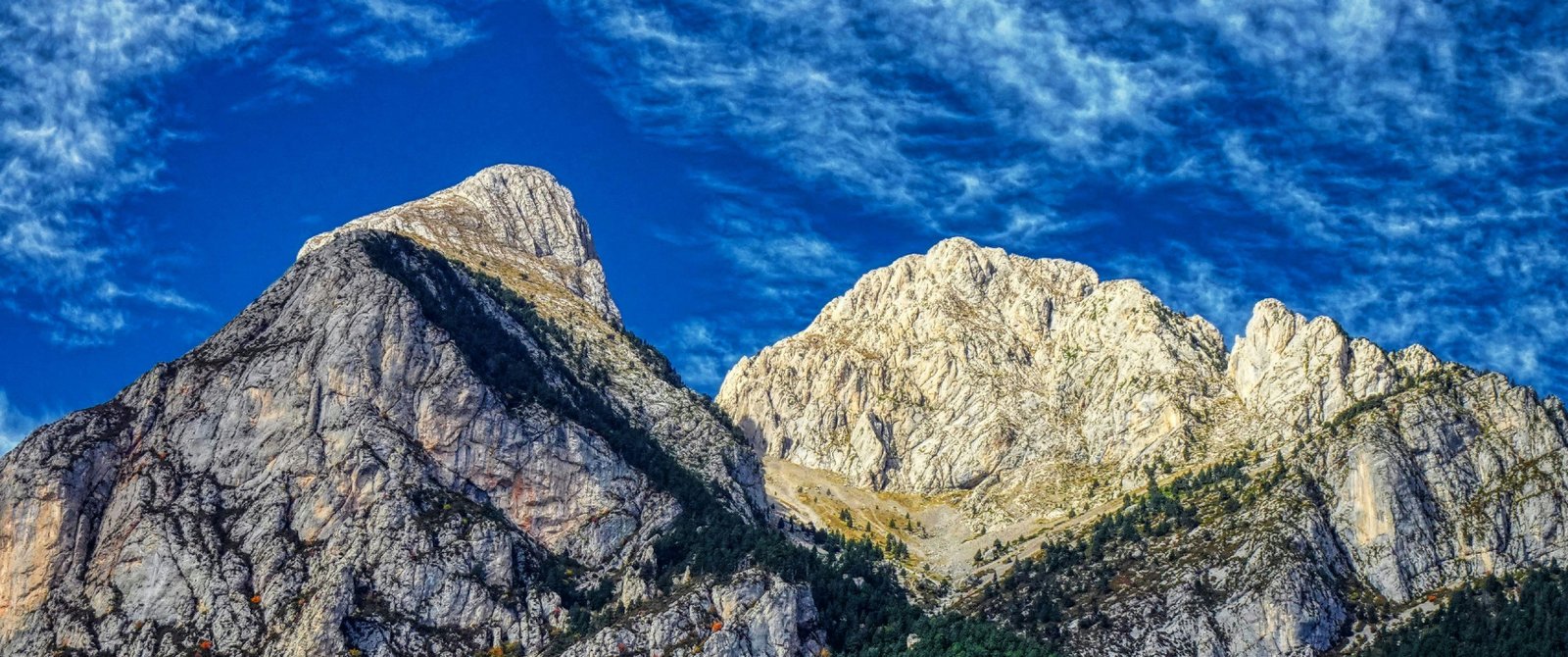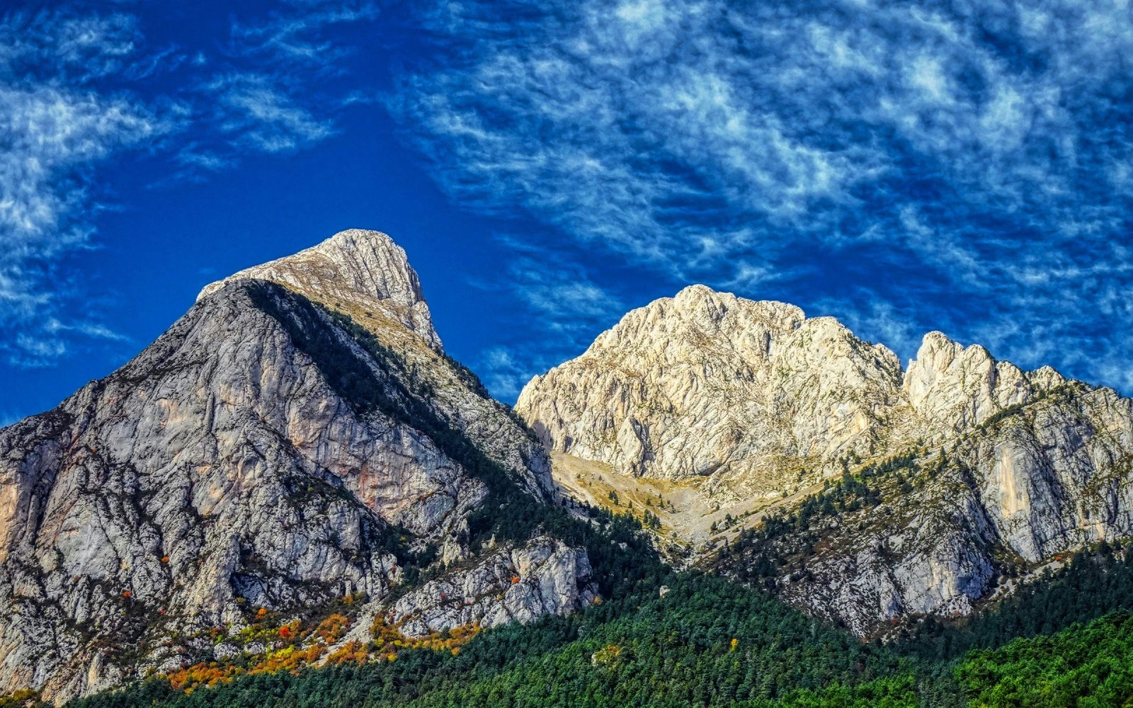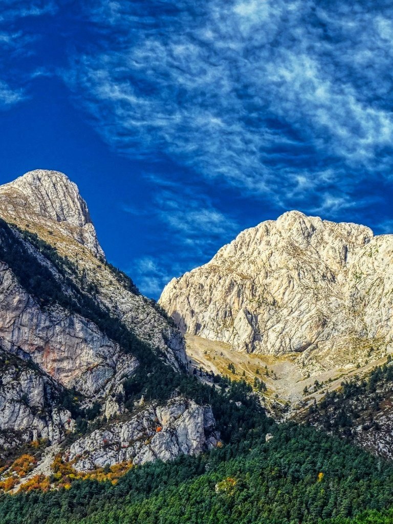 Jagged rock formations rise boldly against a deep, vivid blue sky, their textured surfaces illuminated by natural sunlight that highlights every ridge and crack carved over centuries. Below, dense green forests blanket the foothills, adding contrast and depth to the towering peaks above. The scattered clouds swirl like brushstrokes across the sky, enhancing the dramatic atmosphere and giving the entire scene a sense of scale, serenity, and timeless beauty.