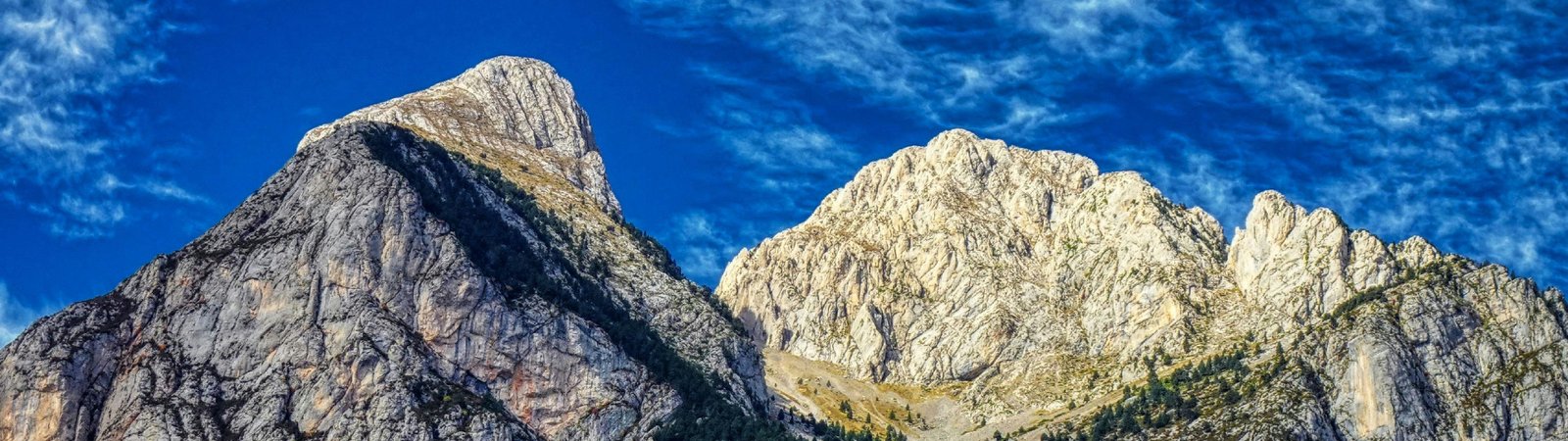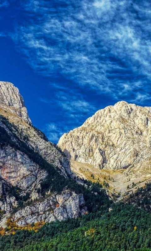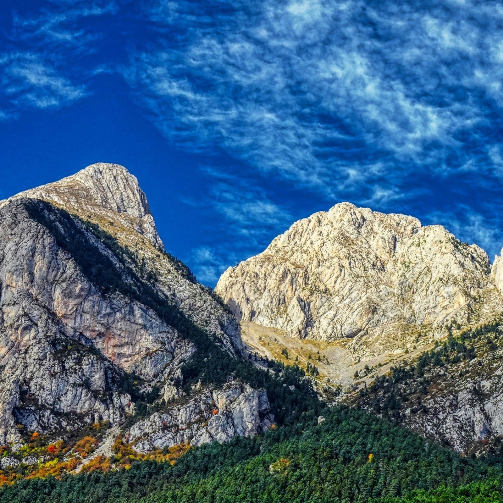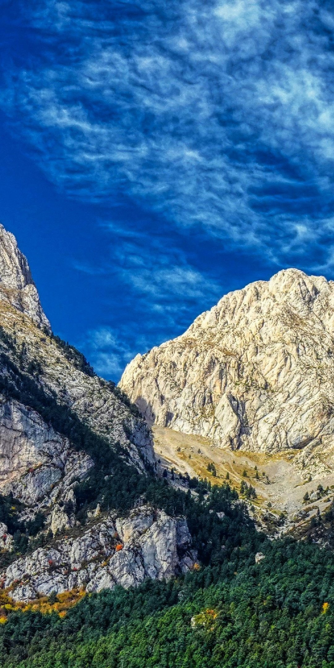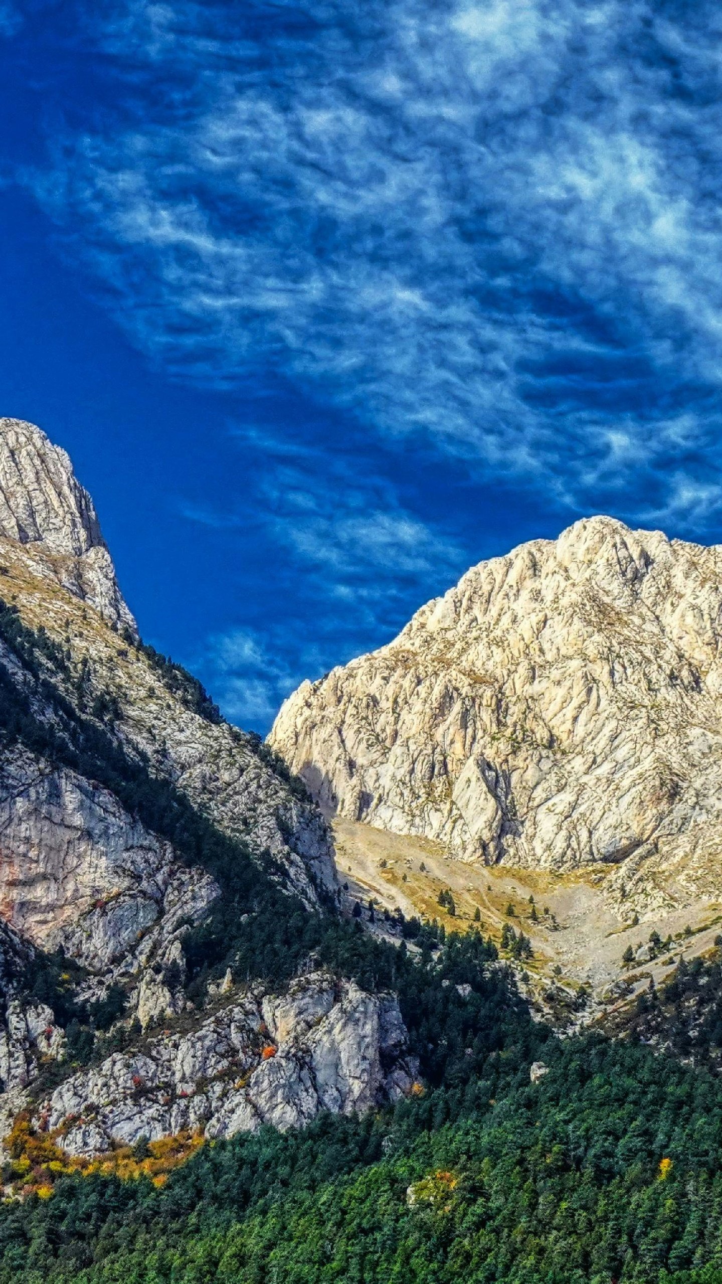 Jagged rock formations rise boldly against a deep, vivid blue sky, their textured surfaces illuminated by natural sunlight that highlights every ridge and crack carved over centuries. Below, dense green forests blanket the foothills, adding contrast and depth to the towering peaks above. The scattered clouds swirl like brushstrokes across the sky, enhancing the dramatic atmosphere and giving the entire scene a sense of scale, serenity, and timeless beauty.