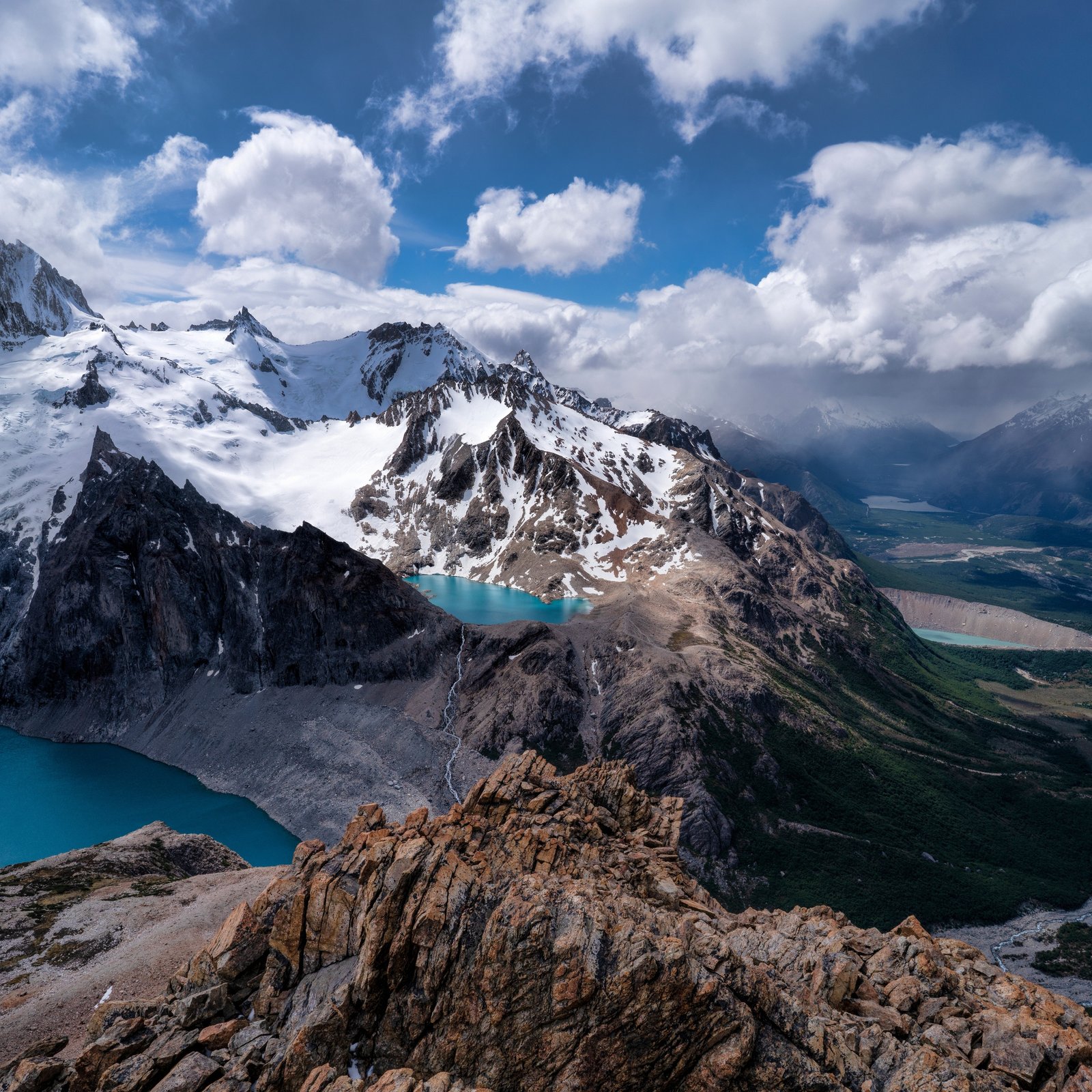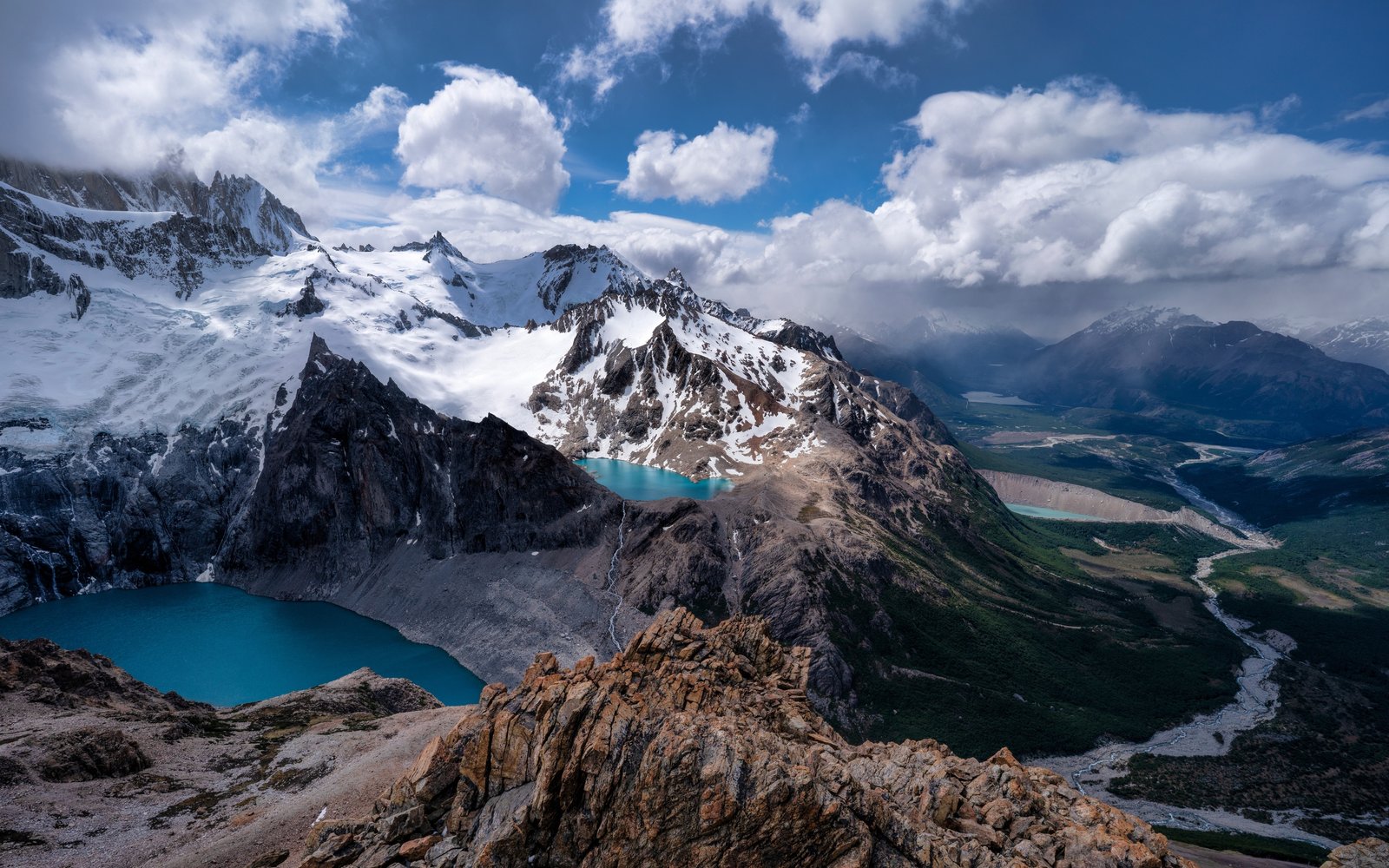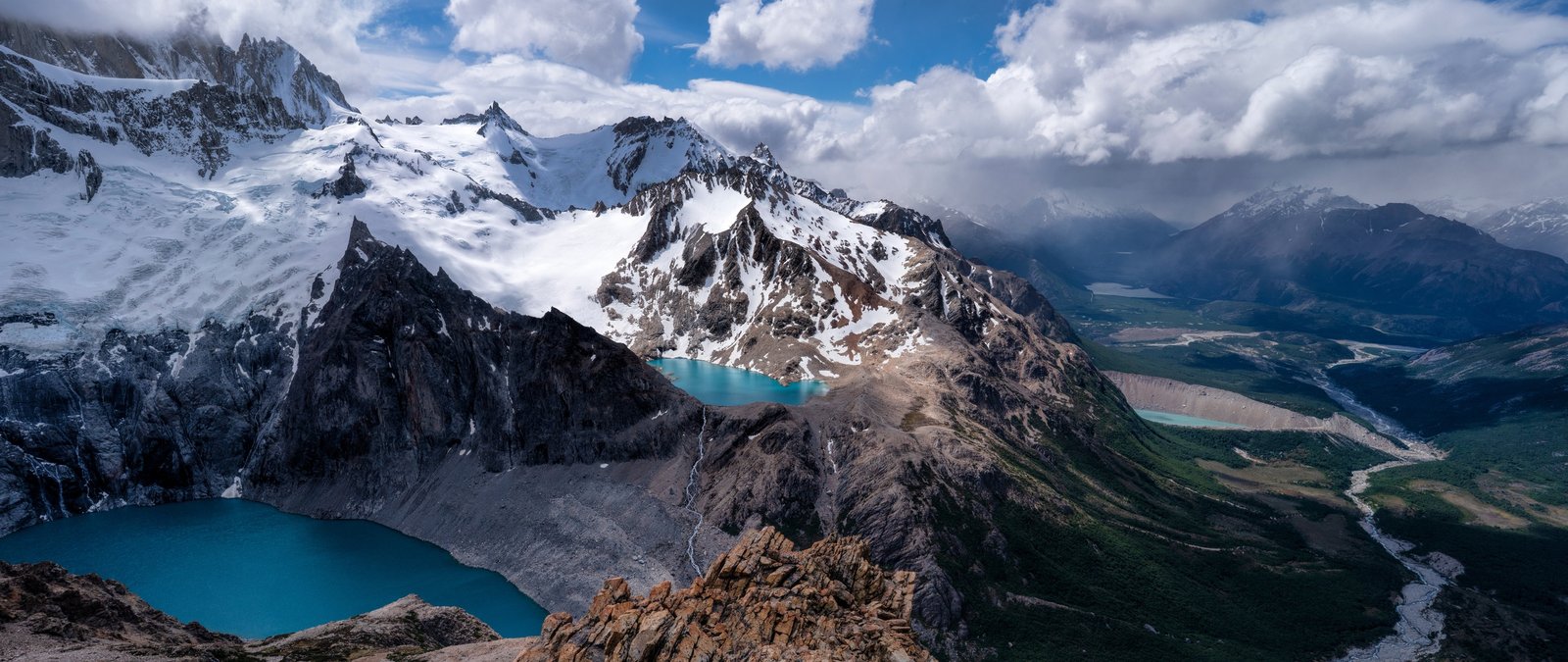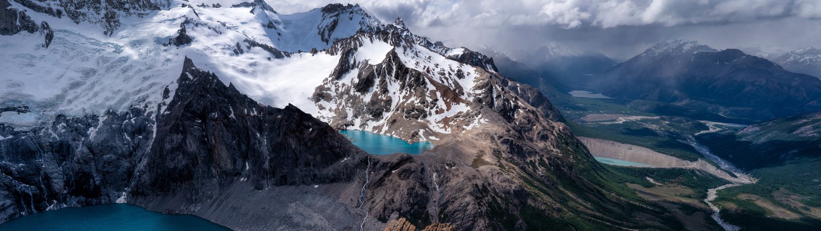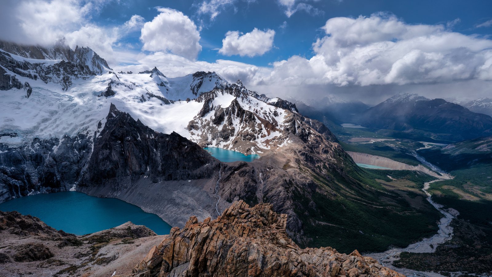 Towering snow-capped peaks stretch across the horizon, their rugged edges carving into a sky filled with drifting clouds and soft sunlight. Below, vibrant turquoise lakes sit quietly between rocky ridges, reflecting the vastness around them. The winding valley flows deep into the distance, guiding the eye through layers of terrain that shift from icy heights to lush greenery, creating a powerful sense of scale and serenity.