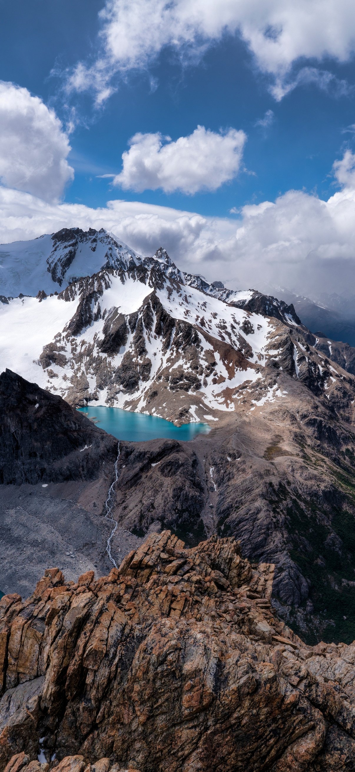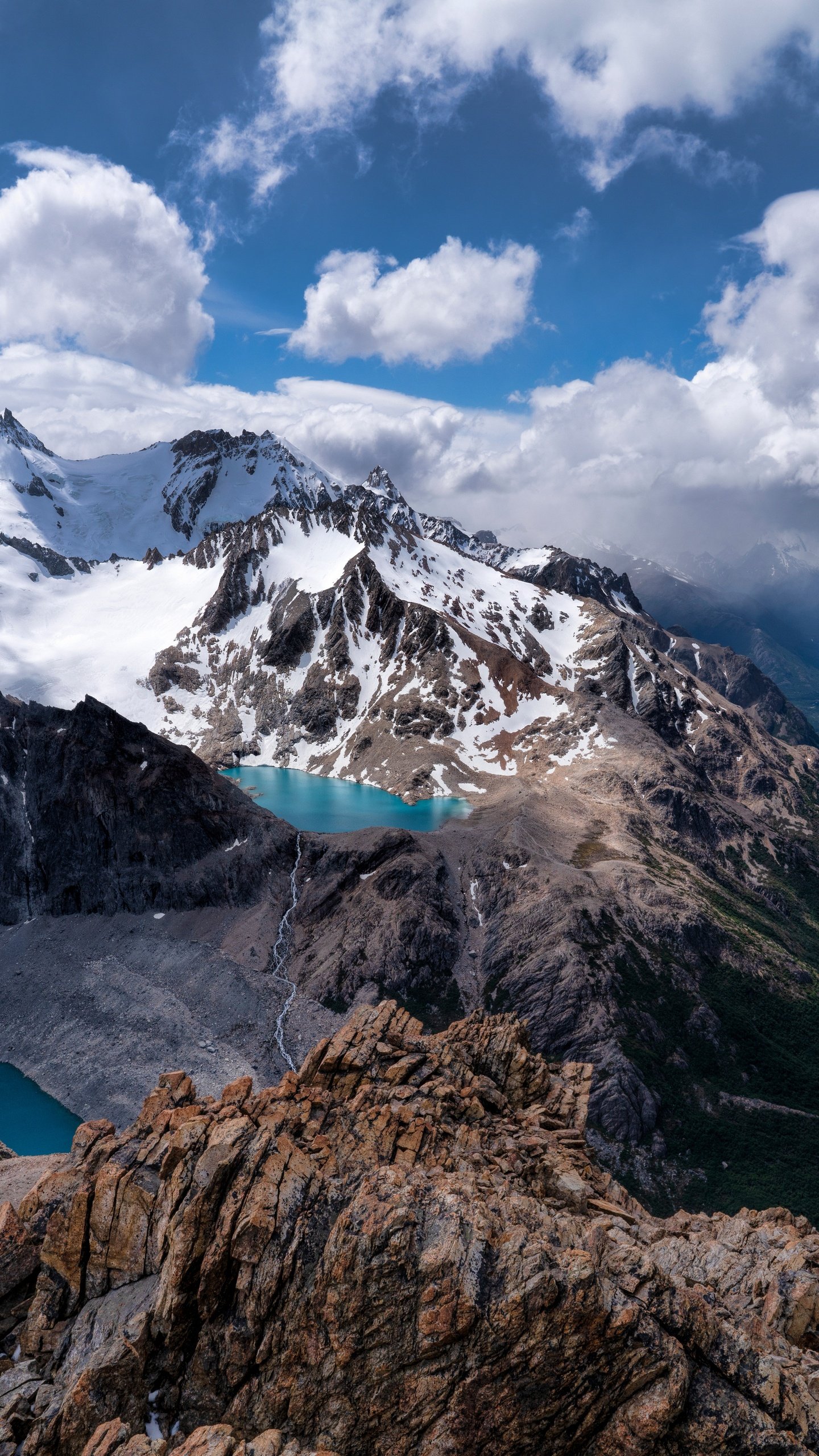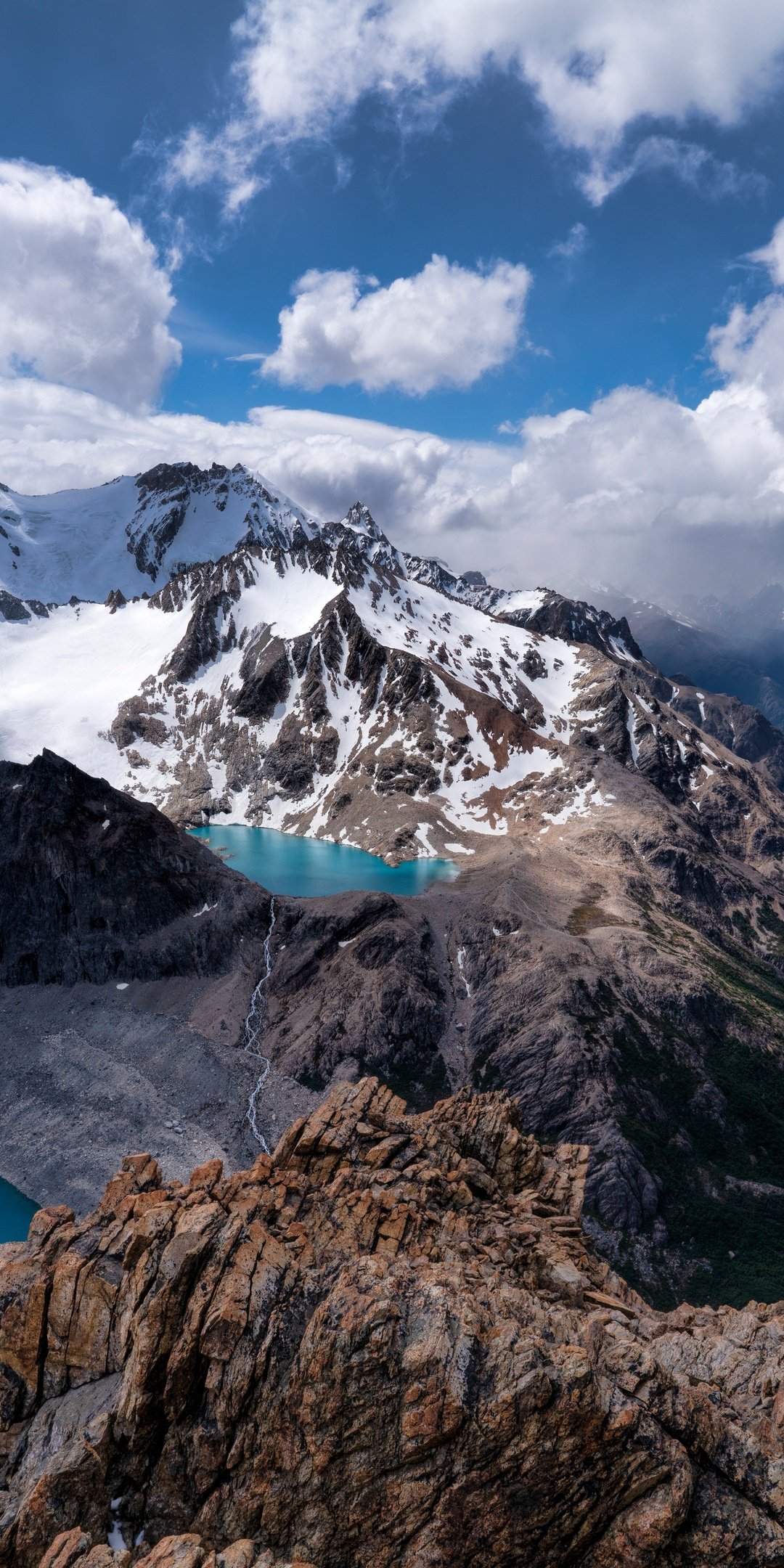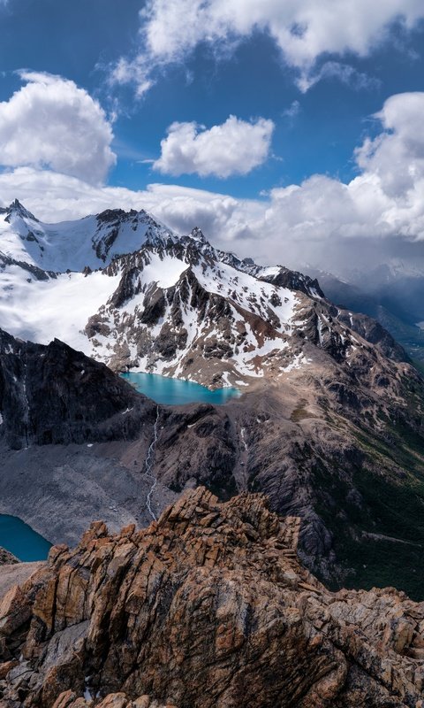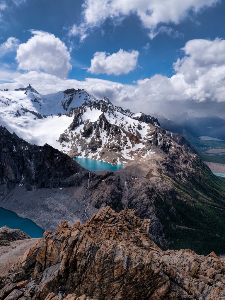 Towering snow-capped peaks stretch across the horizon, their rugged edges carving into a sky filled with drifting clouds and soft sunlight. Below, vibrant turquoise lakes sit quietly between rocky ridges, reflecting the vastness around them. The winding valley flows deep into the distance, guiding the eye through layers of terrain that shift from icy heights to lush greenery, creating a powerful sense of scale and serenity.