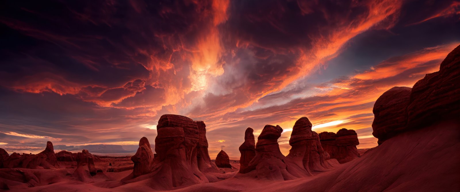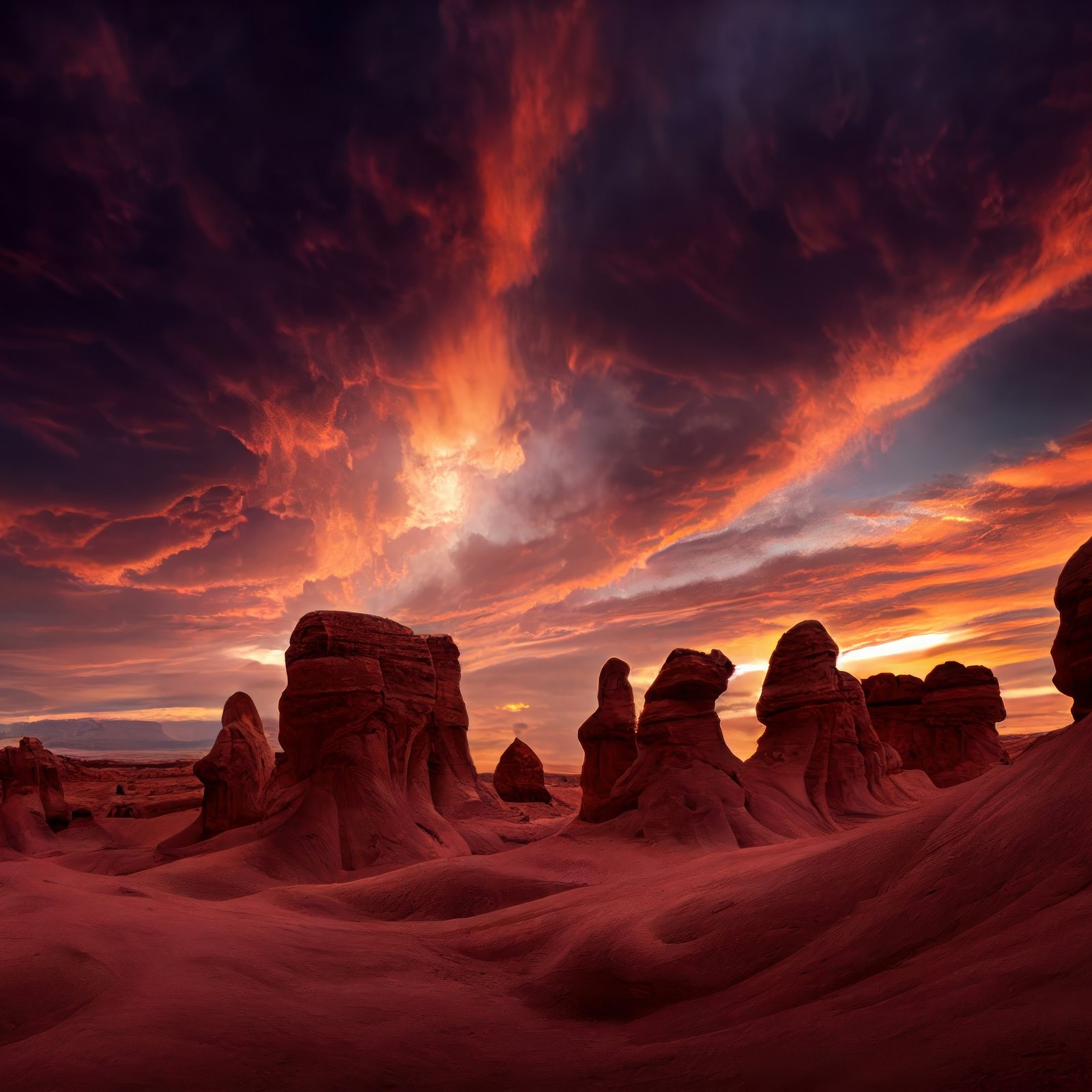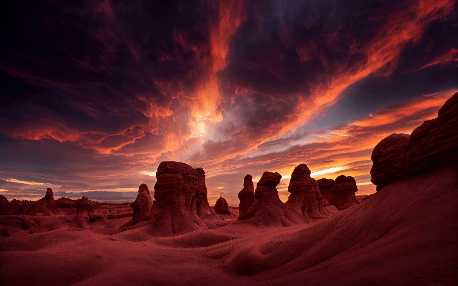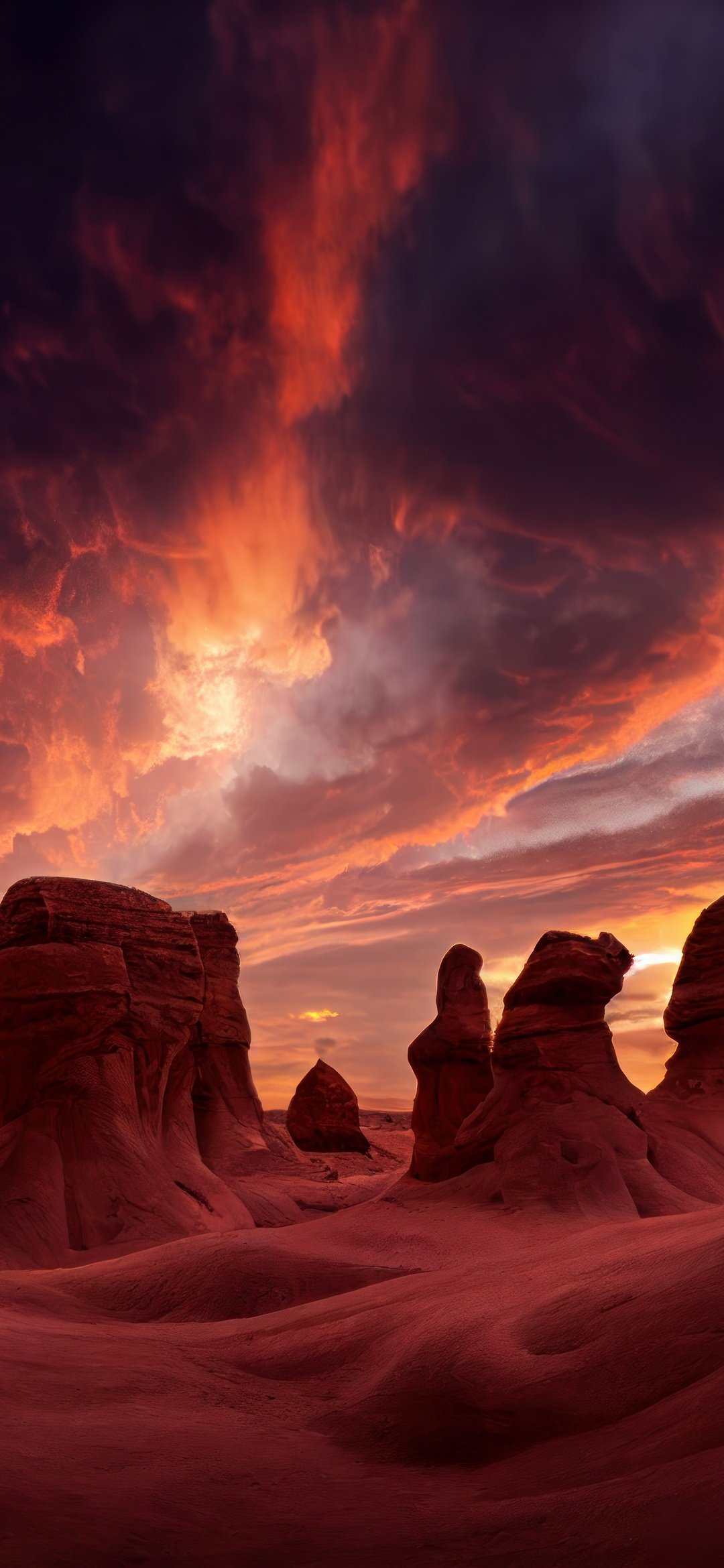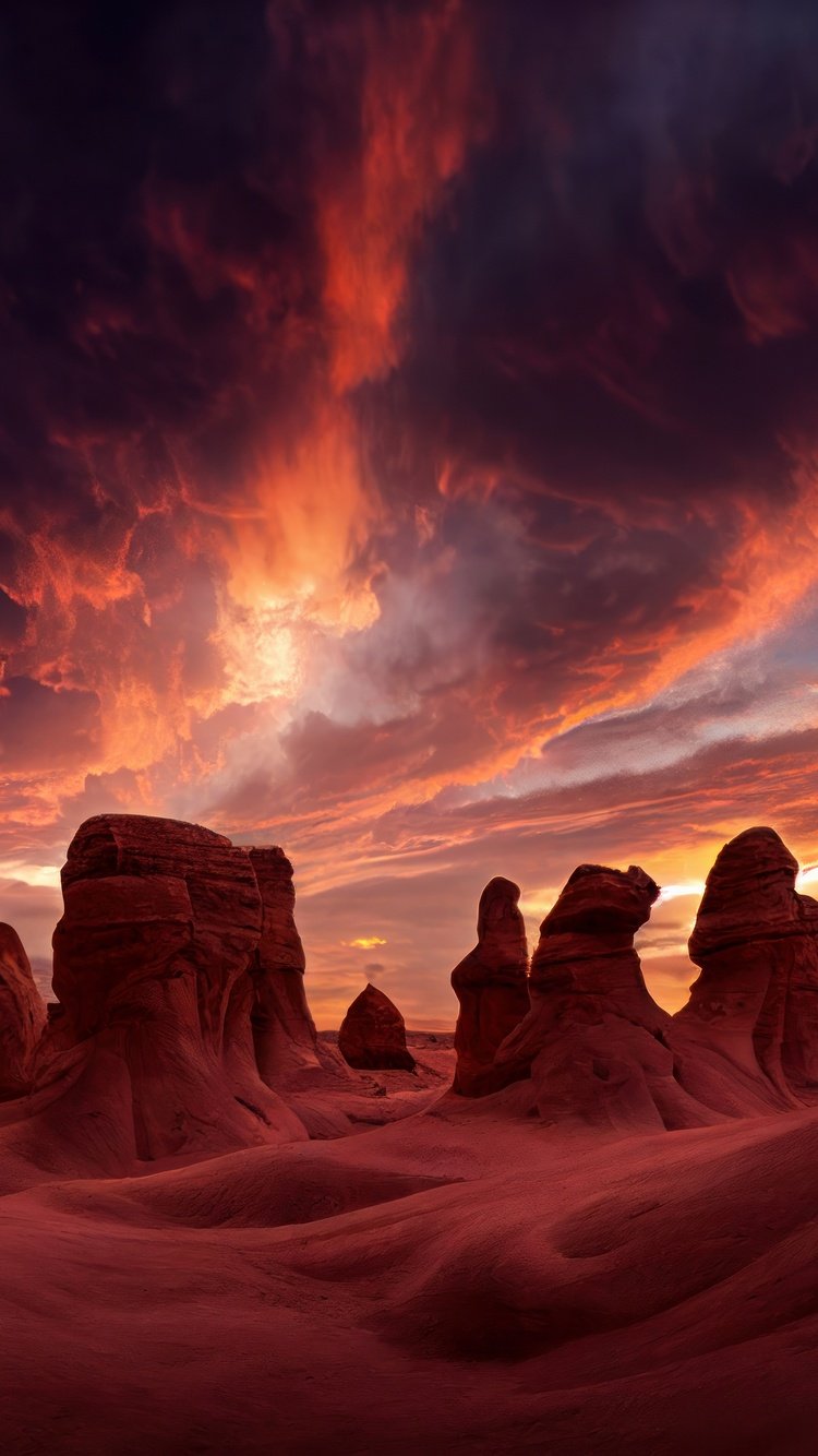 Download this Sunset in the Heart of the Canyon Wallpaper and lose yourself in the fire of the evening sky. The desert stands silent under a storm of color as the sun sinks beneath the horizon, igniting the canyon walls in shades of crimson and gold. Sculpted rock formations rise like ancient guardians, their shadows stretching long across the rippled earth. The clouds swirl with vibrant hues of orange, magenta, and indigo, painting a masterpiece of nature’s final light. It’s a breathtaking moment — raw, vast, and timeless.