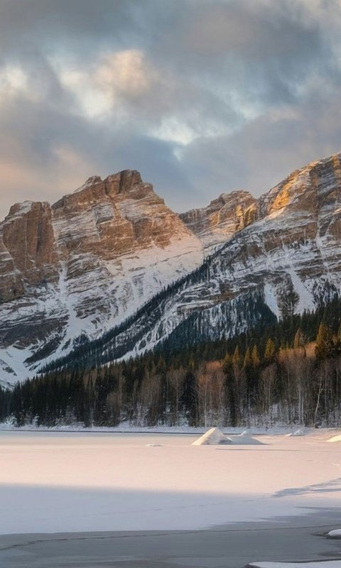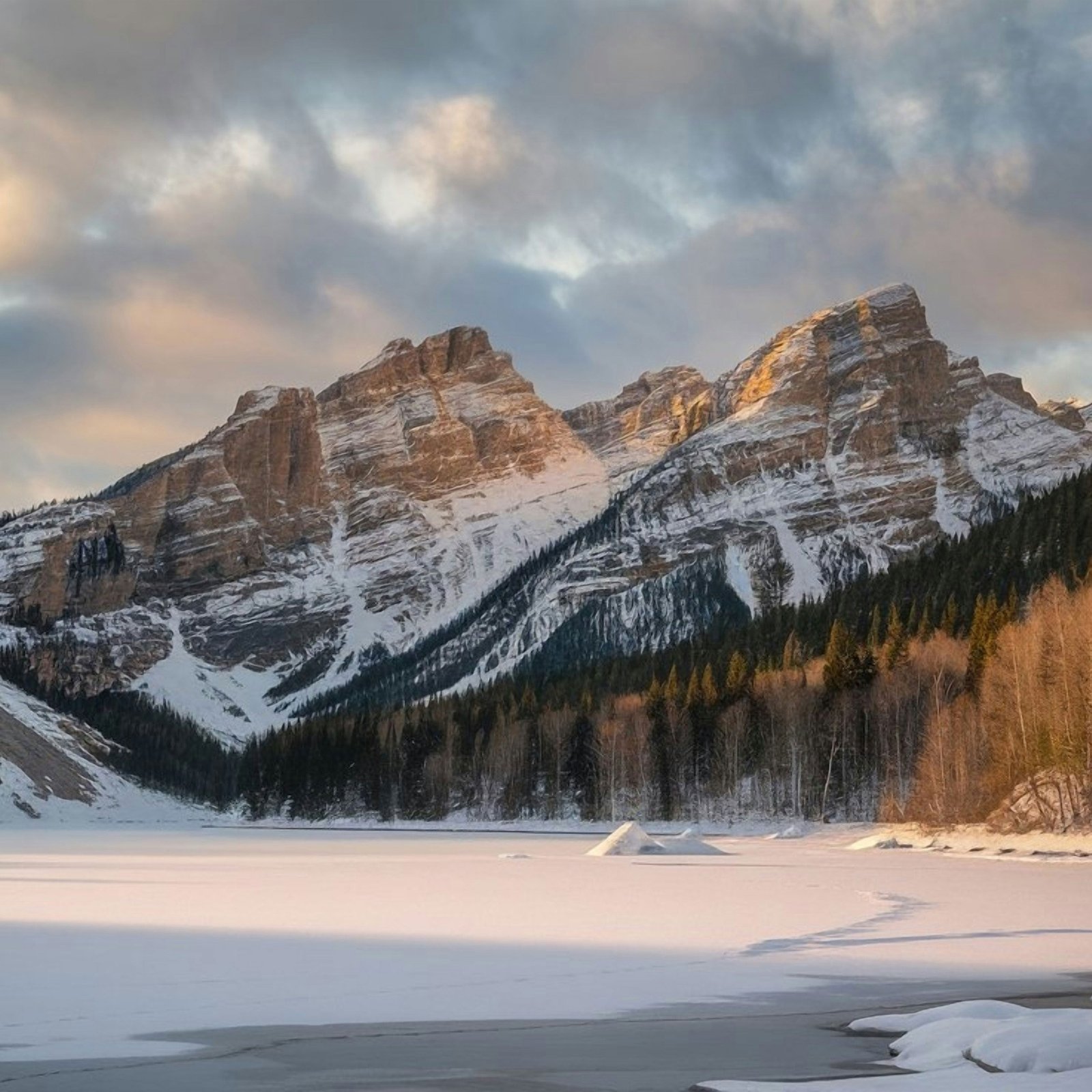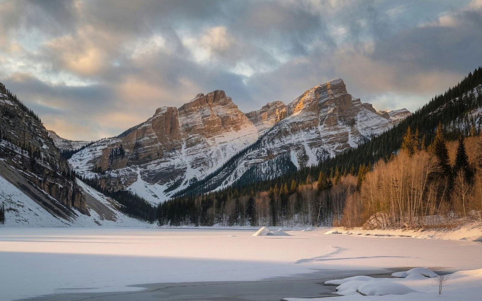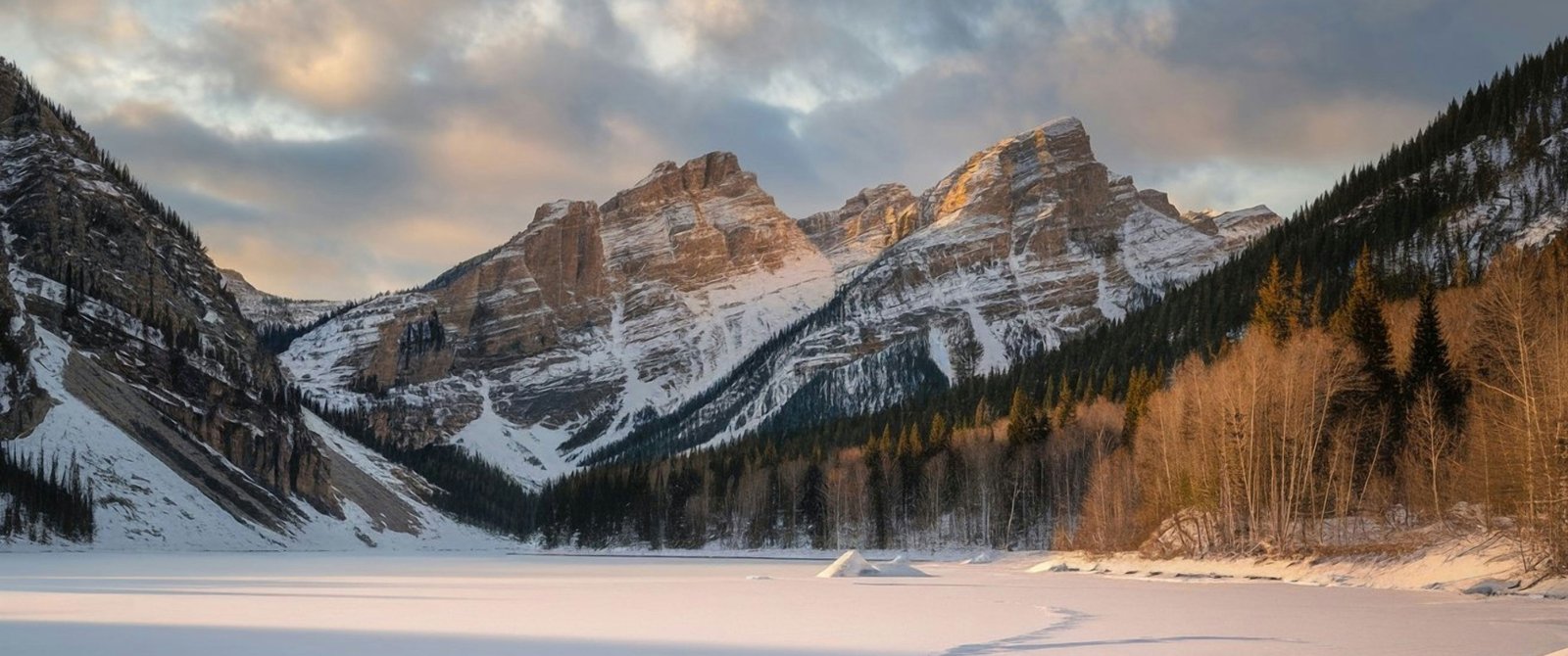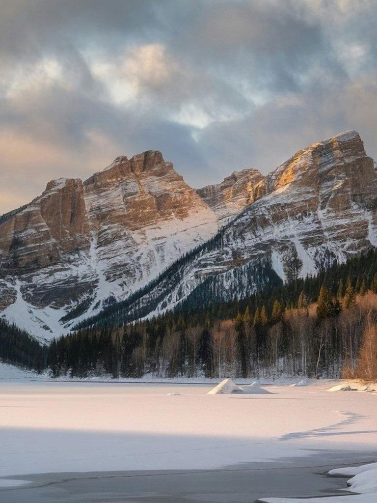 A vast frozen lake stretches across the valley, its smooth icy surface reflecting the soft golden light of sunrise. Towering mountains rise in the distance, their rugged faces dusted with fresh snow while clusters of evergreen trees stand along the edges, adding depth and contrast. The sky glows with gentle clouds painted in warm hues, creating a tranquil atmosphere that feels untouched and timeless.