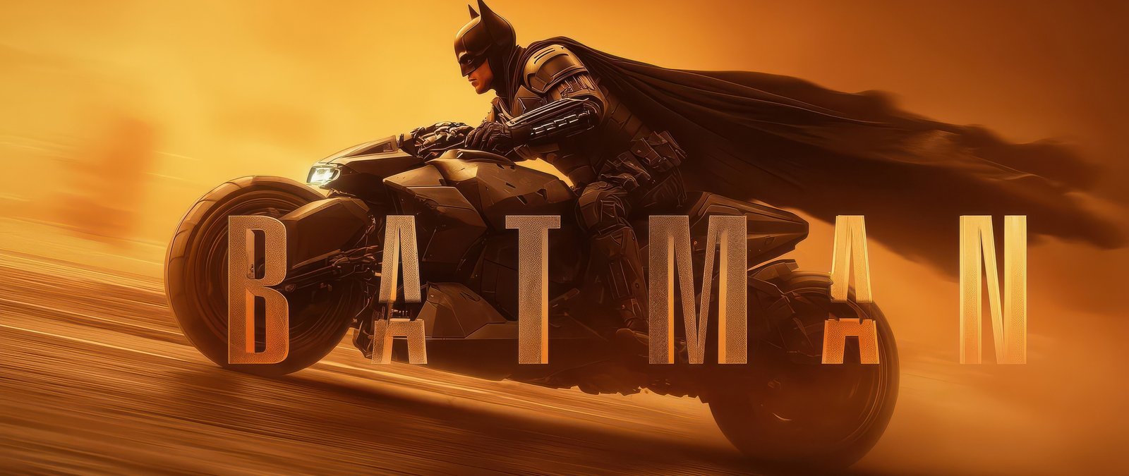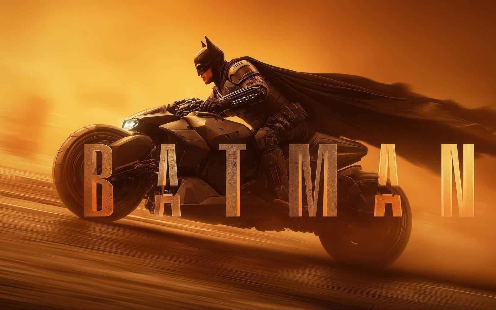 Batman tears across a blazing desert landscape on the Batcycle, his cape streaming wildly behind him as golden light floods the scene. The intense motion blur, dust trails, and cinematic lighting create a sense of unstoppable momentum, while the powerful silhouette of the Batcycle dominates the frame. Every detail—from the armored suit to the aggressive bike design—captures the raw intensity and precision of Gotham’s silent guardian in pursuit.