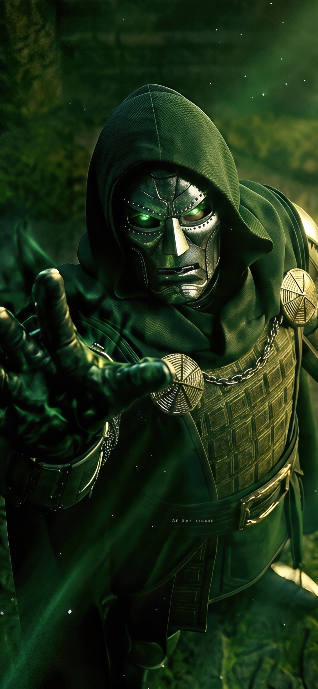 The rich green aura and detailed armor create a cinematic and commanding presence, capturing Doom’s intelligence, dominance, and mystical power. Every element in the scene reflects his status as a ruler, a sorcerer, and a force beyond control.