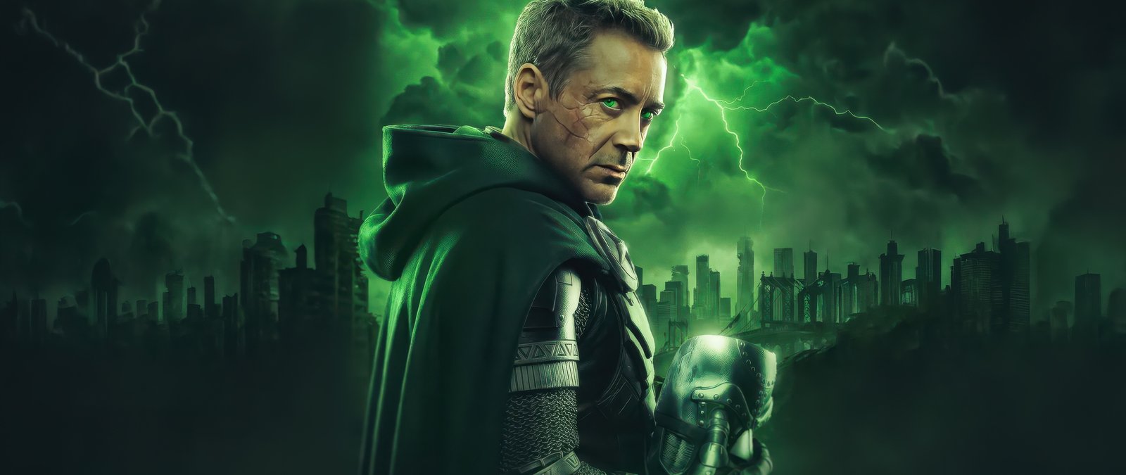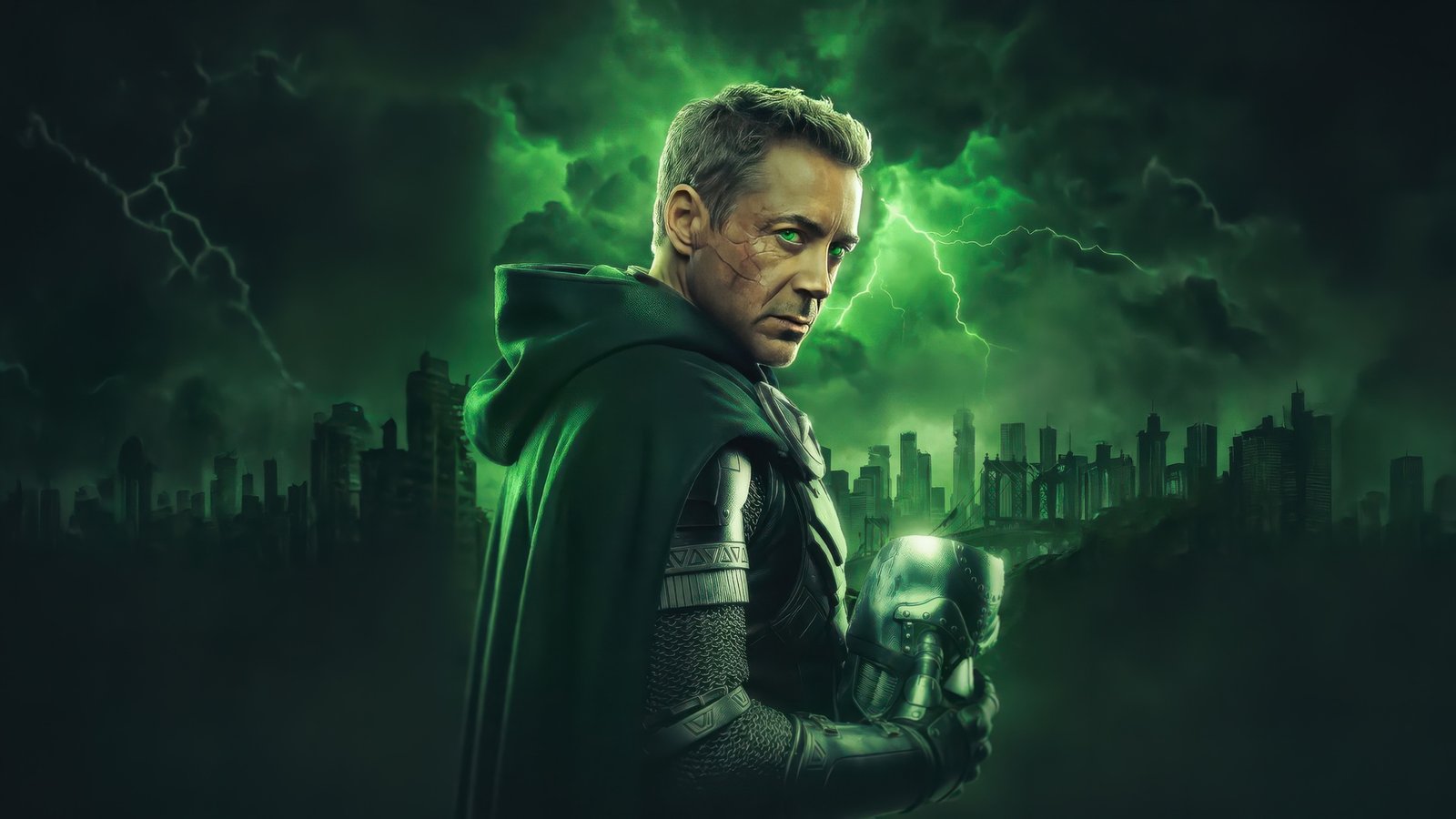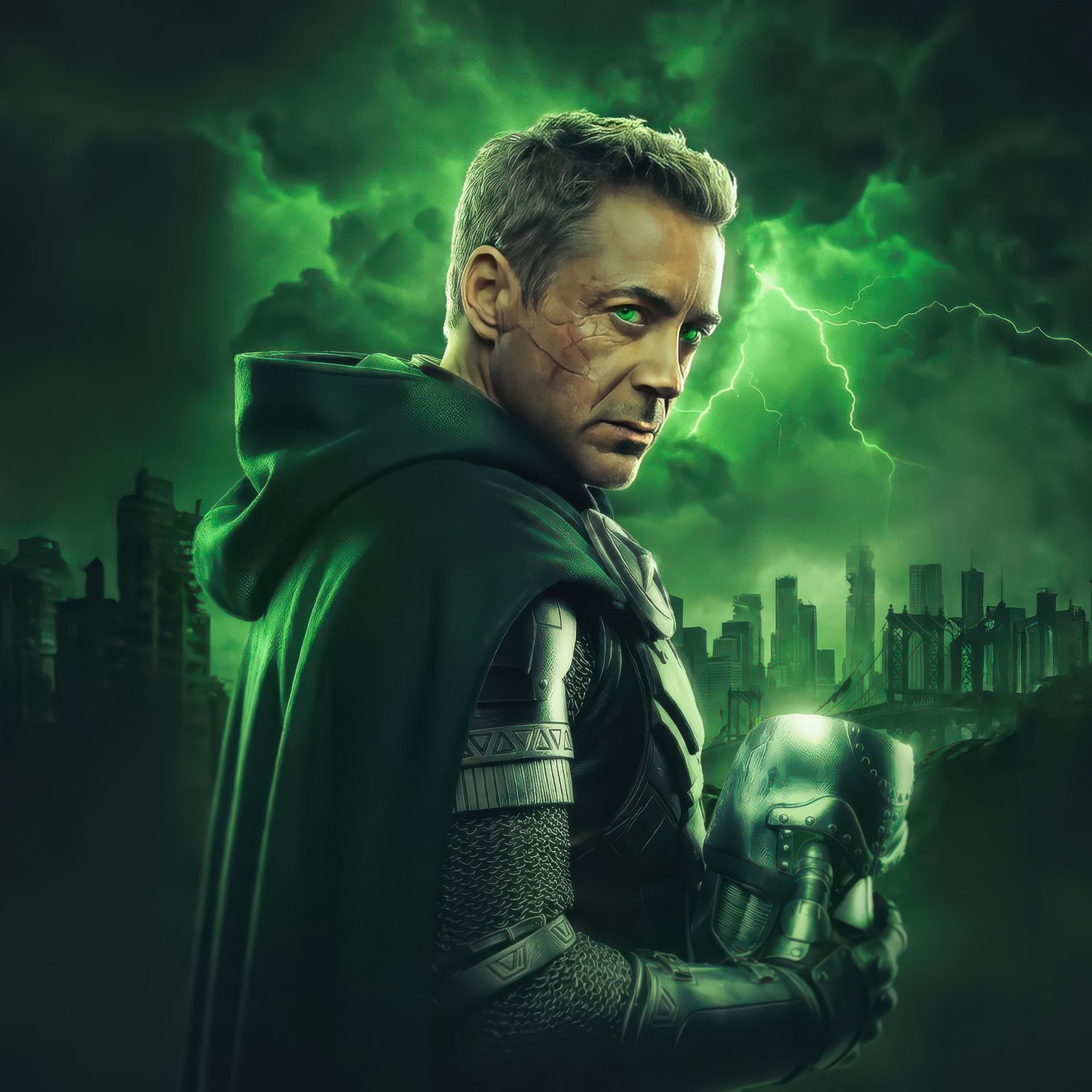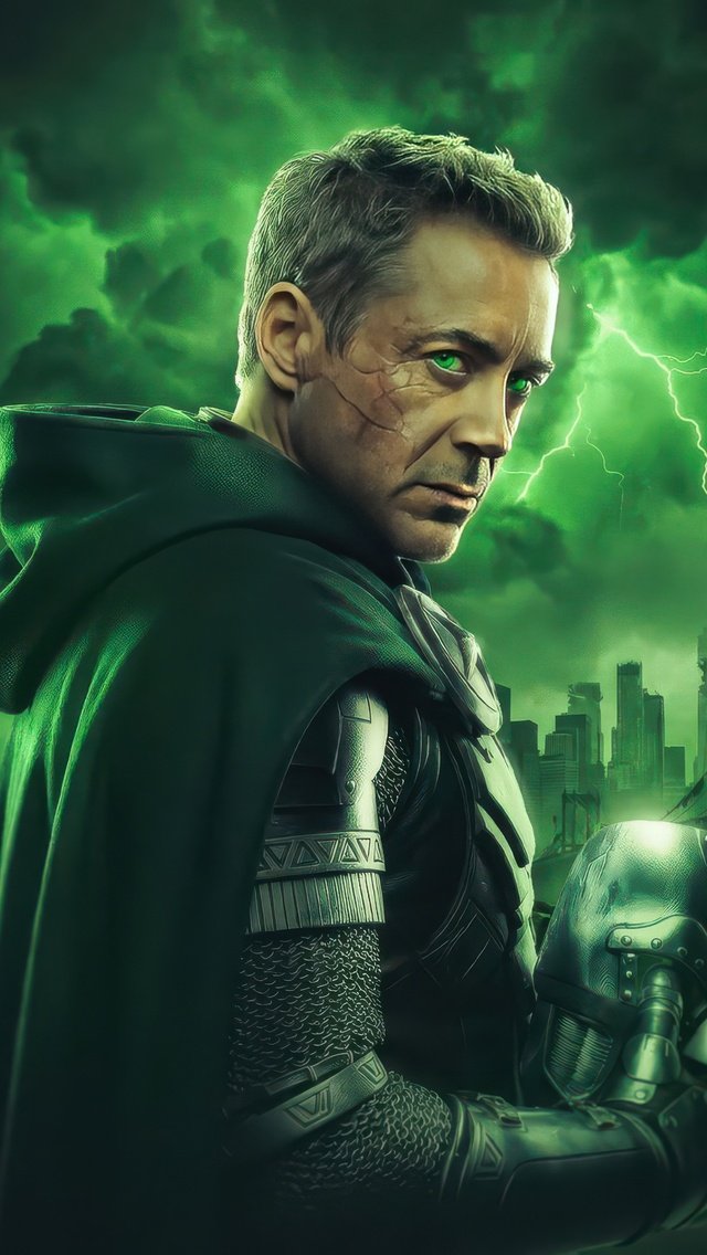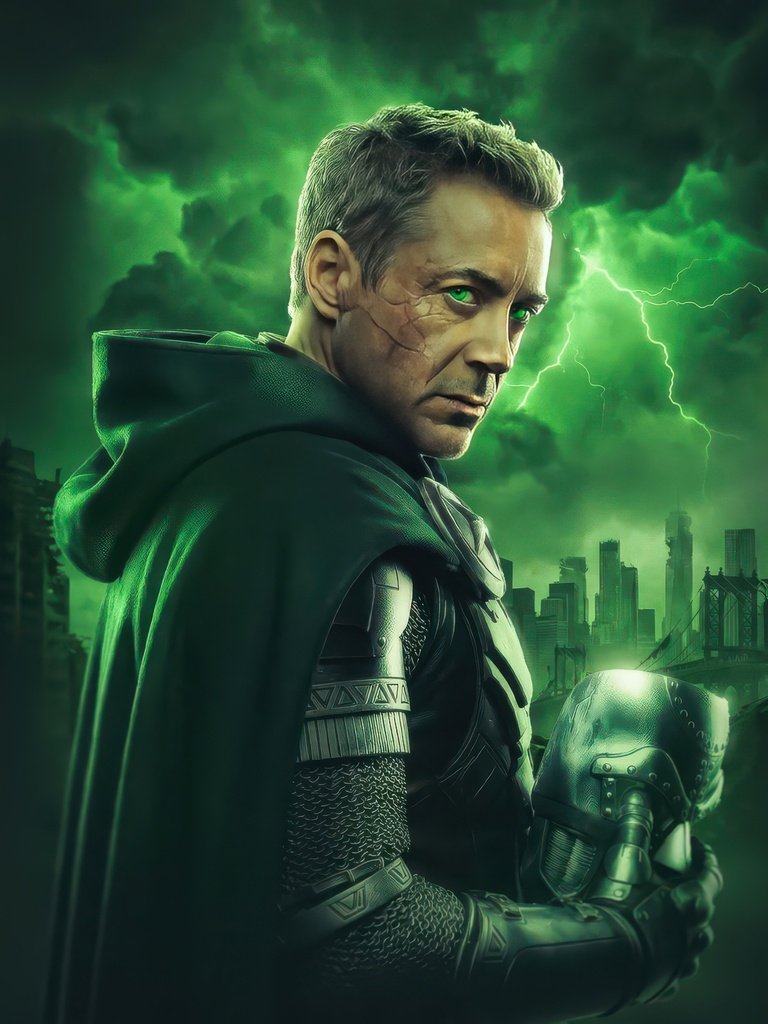 Cloaked in shadow and illuminated by an eerie green glow, Doctor Doom stands against a storm-torn skyline, his presence commanding fear and respect. Lightning cracks across the sky, echoing the raw power coursing through him, while his piercing gaze cuts through the darkness like a warning to the world below. The detailed armor, flowing cape, and ominous atmosphere combine to create a scene that feels both regal and apocalyptic, capturing the essence of one of Marvel’s most iconic villains.