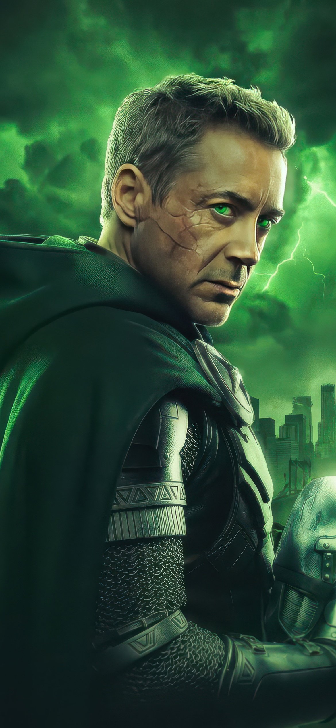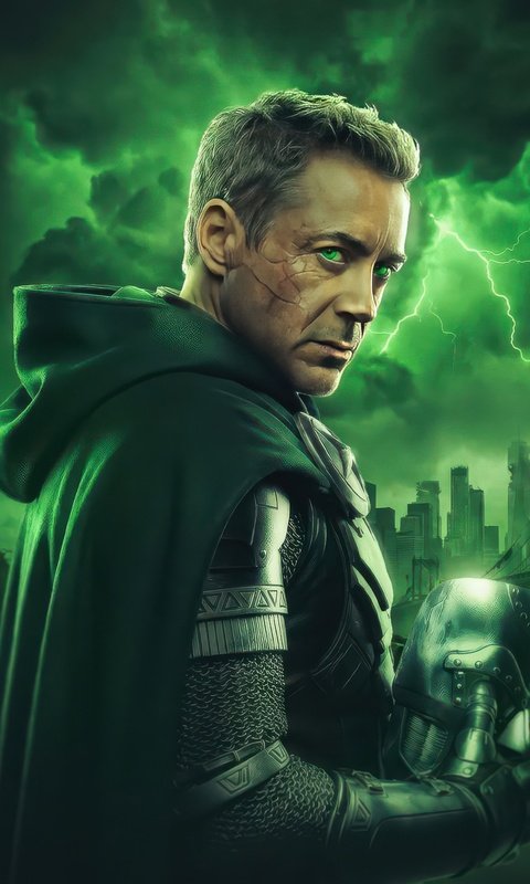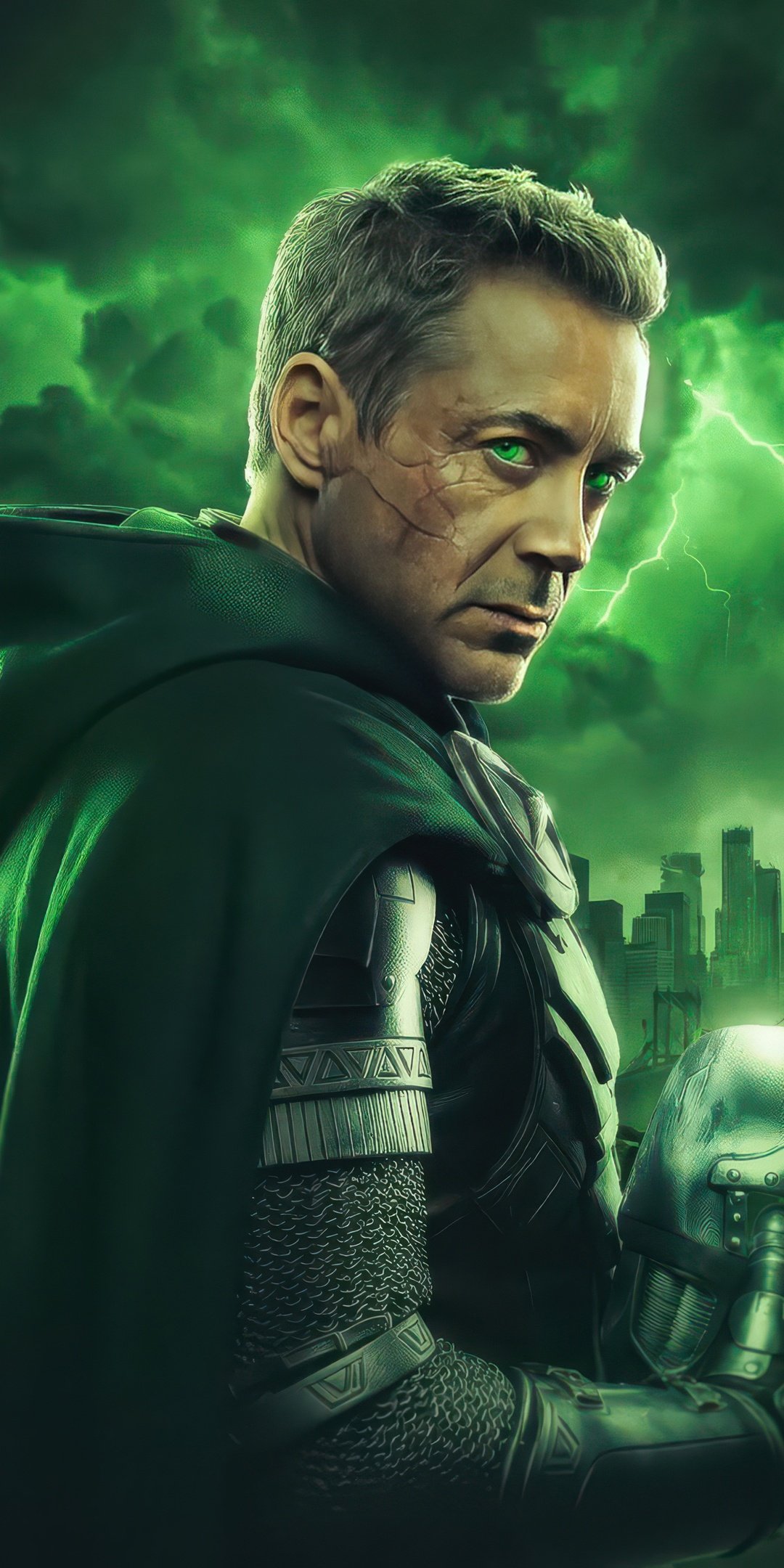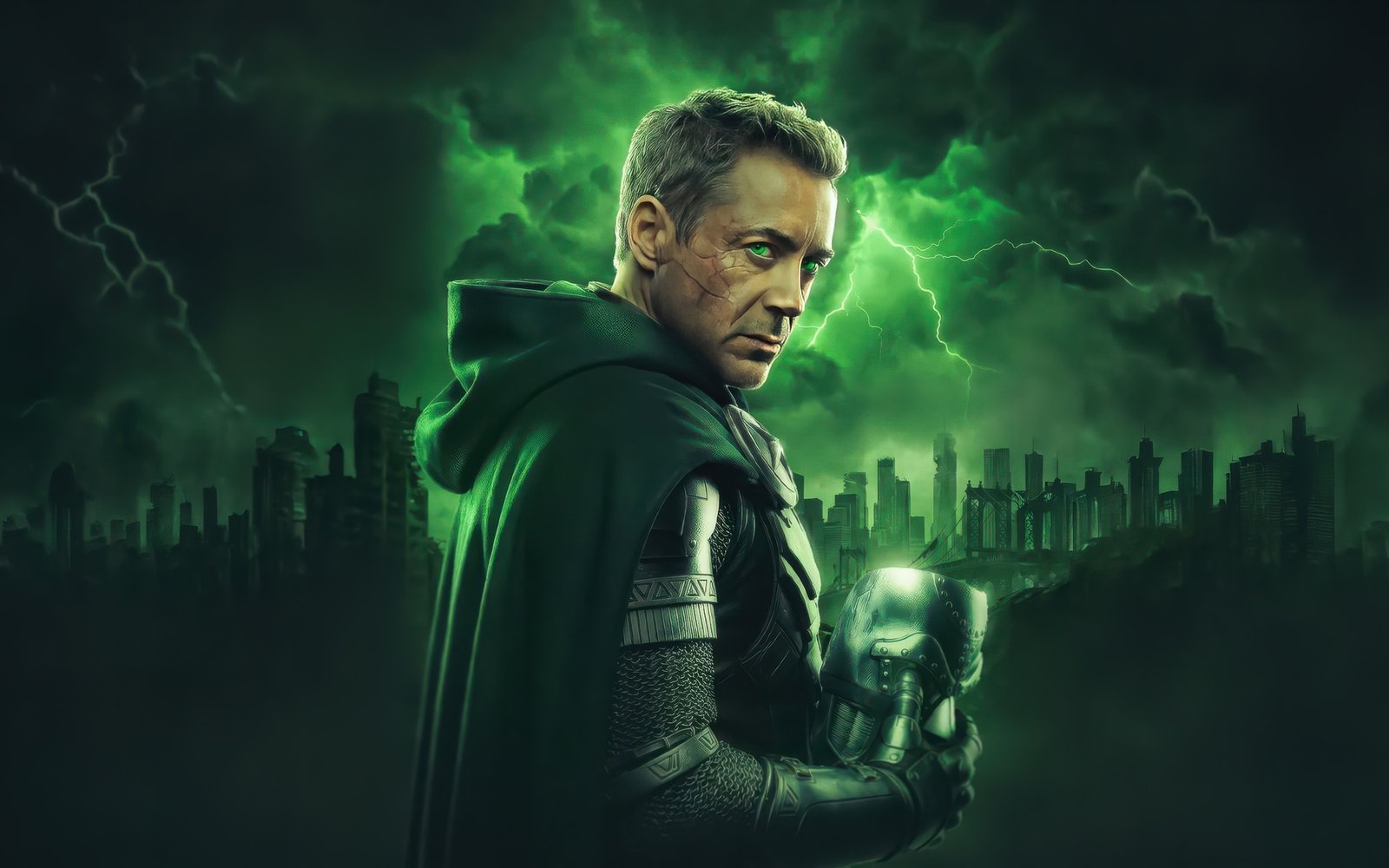 Cloaked in shadow and illuminated by an eerie green glow, Doctor Doom stands against a storm-torn skyline, his presence commanding fear and respect. Lightning cracks across the sky, echoing the raw power coursing through him, while his piercing gaze cuts through the darkness like a warning to the world below. The detailed armor, flowing cape, and ominous atmosphere combine to create a scene that feels both regal and apocalyptic, capturing the essence of one of Marvel’s most iconic villains.