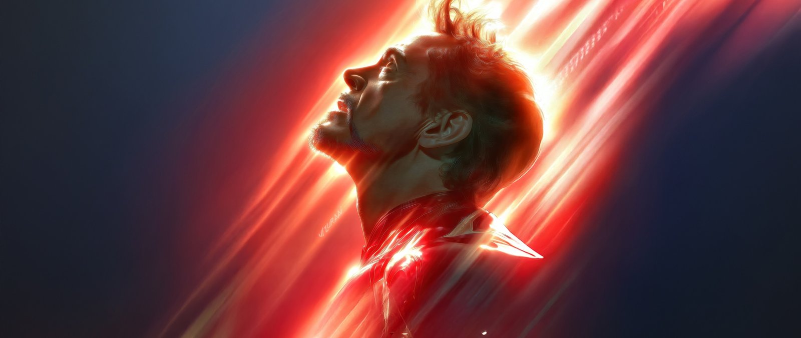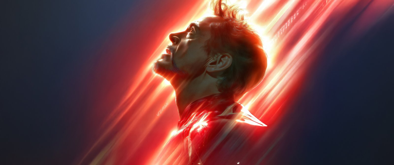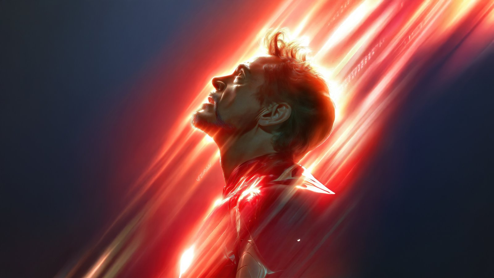 Radiant streaks of fiery red and golden light cut through the darkness, converging around Iron Man’s glowing arc reactor and casting dramatic highlights across his armor. His upward gaze reflects determination and acceptance, as if standing at the edge of a defining moment. The intense motion blur of the energy beams creates a sense of unstoppable force, while the deep shadows around him emphasize both isolation and strength in a cinematic, high-impact composition.