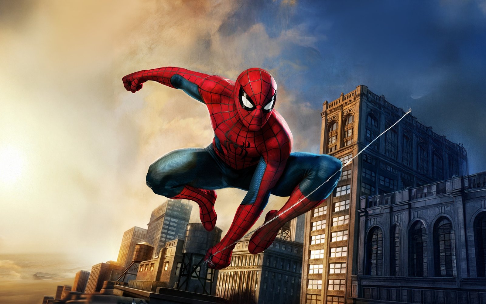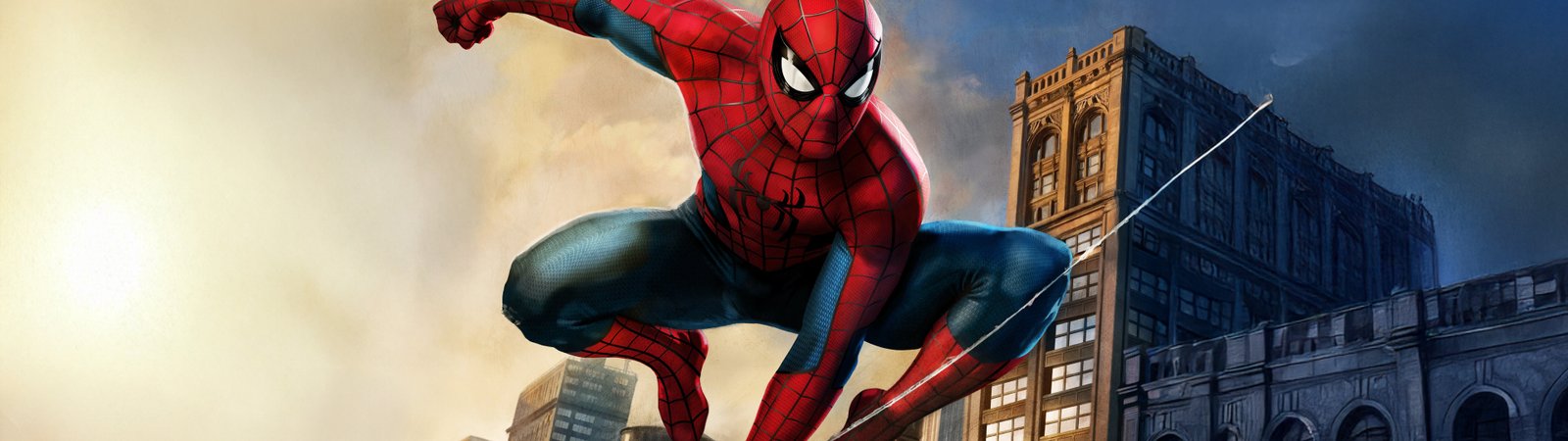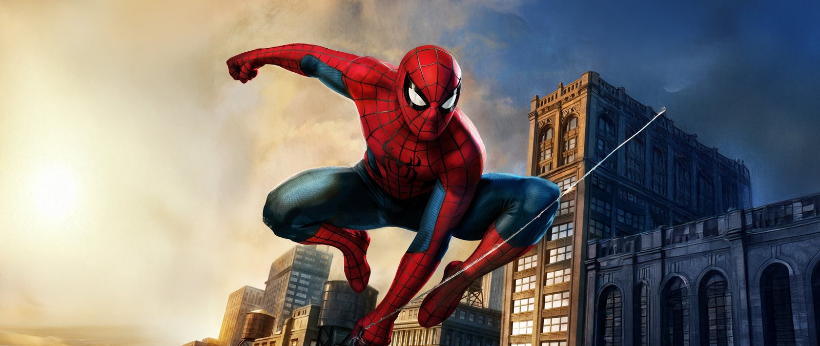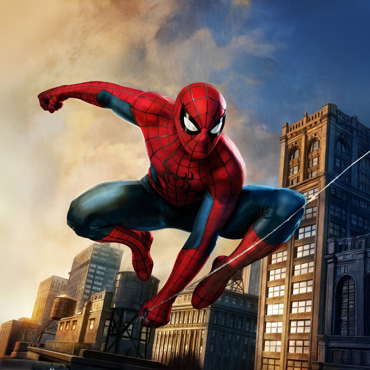 Spider-Man bursts across the skyline in a powerful mid-air pose, webline stretched as the city rises beneath him in golden-hour light. The contrast between warm sunset tones and cool urban shadows gives the scene a cinematic depth, while his iconic suit pops with sharp detail and motion energy. Buildings blur slightly in the background, emphasizing speed, agility, and that signature Spider-Man momentum that never stops.