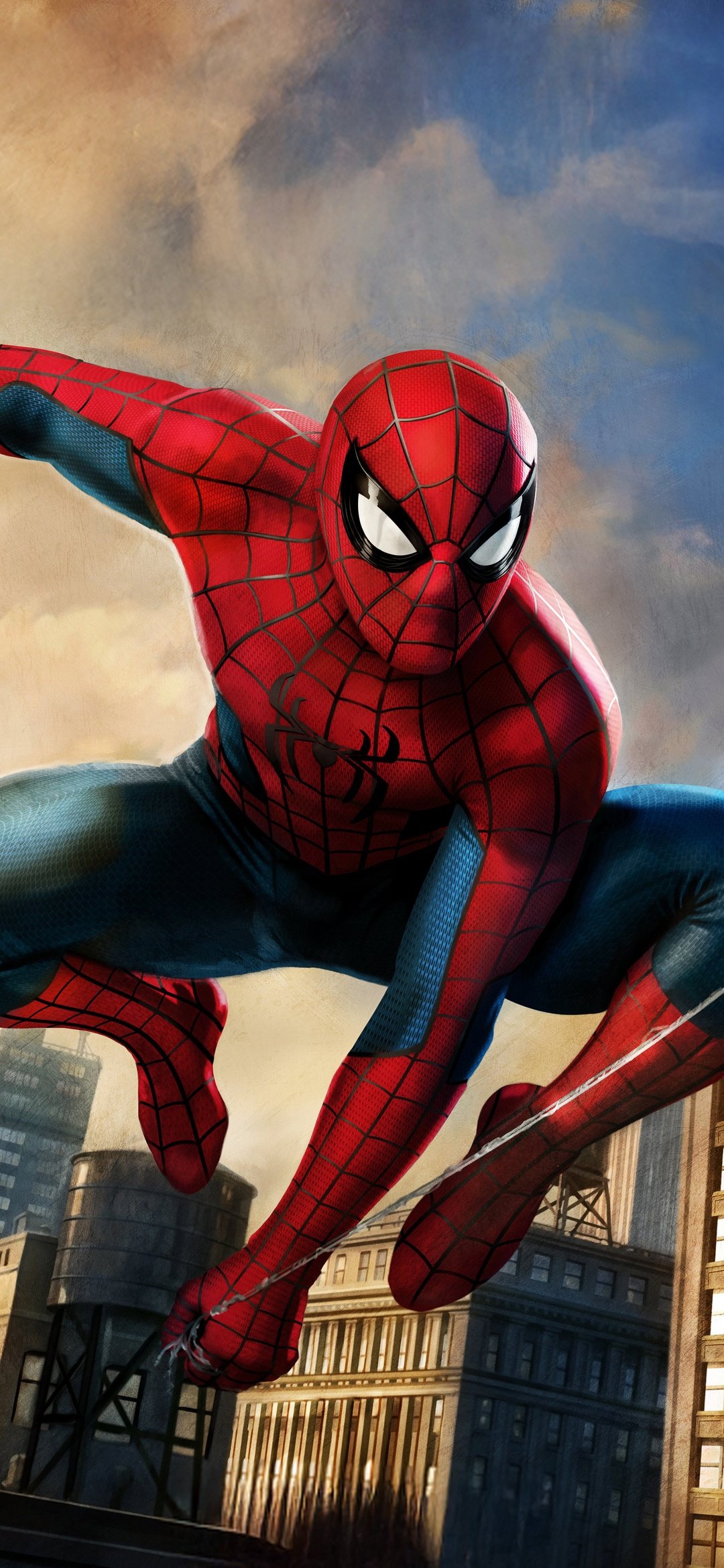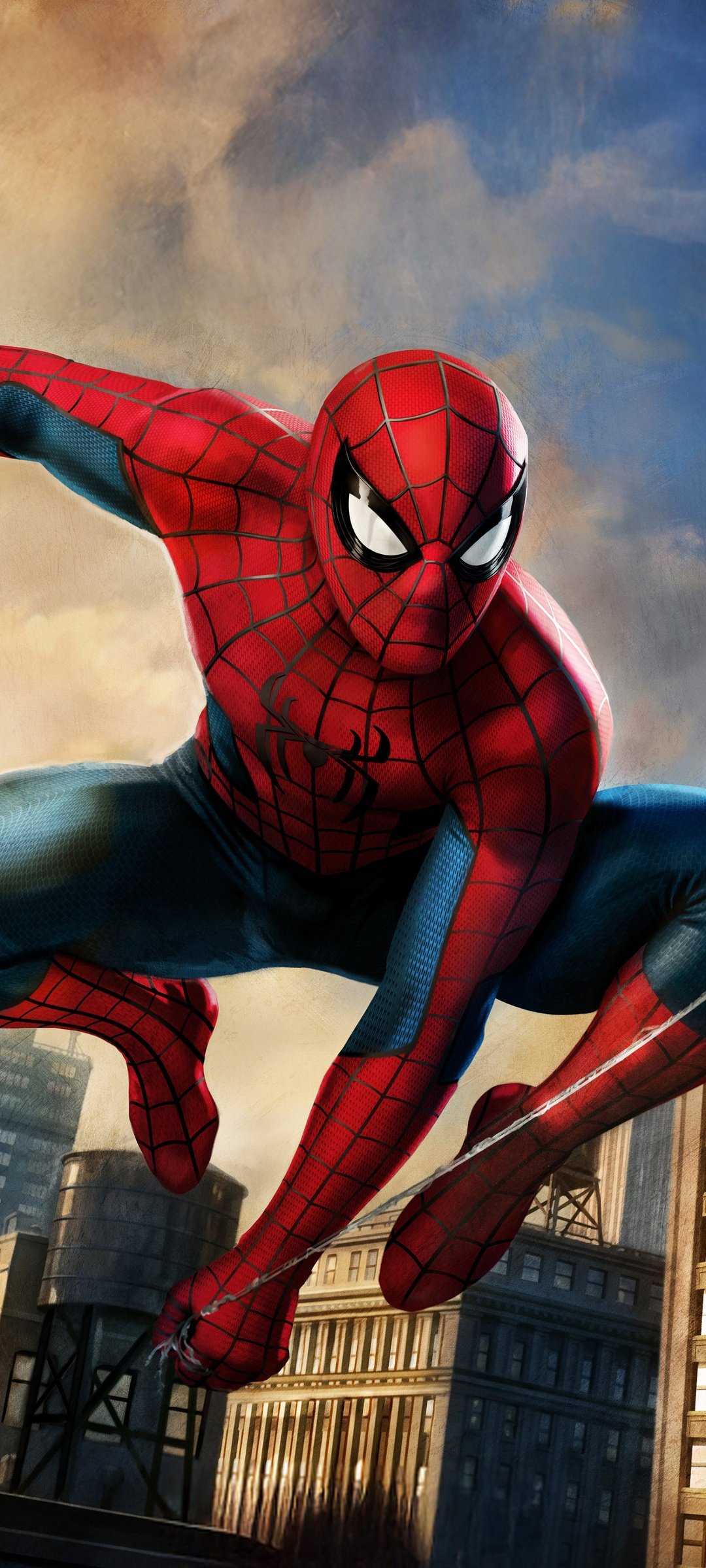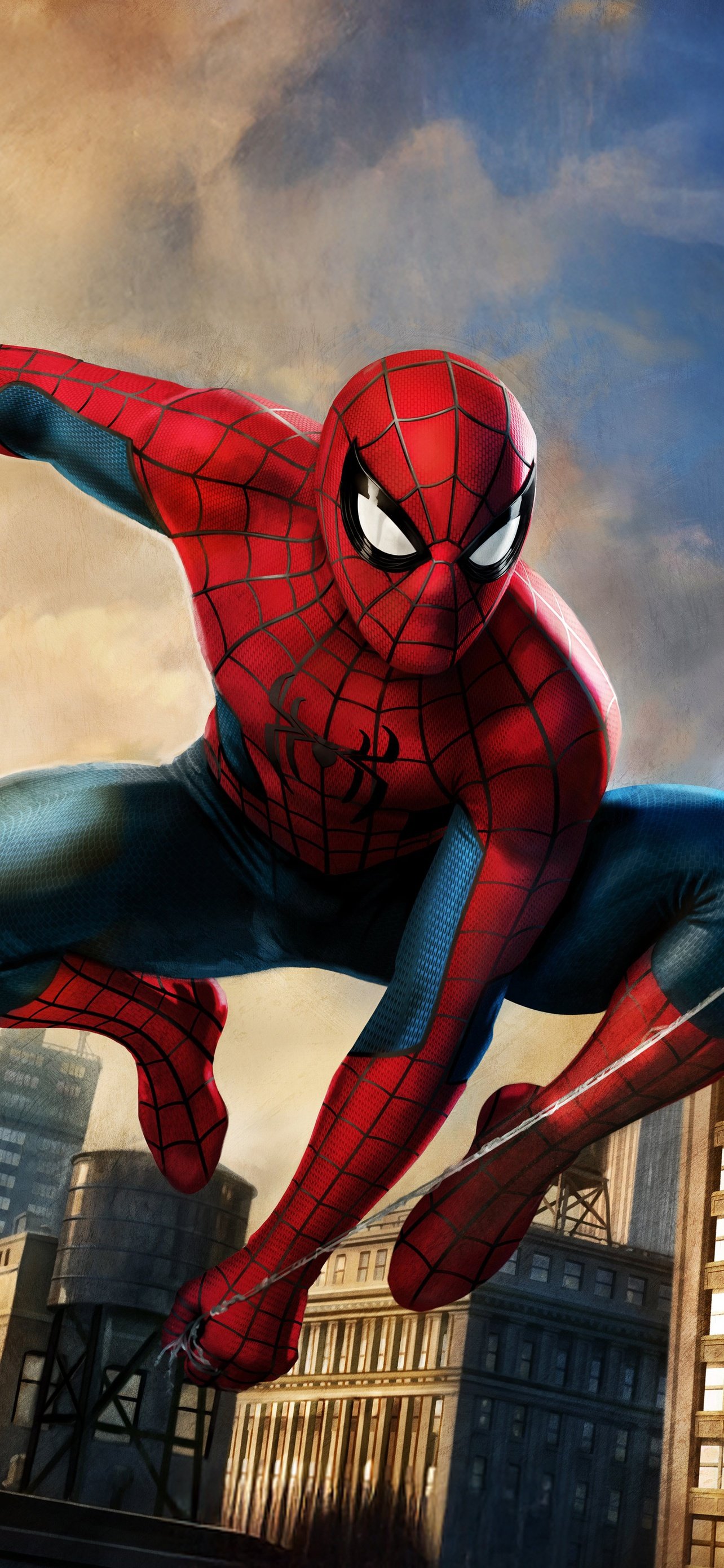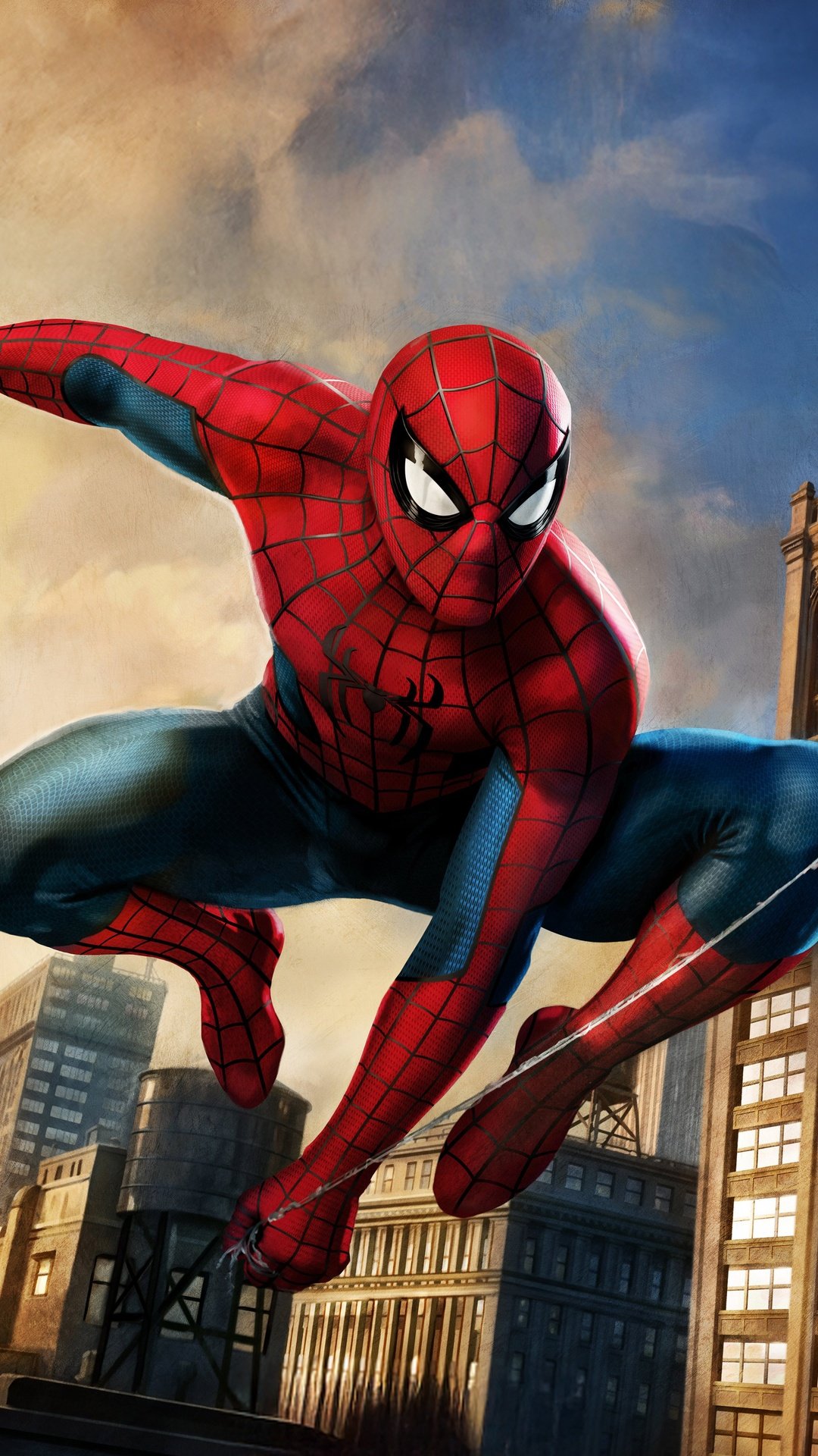 Spider-Man bursts across the skyline in a powerful mid-air pose, webline stretched as the city rises beneath him in golden-hour light. The contrast between warm sunset tones and cool urban shadows gives the scene a cinematic depth, while his iconic suit pops with sharp detail and motion energy. Buildings blur slightly in the background, emphasizing speed, agility, and that signature Spider-Man momentum that never stops.