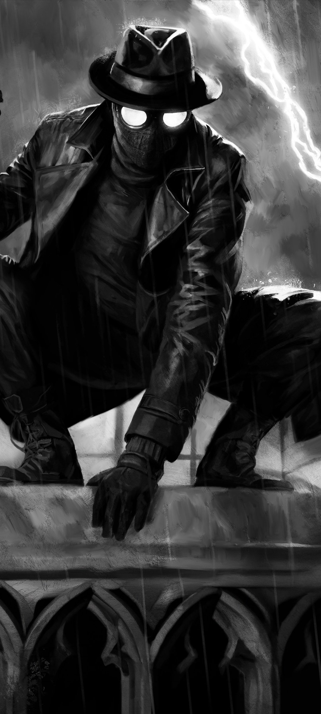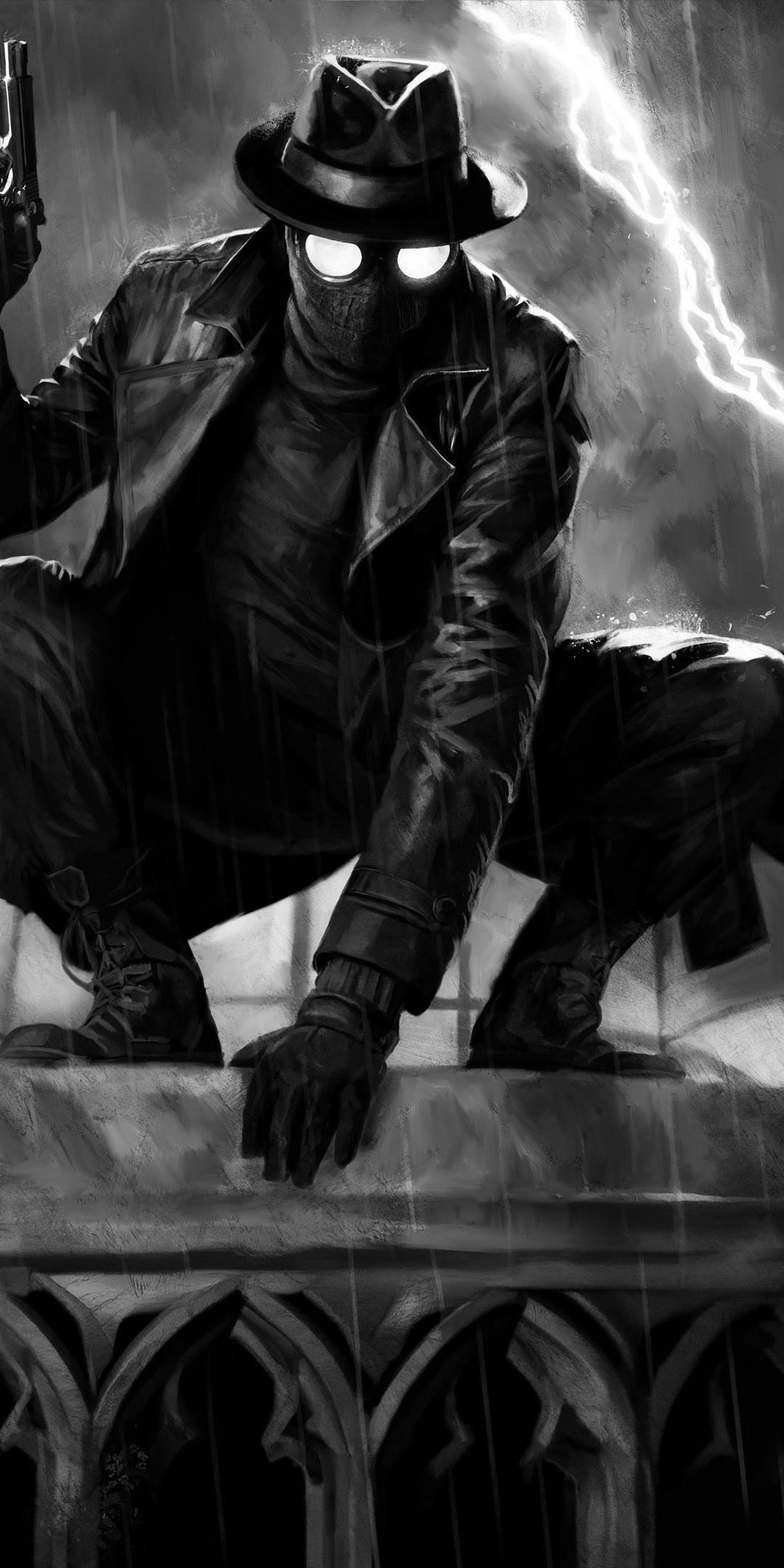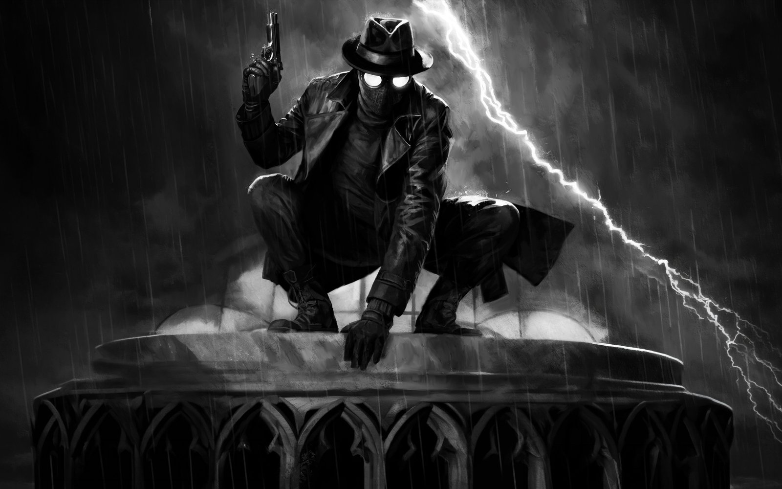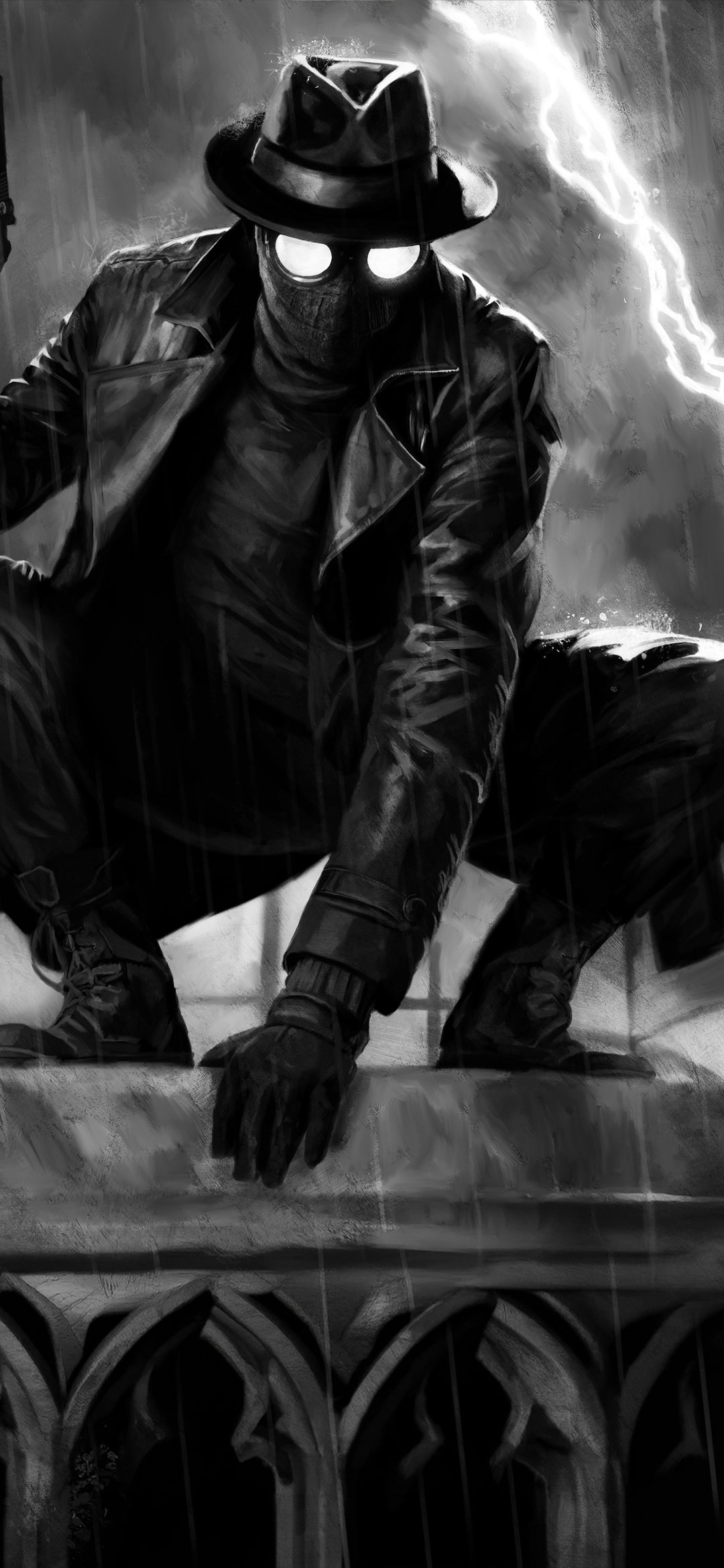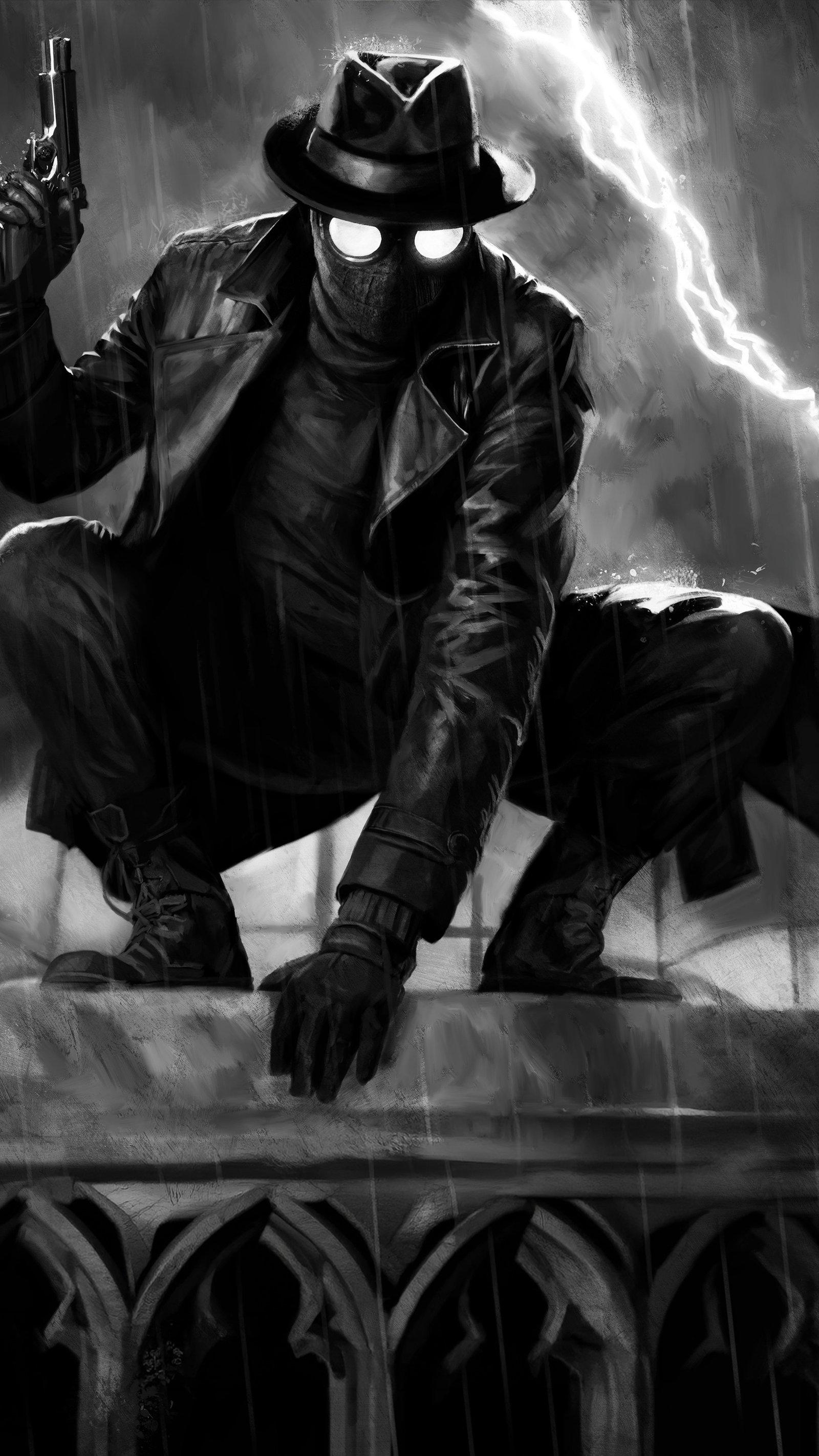 Perched high above the city, Spider Noir crouches in a classic vigilante stance, his glowing eyes cutting through the darkness as rain pours relentlessly around him. A flash of lightning tears across the sky, illuminating the sharp details of his trench coat, hat, and pistol, all rendered in striking black and white contrast. The scene feels frozen in a tense moment before action—dramatic, moody, and charged with silent intensity.