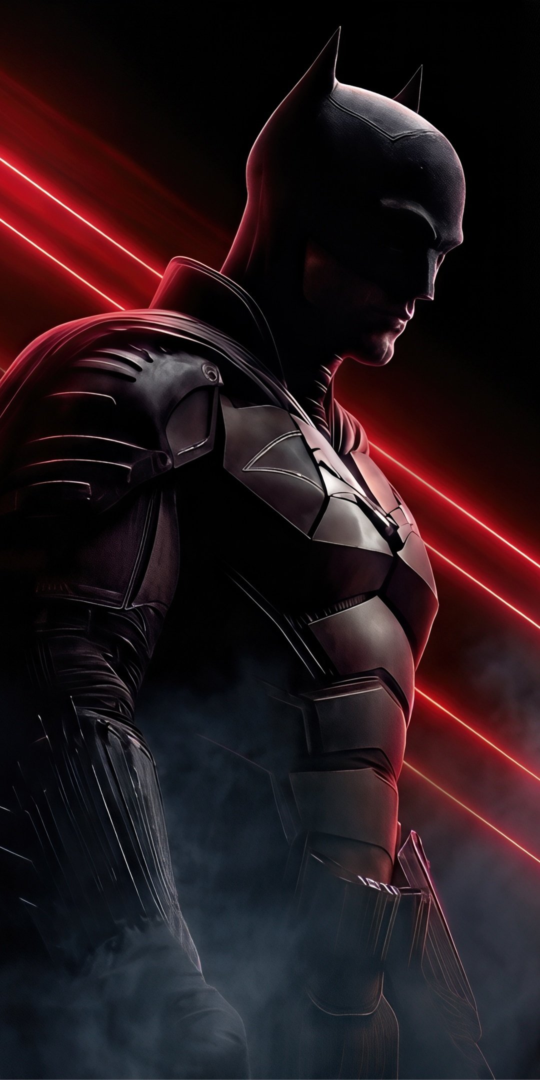 The silhouette of the Dark Knight emerges through smoke and glowing red lines, creating a cinematic scene filled with tension, mystery, and raw vigilante energy.